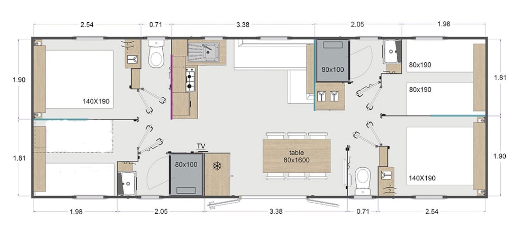 This mobile home is equipped with 4 bedrooms, 2 bathrooms , 2 WC outside the bathroom