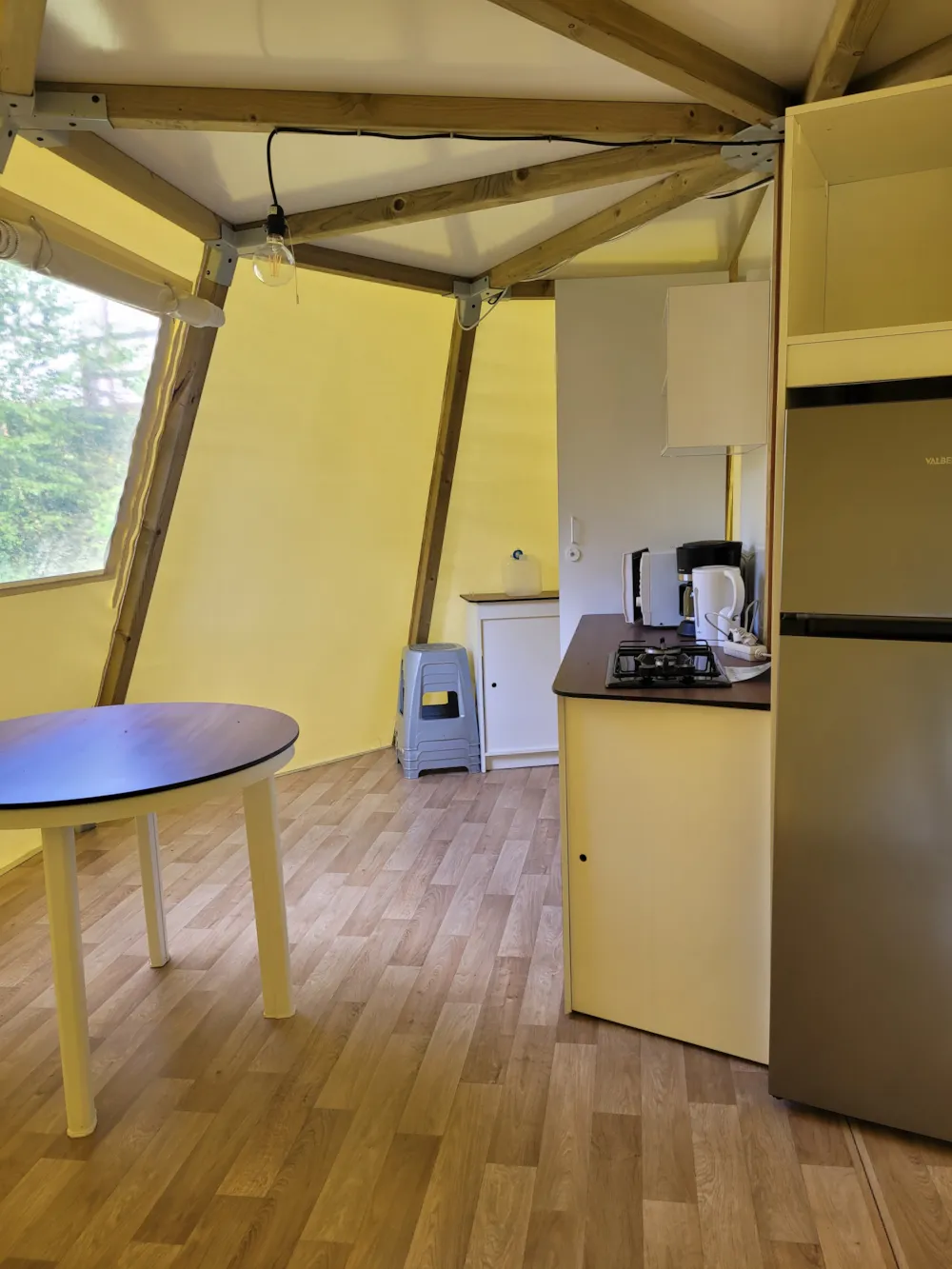 Das Cocosweet ist eine Unterkunft, die zwischen einem Zelt und einem Mobilheim angesiedelt ist. Es verfügt über ein Mobilheim-Chassis, hat aber die Form eines Zeltes! Im Inneren finden Sie den Komfort eines Mobilheims: auf der einen Seite ein Schlafzimmer mit einem Doppelbett, auf der anderen Seite ein Wohnzimmer mit zwei Sitzbänken, die zu zwei Einzelbetten umgebaut werden können. Und in der Mitte befindet sich die Küchenecke mit Kühlschrank, Kochfeld, Mikrowelle und dem notwendigen Geschirr für 4 Personen. Außerdem steht Ihnen eine kleine, mit einer Markise überdachte Terrasse mit Gartenmöbeln zur Verfügung.