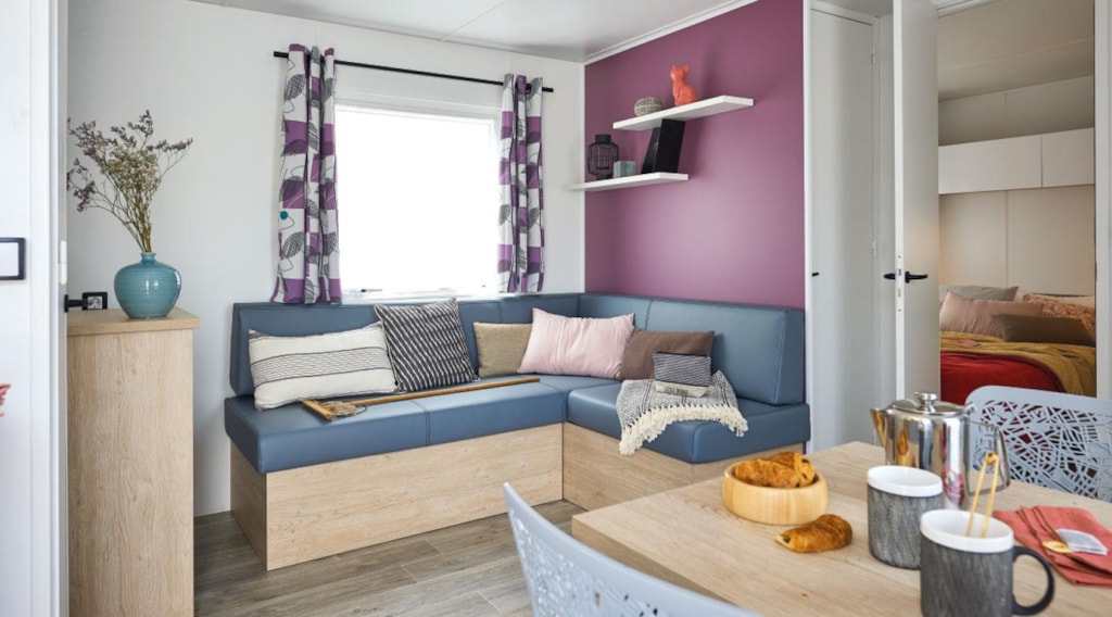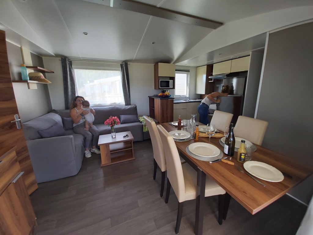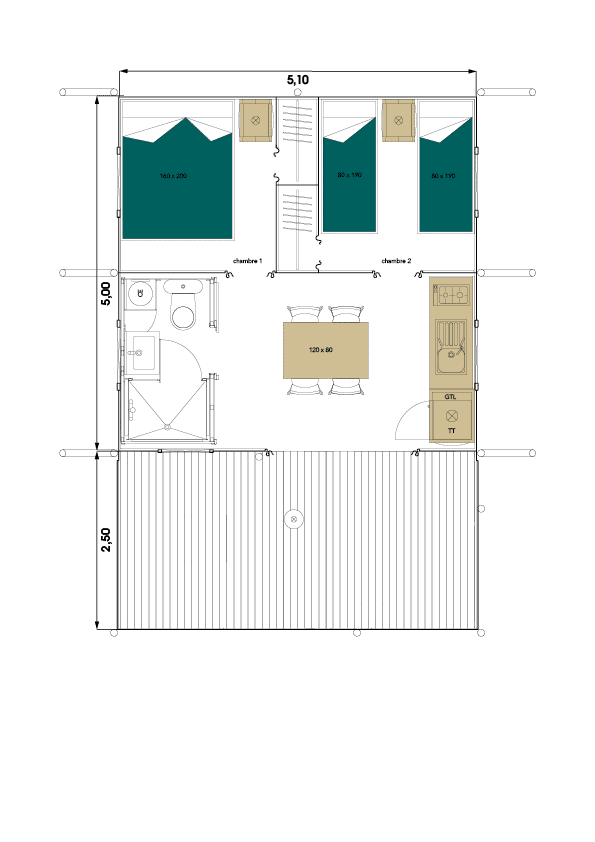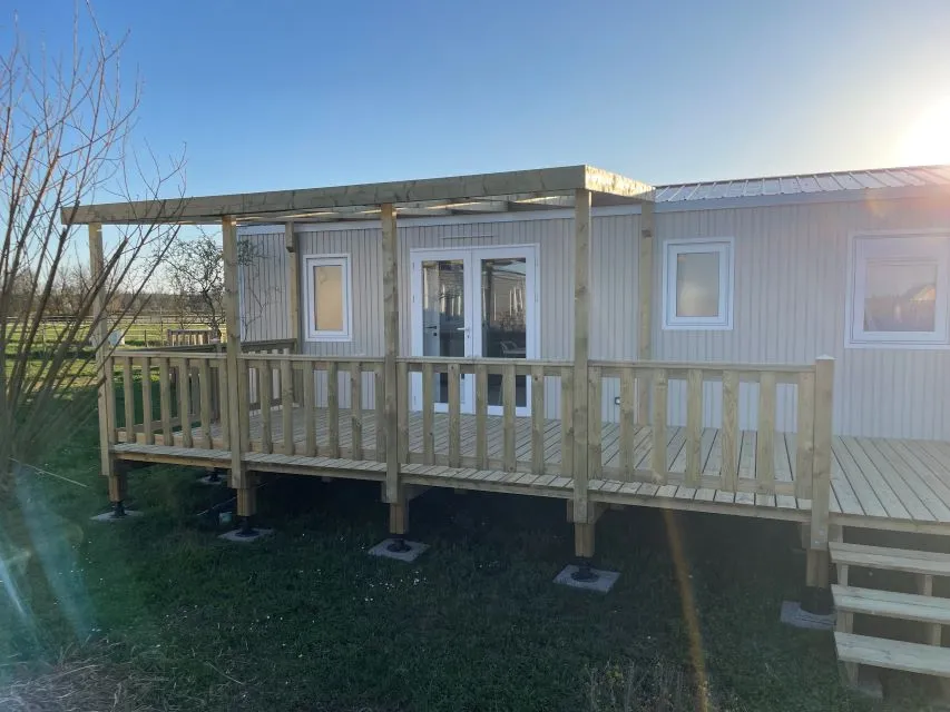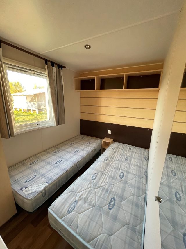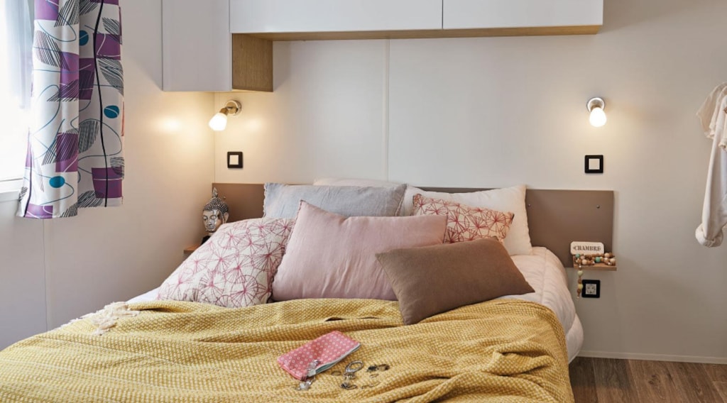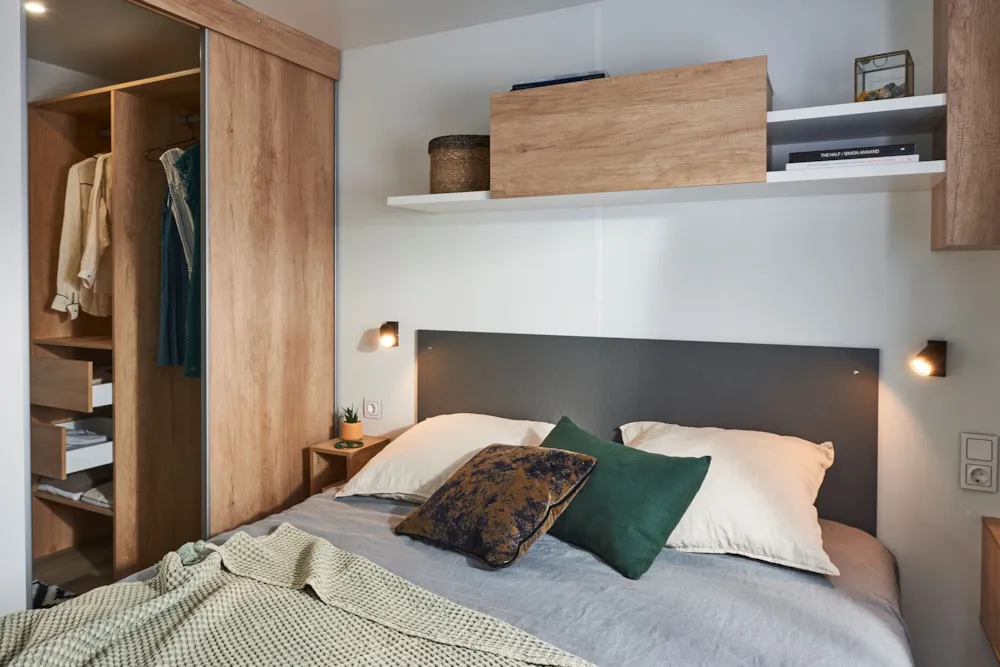 Camp'Hotel ist eine Unterkunft für 2 Personen mit 1 Schlafzimmer, Küche, Bad, WC und überdachter Terrasse. Es gibt 2 camp'hotels in einem Mobilheim und jedes camp'hotel hat einen eigenen Eingang und eine unabhängige Terrasse.