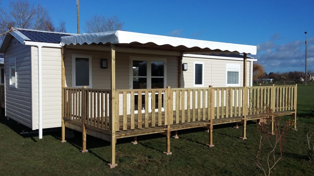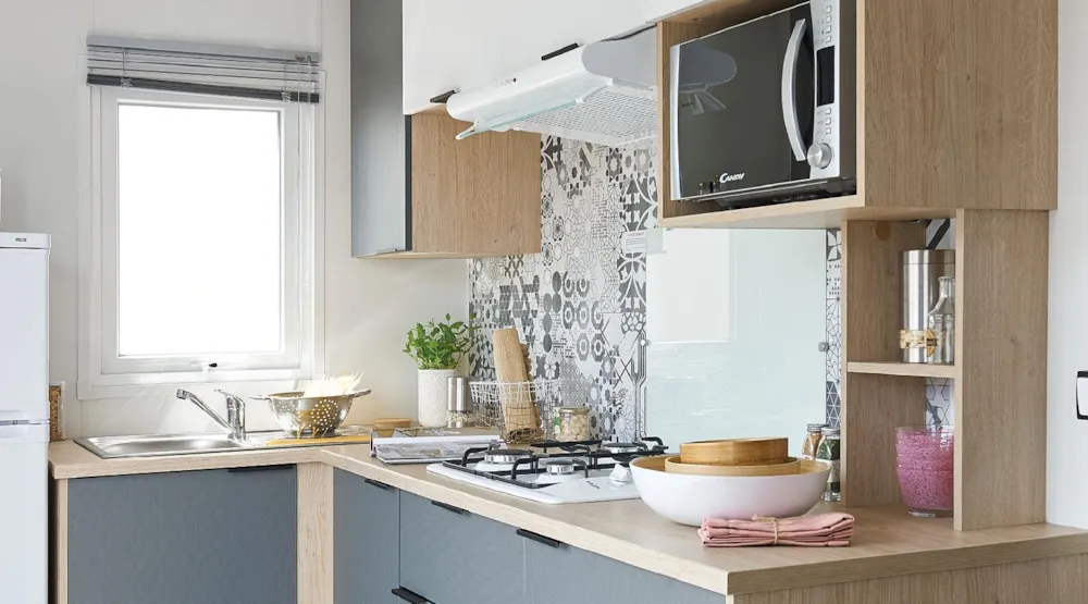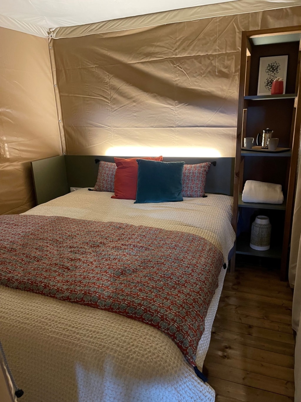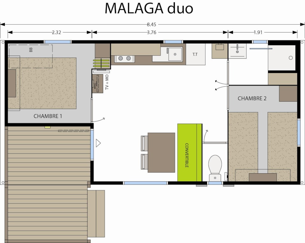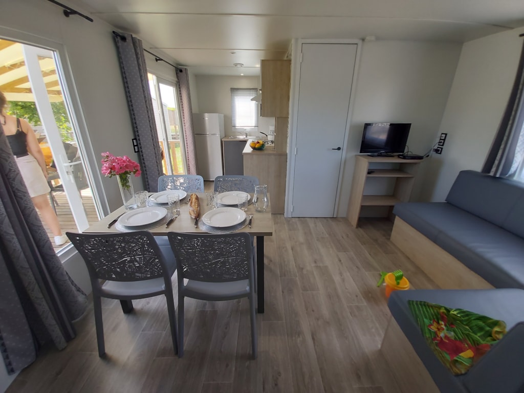Camp'Hotel ist eine Unterkunft für 2 Personen mit 1 Schlafzimmer, Küche, Bad, WC und überdachter Terrasse. Es gibt 2 camp'hotels in einem Mobilheim und jedes camp'hotel hat einen eigenen Eingang und eine unabhängige Terrasse.