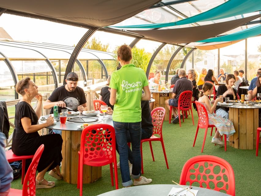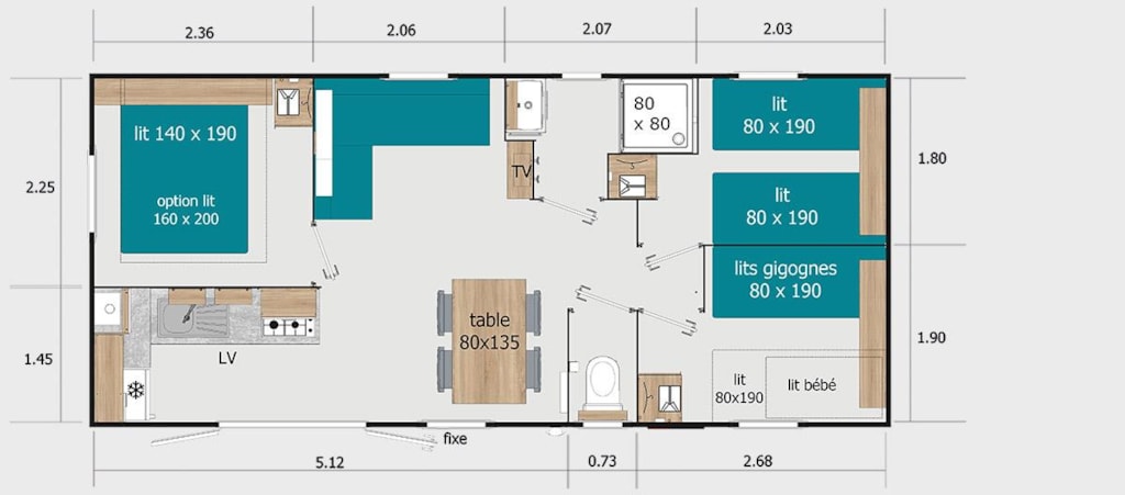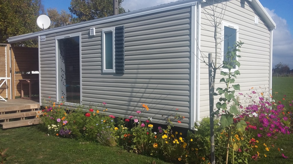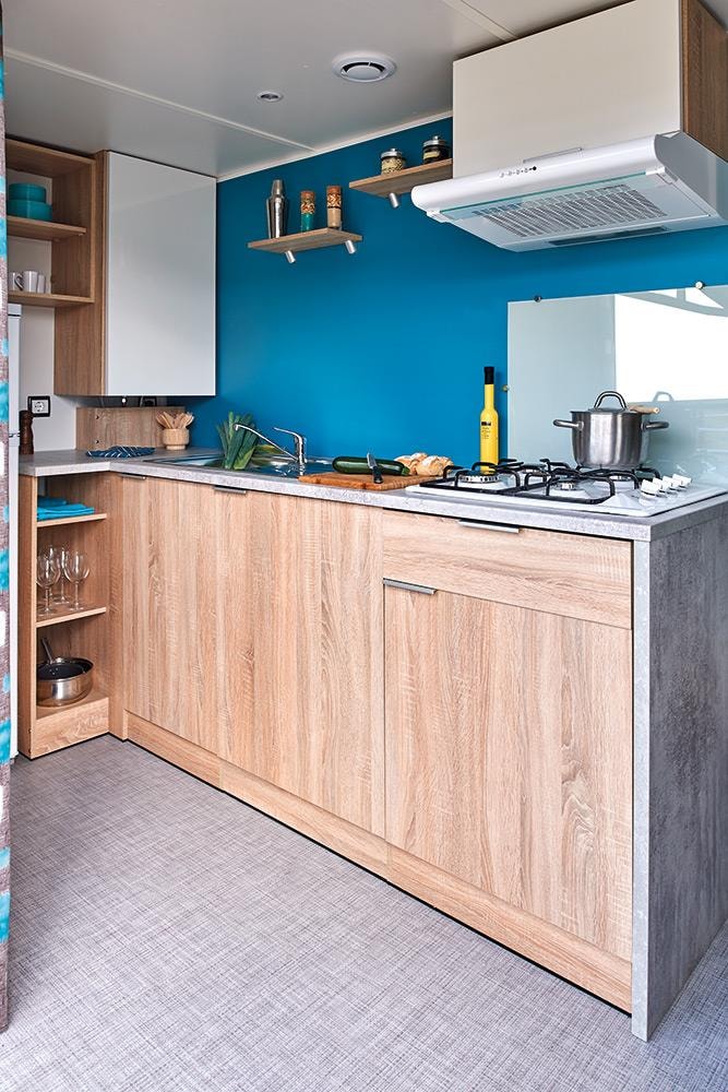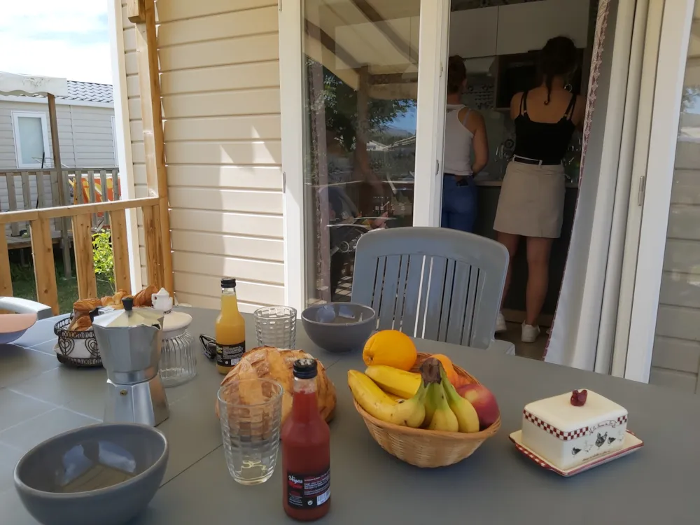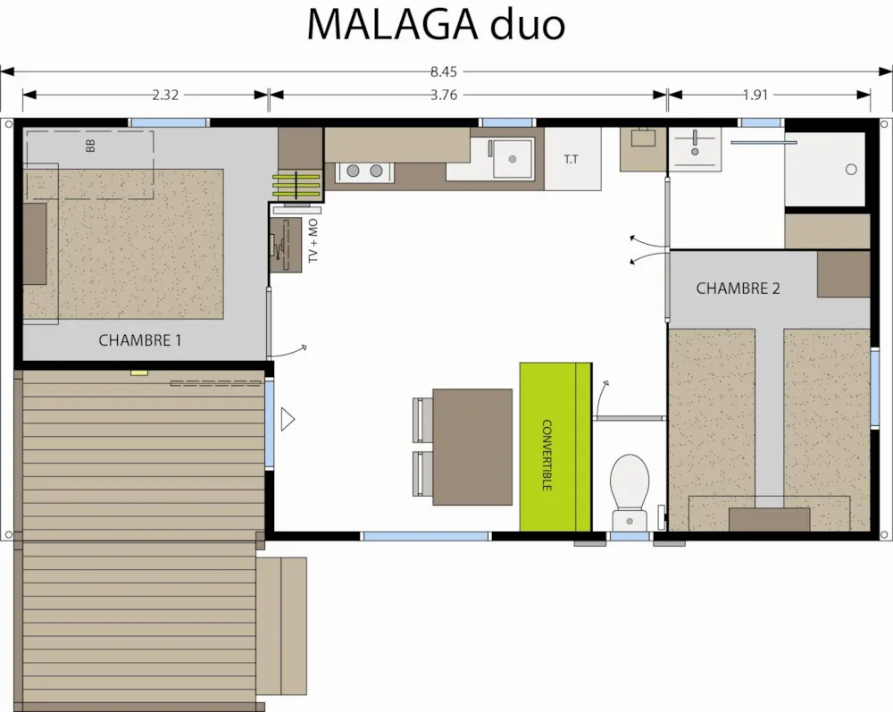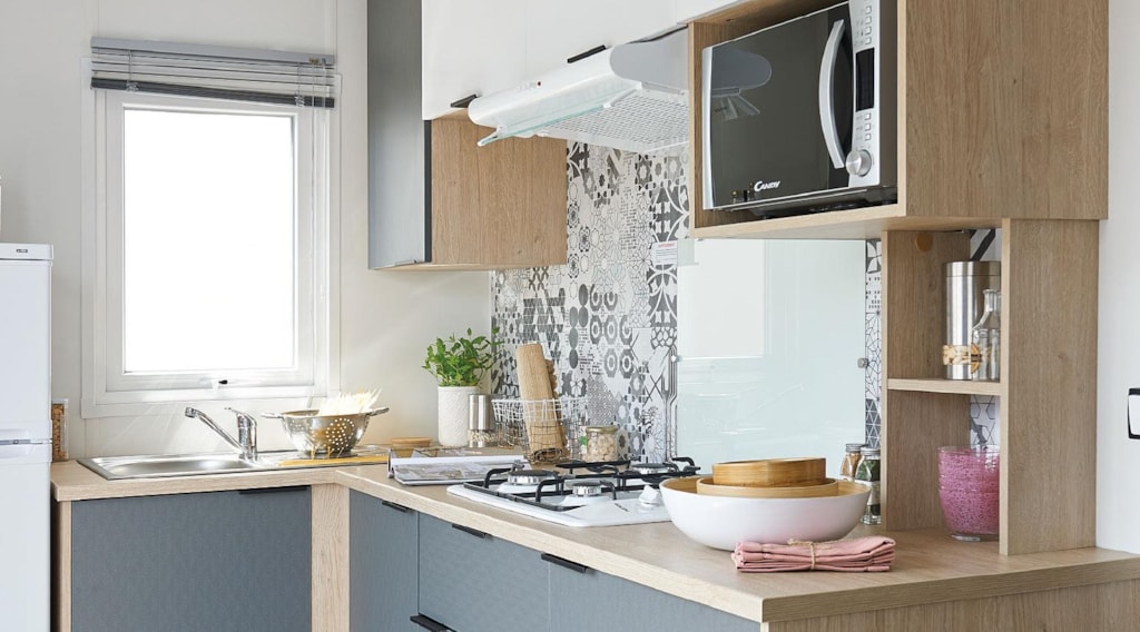 Camp'Hotel ist eine Unterkunft für 2 Personen mit 1 Schlafzimmer, Küche, Bad, WC und überdachter Terrasse. Es gibt 2 camp'hotels in einem Mobilheim und jedes camp'hotel hat einen eigenen Eingang und eine unabhängige Terrasse.