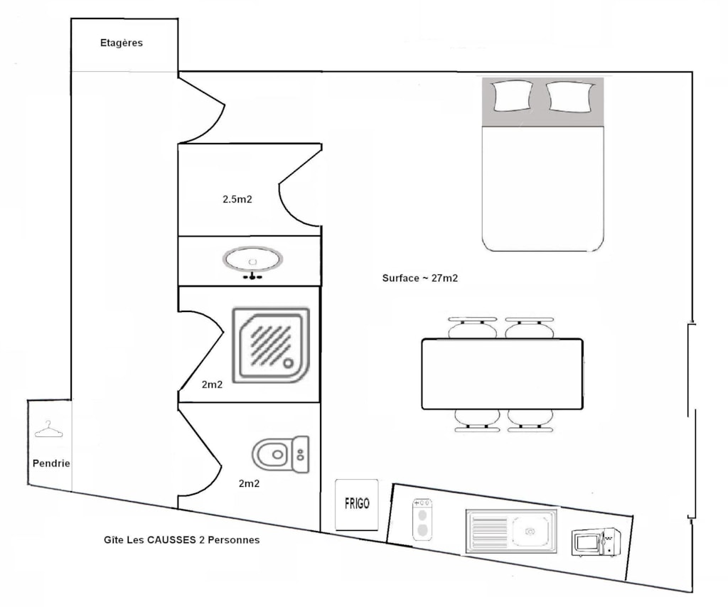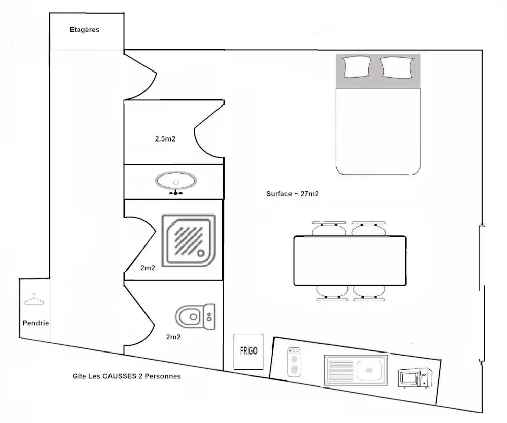 Studio with a small kitchen corner ( 2 electric stoves , fridge with freezer, micro-wave oven, electric coffee-maker) with a meal counter and a double bed. A bathroom with a separate shower, a separate WC, a terrace with its outdoor furniture. This apartment is rented with kitchen utensils, blankets and pillows. Only sheets, pillowcases, table linen and towels are not provided. Possibility to rent sheets.