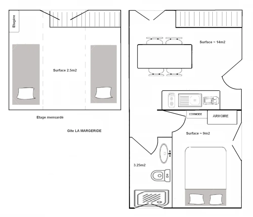La Margeride Apartment for 2 to 4 people Main room with a kitchenette ( 2 electric stoves , fridge with freezer, micro-wave oven, electric coffee-maker) with a meal counter A bedroom with a double bed and a wardrobe A bedroom with 2 single beds A shower room with sink and WC A large terrace with its outdoor furniture This apartment is rented with kitchen utensils, blankets and pillows. Bed sheets and pillow cases are not provided. Possibility to rent sheets.