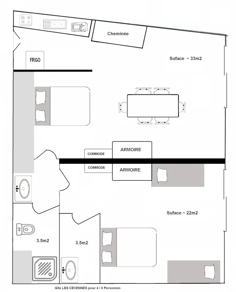The Cevennes Apartment for 4 to 6 people Main room with a kitchenette ( 2 electric stoves , fridge with freezer, micro-wave oven, electric coffee-maker) with a meal counter and a double bed and a single bed. A room with a double and a single bed A shower room with sink and WC A large terrace with its outdoor furniture This apartment is rented with kitchen utensils, blankets and pillows. Bed sheets and pillow cases are not provided. Possibility to rent sheets.
