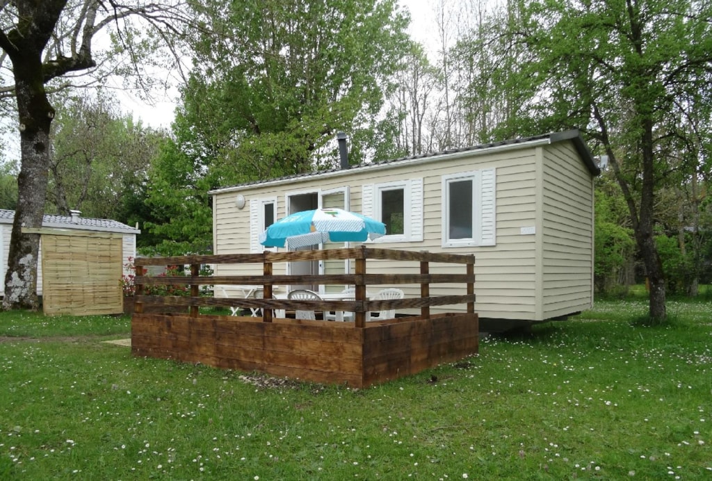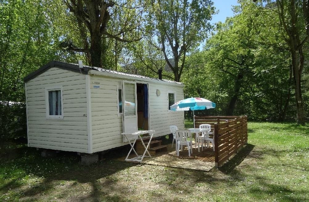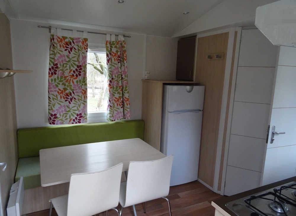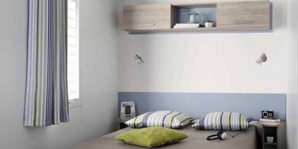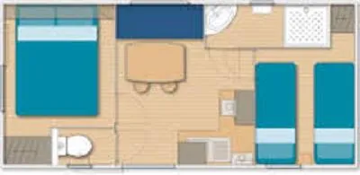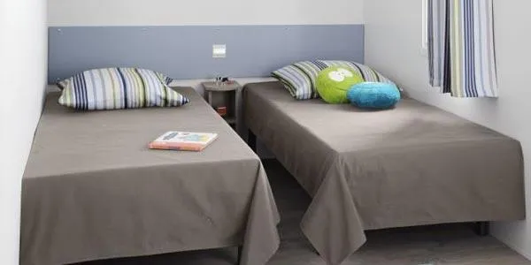 The TITANIA 2014 is a Mobile home for 4 people in 22m ² It consists of: - A kitchen (stainless steel plate 4 gas burners, refrigerator-freezer, microwave, coffee maker, stainless steel sink, crockery and complete accessories) - A parents' room with a bed 140 x 190 cm. - A children's room with 2 beds 70 x 190 cm - A living room with large sofa - TV - Bathroom and WC INDEPENDENT - A garden table The beds are equipped with pillows and blankets or duvets and mattress protectors. Bed sheets and pillow cases are not provided. Possibility to rent sheets.