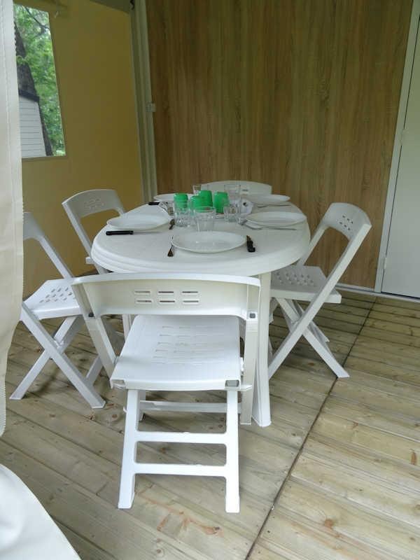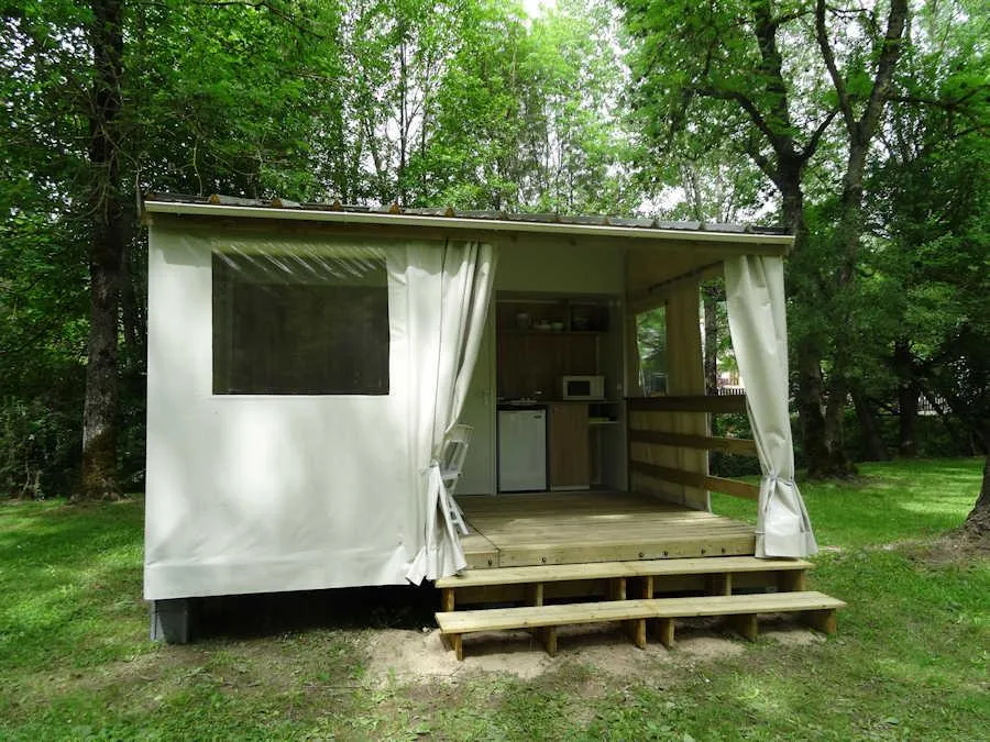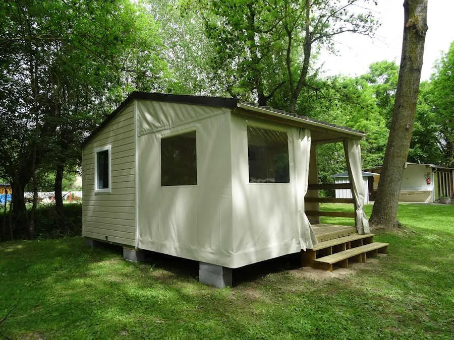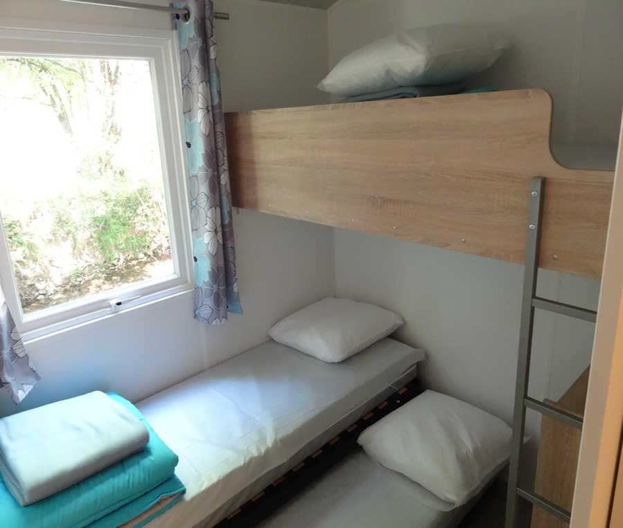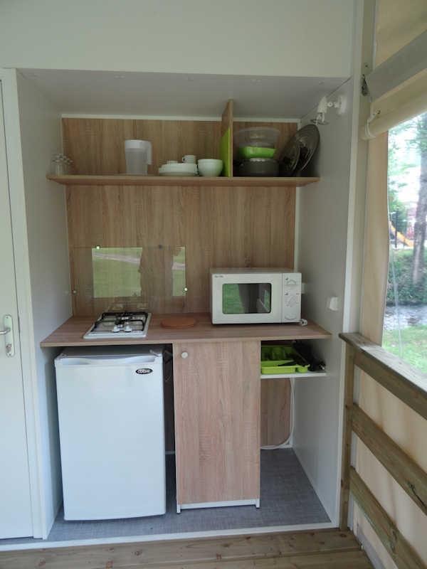 TITHOME 4 People and 1 child For budget holidays and lovers of top-class camping - don't delay, choose the Tithome for 4 People and 1 child,without sanitary, a new generation cottage, combining the qualities of a tent with those of a cottage. With an area of 21m², this campsite rental is the ideal place to spend great holidays in the open air. It consists of : - A covered wooden terrace that can be opened or closed at your convenience with table and chairs and a kitchenette ( hob - dishwasher - microwave - fridge - gas cooker / 2 lights - dishwasher, electric coffee machine). - A parents' bedroom with double bed 140 x 190 cm. - A children's room with single bed 70 x 190 cm + loft bed 70 x 190 cm and the possibility of a third trundle bed 70 x 190 cm . The beds of both chambers are equipped with pillows and blankets or duvets and mattress protectors. Bed sheets and pillow cases are not provided. Possibility to rent sheets.