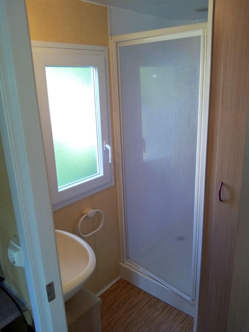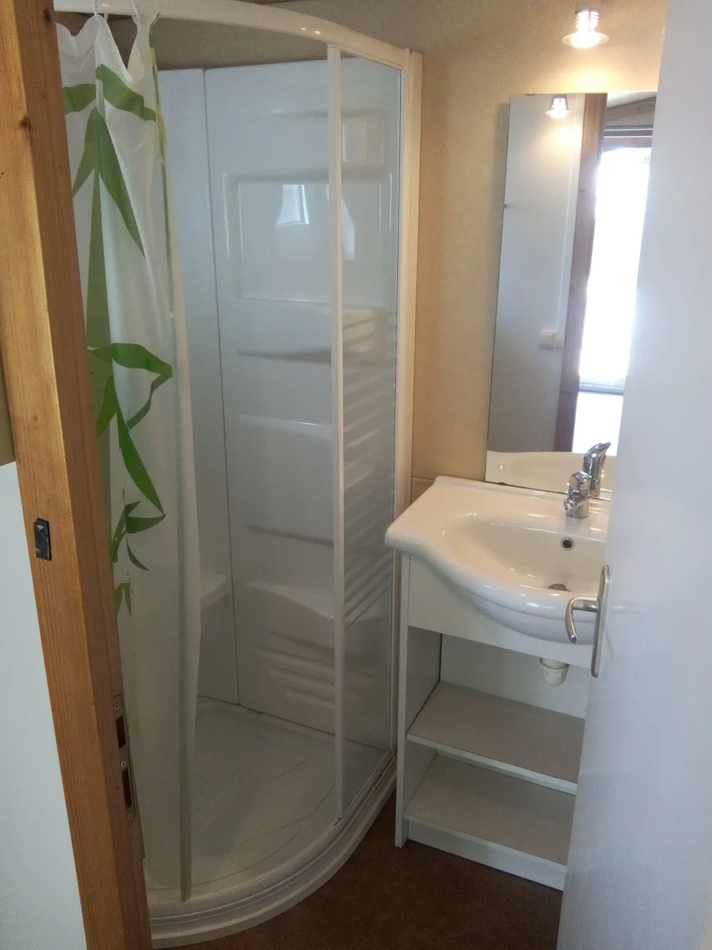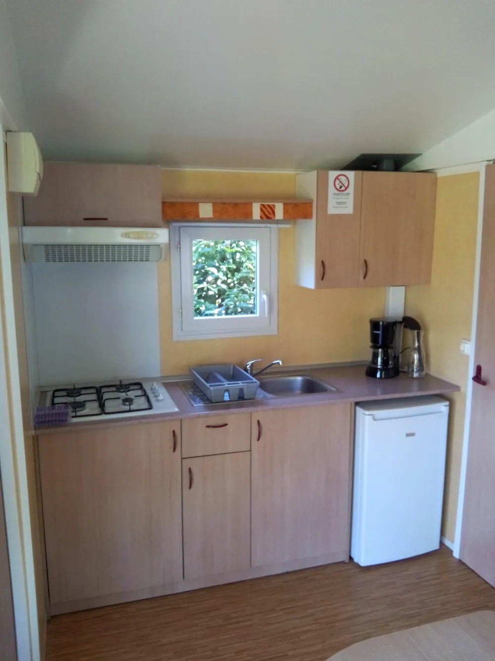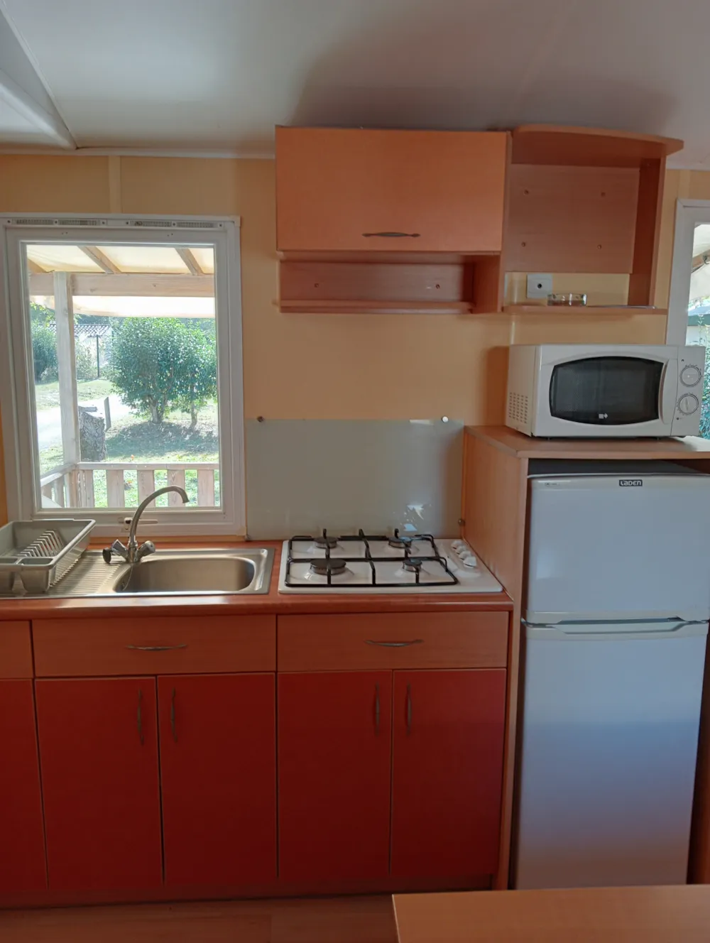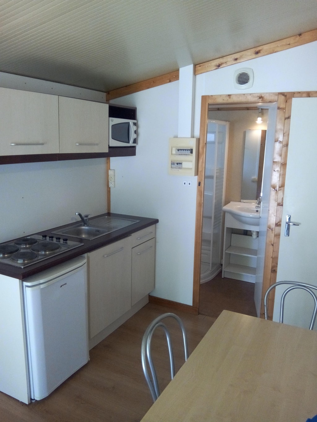 1 Schlafzimmer mit doppeltes Bett und 1 Schlafzimmer mit 2 Stockbetten und 1 Einzelbett von 80 cm Breite. Bettzeug : rechteckige Kopfkissen, 1 Decke pro Bett, Matratzenschoner, Matratze. Küche Kompaktküche mit 2-Platten-Gaskocher, Spülbecken, Abtropfbecken, Kühlschrank, 1 Küchenschrank mit Ober- und Unterteil, Geschirr für 5 Personen. Fließend heißes und kaltes Wasser. Beleuchtung und elektrische Anschlüsse. Die Unterbringung kann nicht geheizt werden. Sanitäreinrichtungen Sanitärkabine mit Dusche, Waschbecken und WC. Zusätzliche Ausstattung Vordach außen.