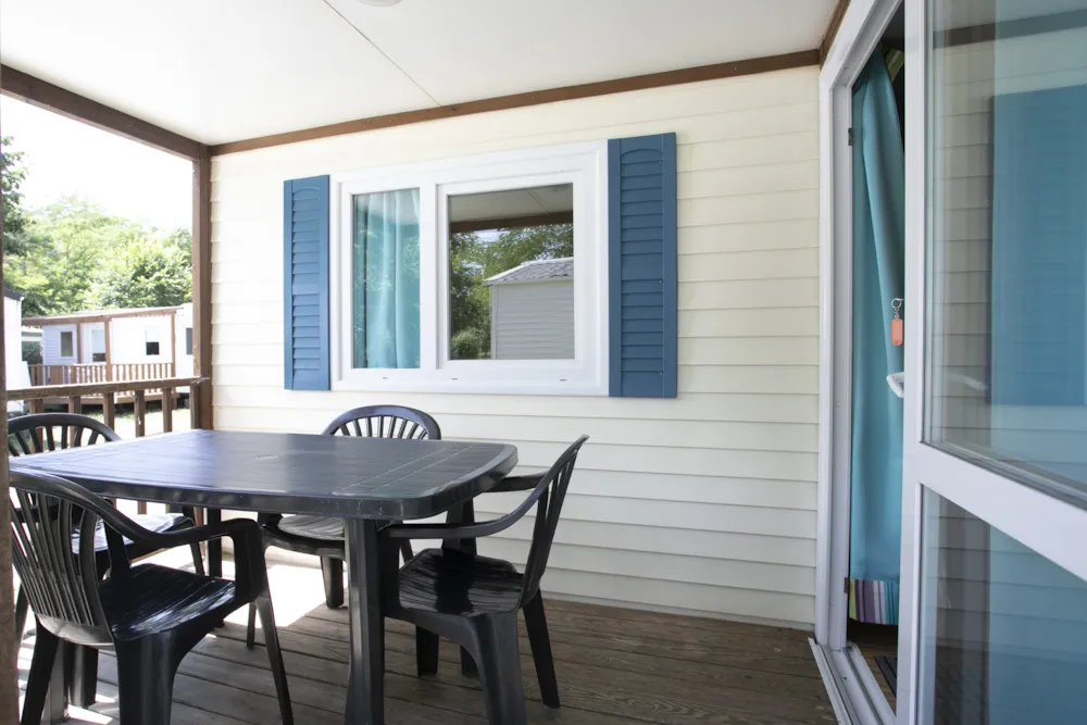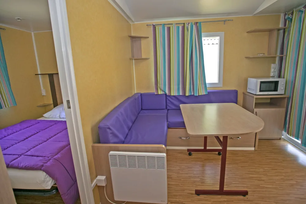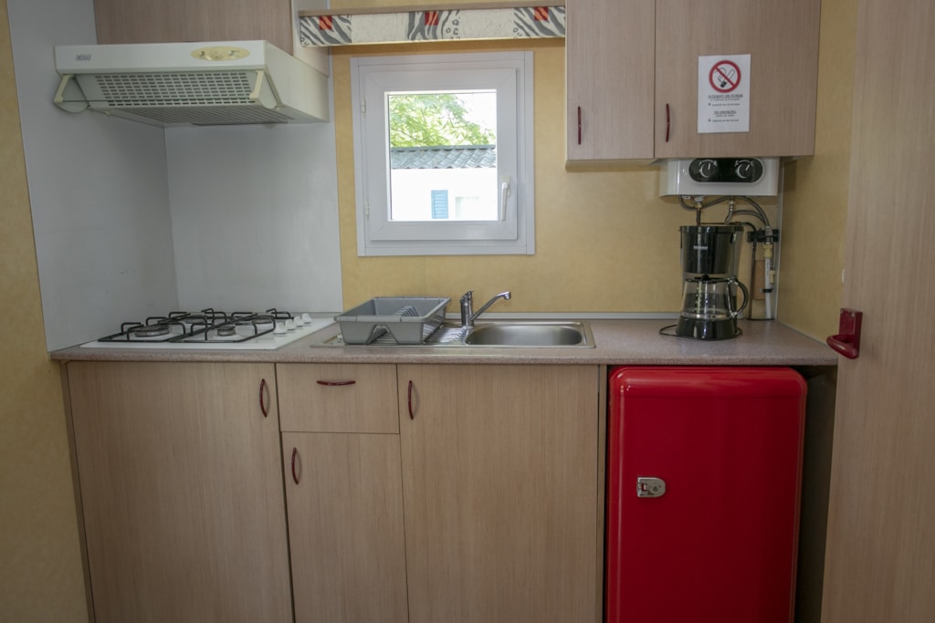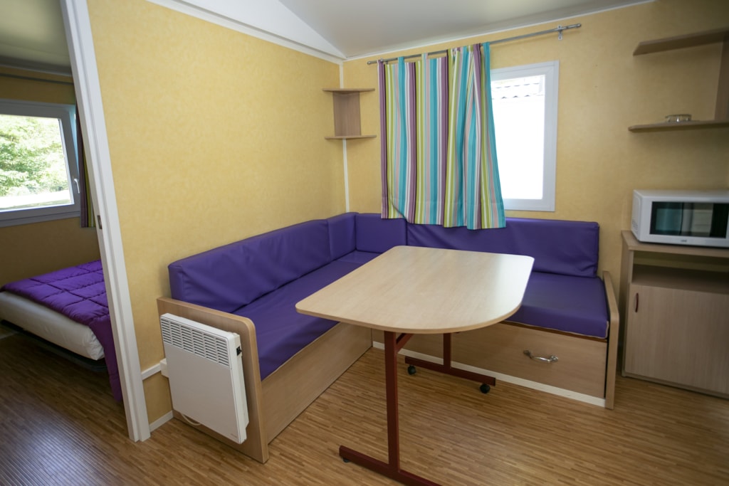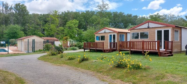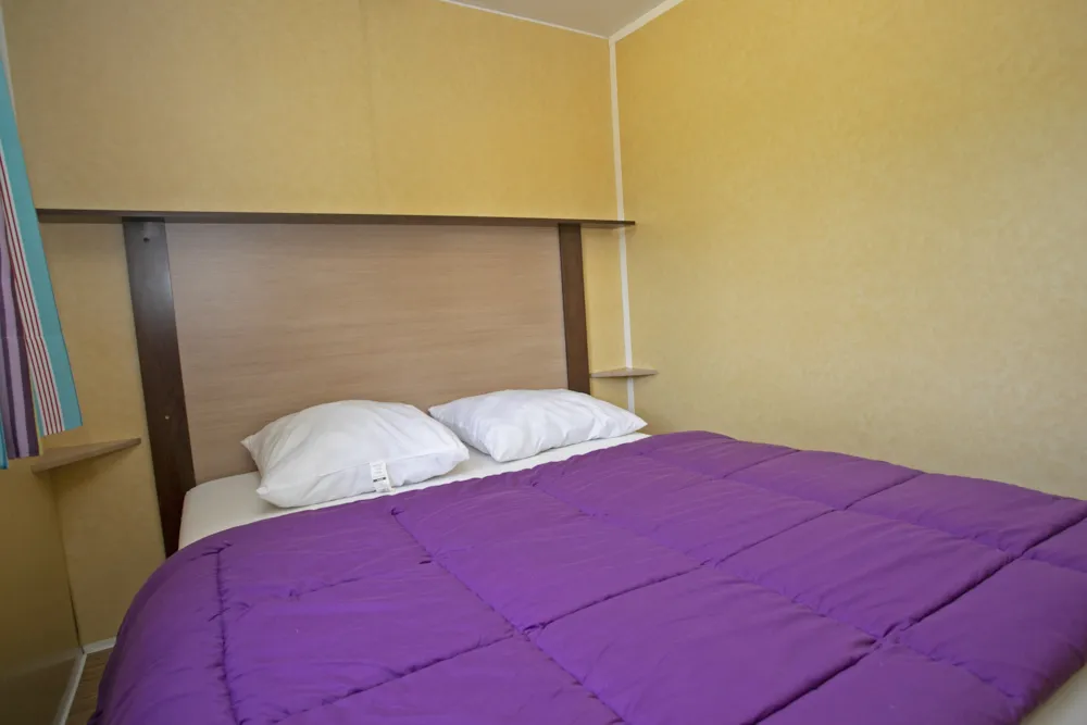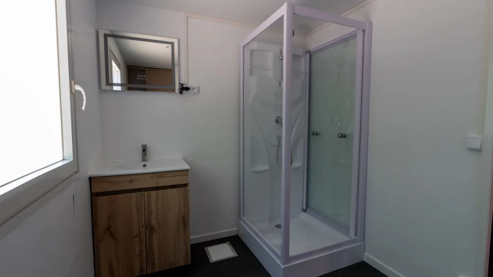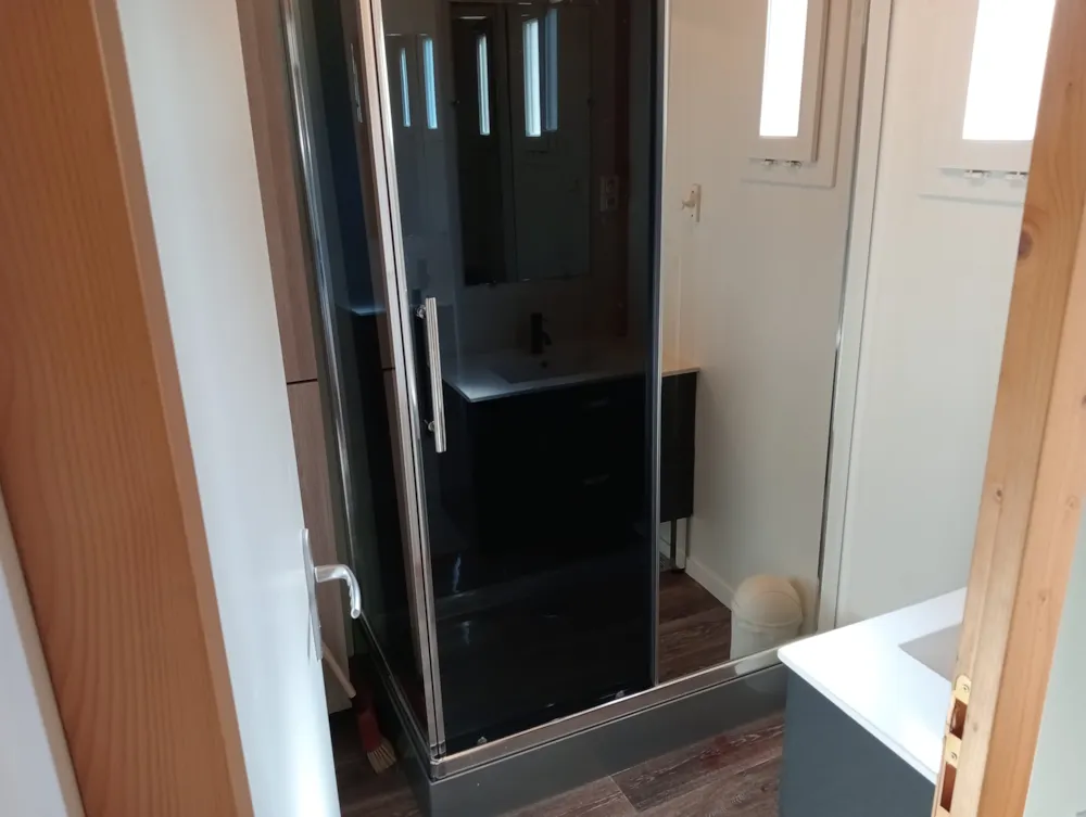 Chalet de 21m² pour 4 personnes. Location d'ancienne génération à l'équipement basique au tarif à peine plus élevé qu'un emplacement camping. Composé de 2 chambres: 1 avec 1 lit double et 1 avec 2 lits simples. Salle de bains avec douche, lavabo et toilettes. Séjour avec coin cuisine équipée d'un frigidaire, plaques de cuisson, micro-ondes, cafetière et kit vaisselle. Terrasse extérieure avec salon de jardin et étendoir à linge.