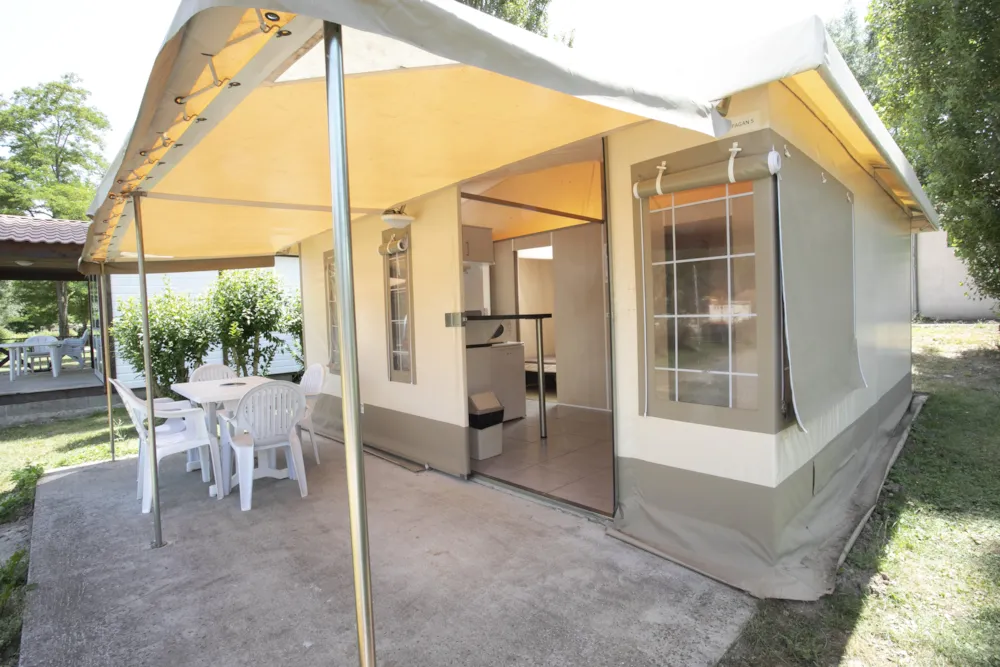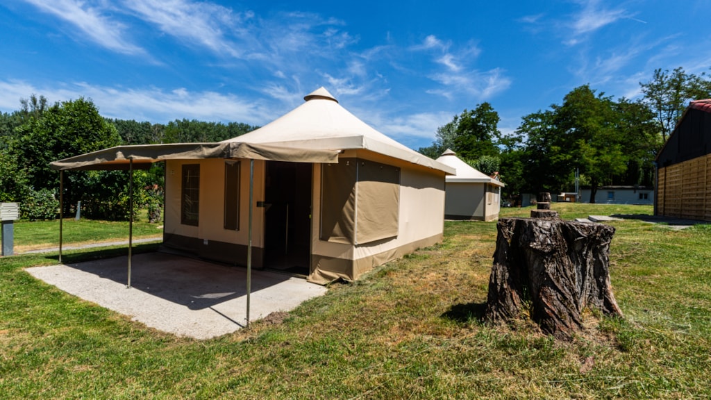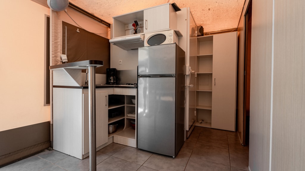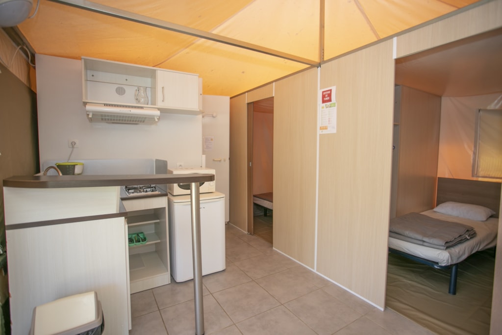 Cette tente meublée de 20 m² dispose de 2 chambres ( 1 avec 1 lit double et l'autre avec 2 lits simples) un coin cuisine sans évier avec frigo, plaques de cuisson, cafetière et micro ondes. Pas de toilettes ni de douche dans la location, il faut utiliser celles du camping qui sont à proximité. La location dispose également d'une terrasse en bois avec mobilier de jardin et auvent.