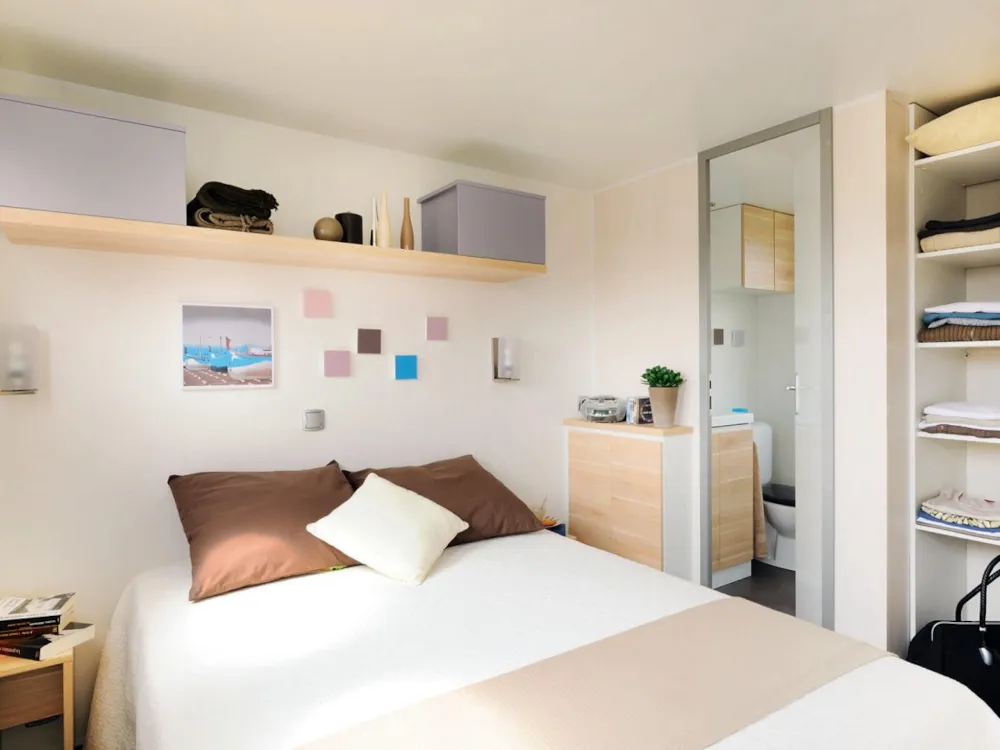 Cottage de 25m² pour 4 personnes. Composé de 2 chambres: 1 avec 1 lit double et 1 avec 2 lits simples. Séjour avec banquette convertible pour un couchage d'appoint de 2 places. Coin cuisine avec plaques de cuisson, frigidaire, micro-ondes, cafetière et kit vaisselle. Terrasse extérieure couverte avec salon de jardin et étendoir à linge.