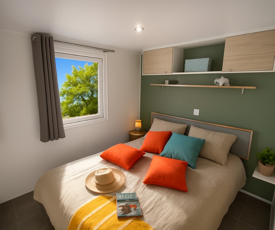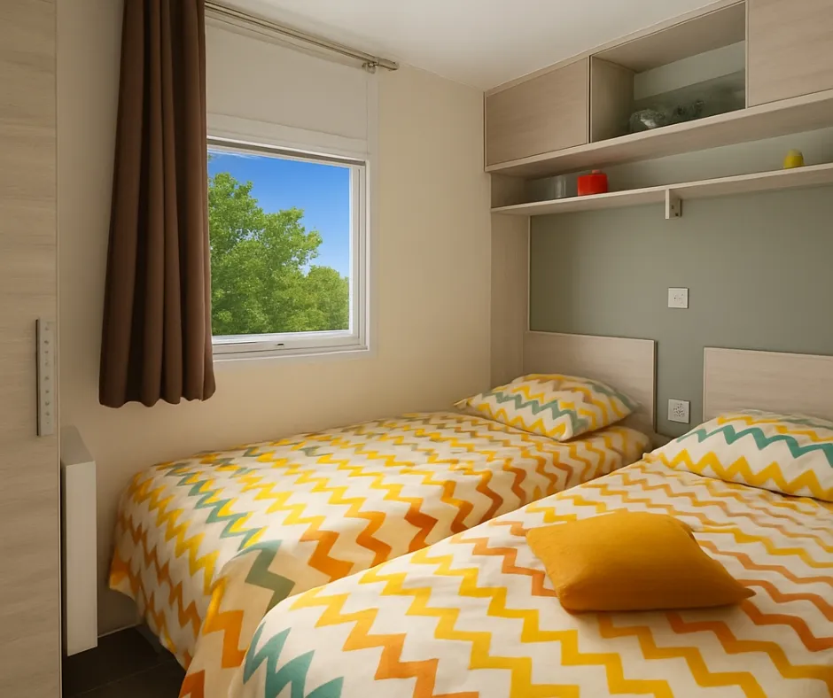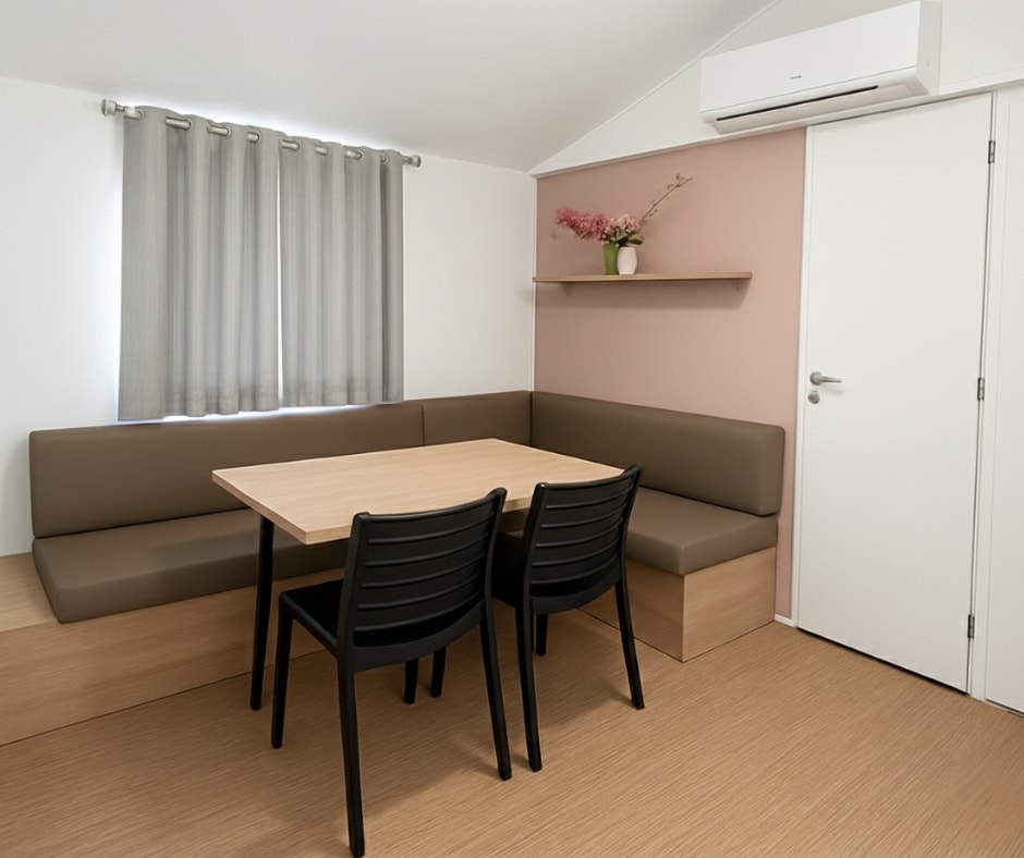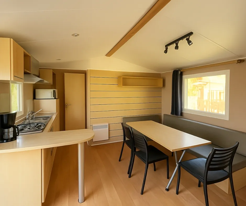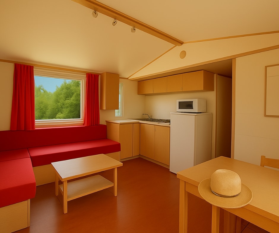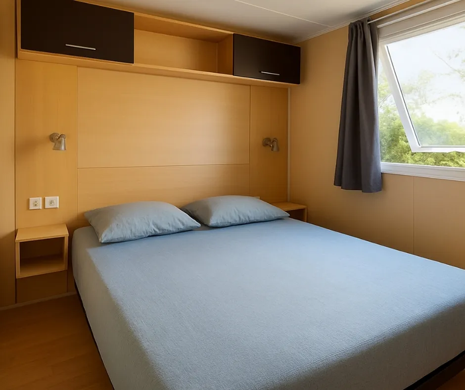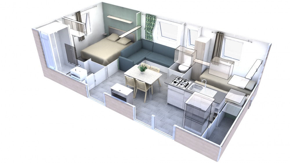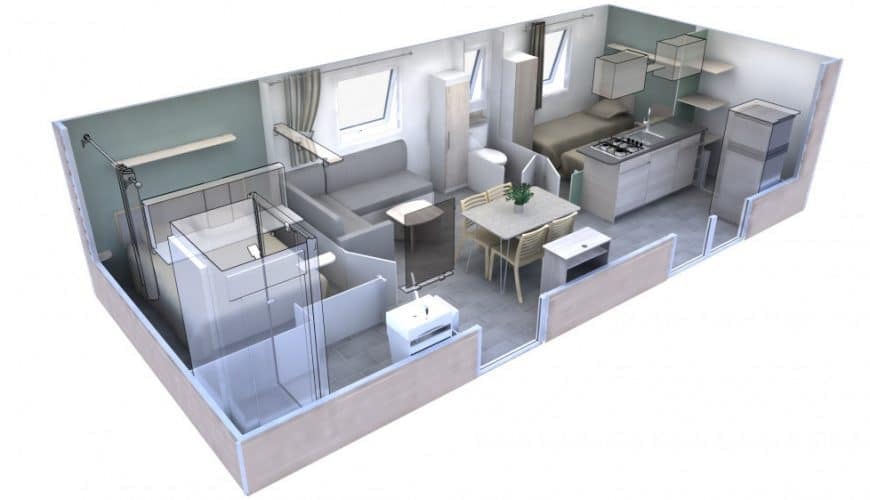 Die Mobilheime Cottage 3 VIP gehören zu unserer Luxusklasse. Sie sind mit einer umkehrbaren Klimaanlage und einem Flachbildfernseher ausgestattet. Die Cottage 3 VIP verfügen über eine privilegierte Lage und ein erstklassiges Ausstattungsniveau. Sie können bis zu 6 Personen beherbergen. Bettwäsche nicht inbegriffen.