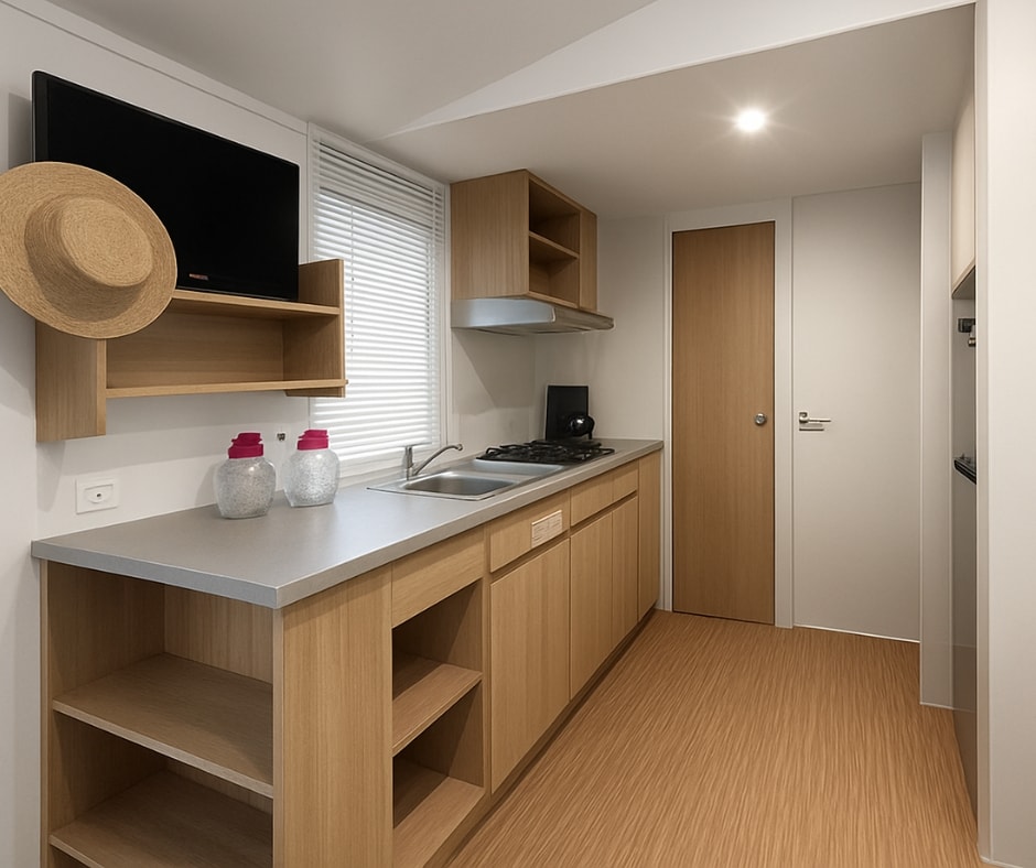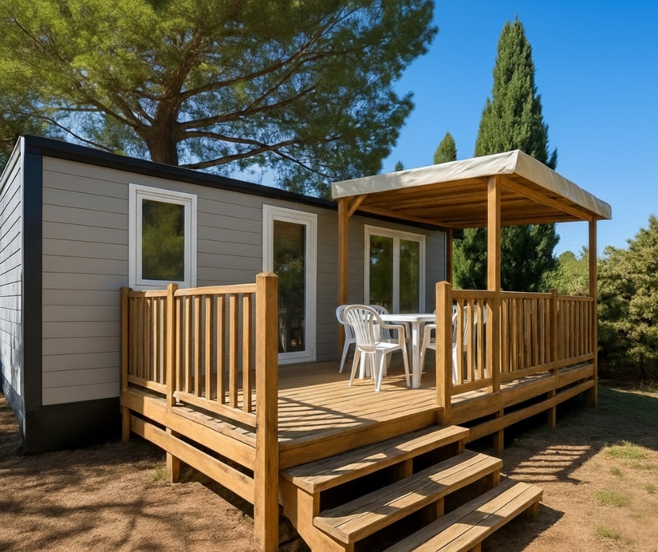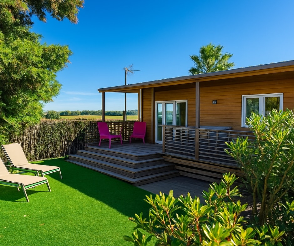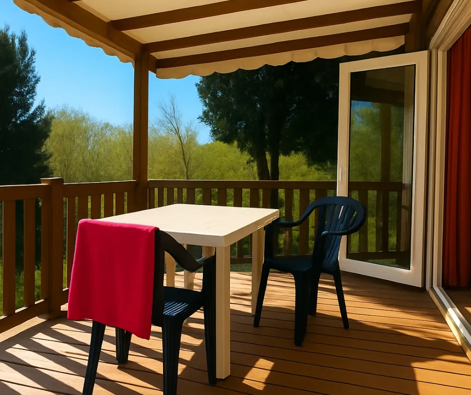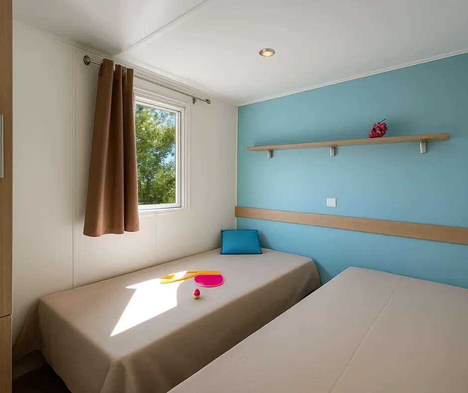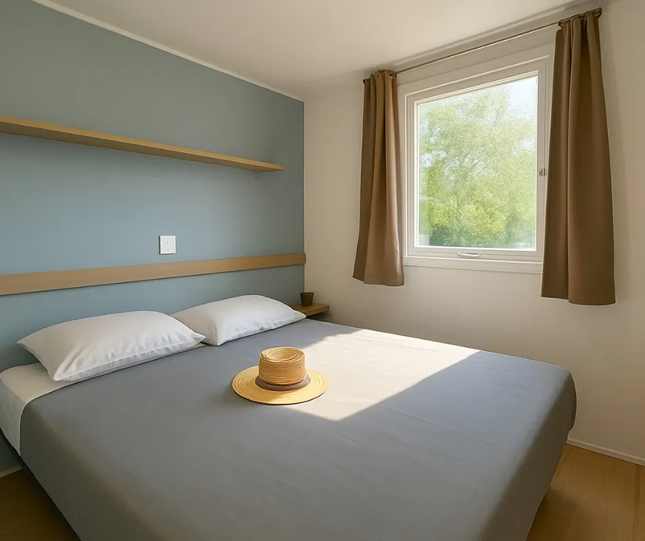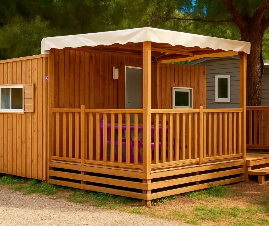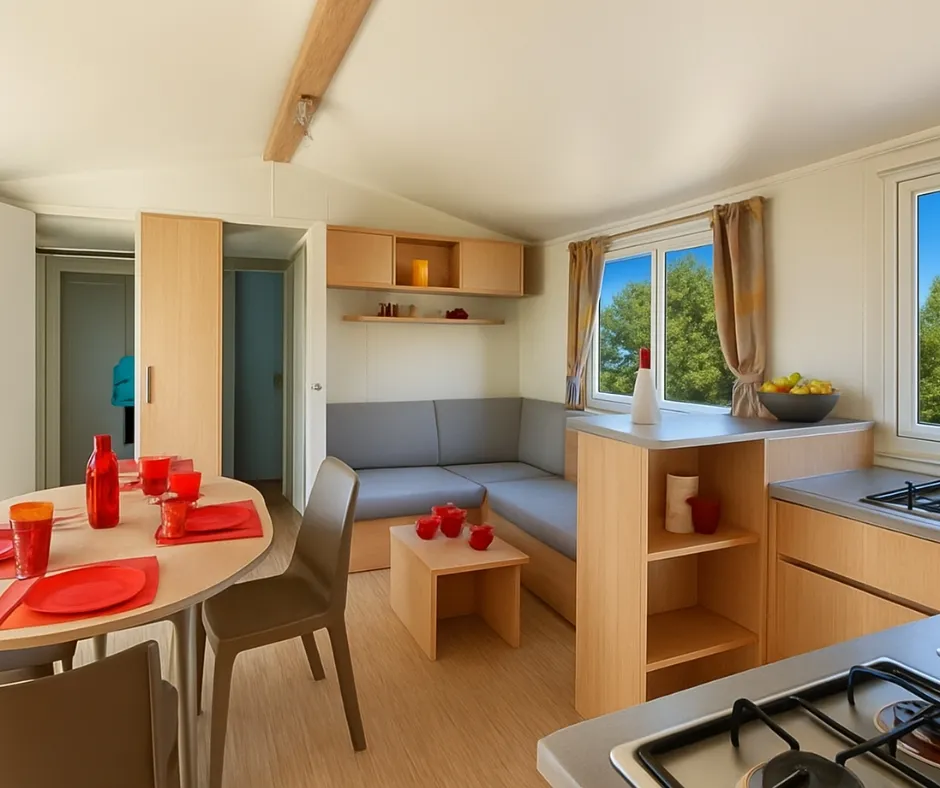 Die Mobilheime Cottage 3 VIP gehören zu unserer Luxusklasse. Sie sind mit einer umkehrbaren Klimaanlage und einem Flachbildfernseher ausgestattet. Die Cottage 3 VIP verfügen über eine privilegierte Lage und ein erstklassiges Ausstattungsniveau. Sie können bis zu 6 Personen beherbergen. Bettwäsche nicht inbegriffen.