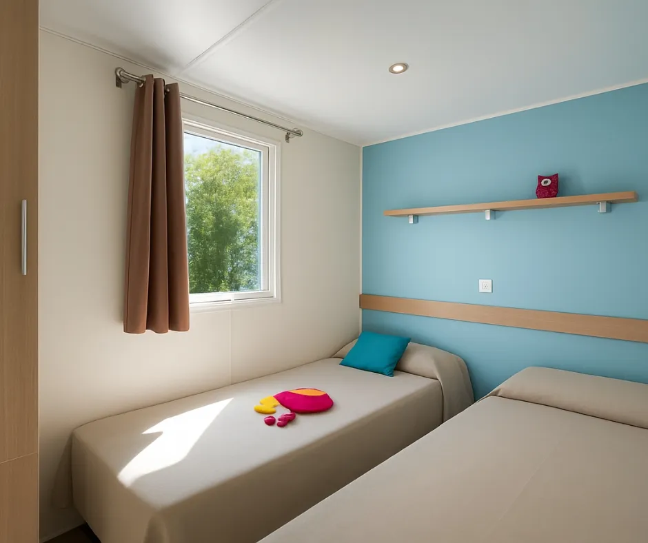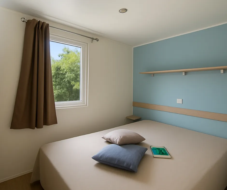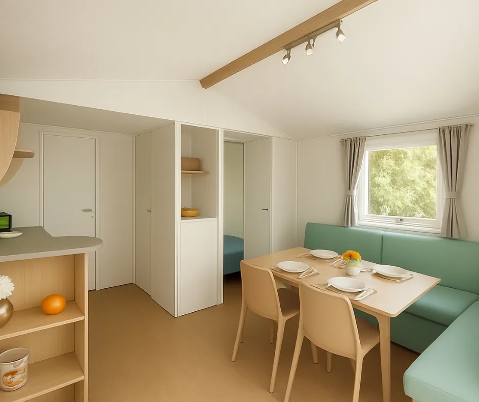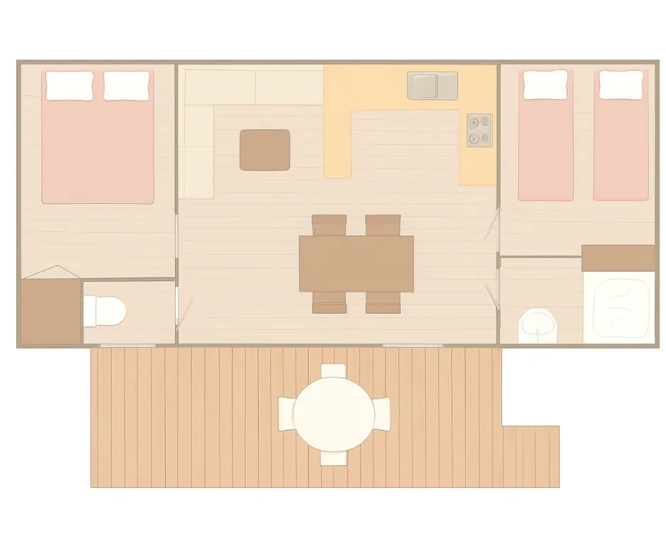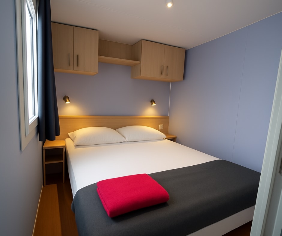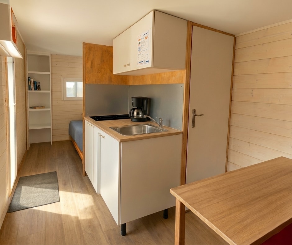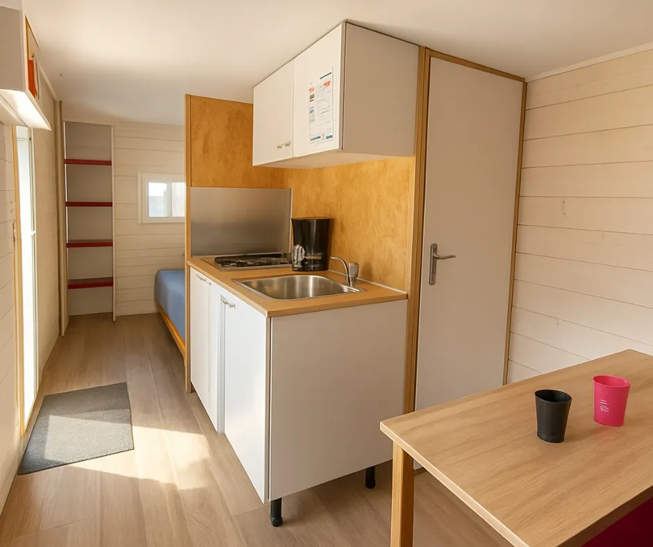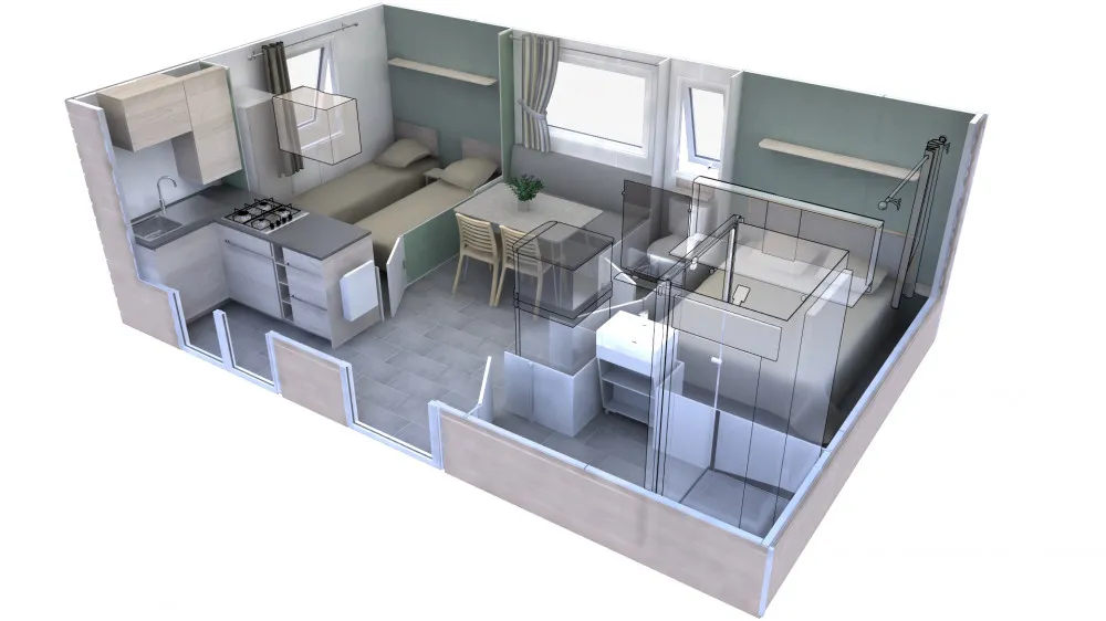 Das Mobilheim Cottage 2+ ist auch in einer barrierefreien Version erhältlich. Es wurde vollständig für Menschen mit Behinderung konzipiert und angepasst, damit diese ihren Aufenthalt ohne Schwierigkeiten genießen können. Um ein barrierefreies Mobilheim zu buchen, reservieren Sie einfach ein Cottage 2+ und geben Sie in den Kommentaren an, dass Sie eine barrierefreie Unterkunft wünschen.