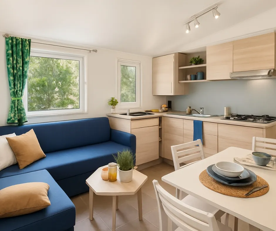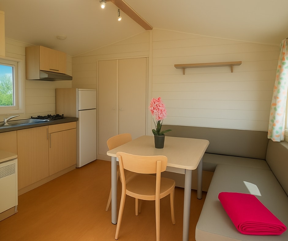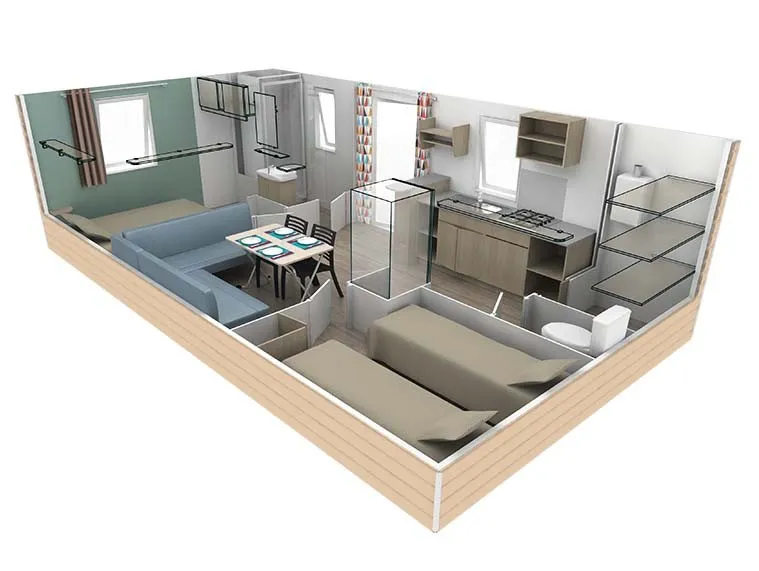 Die Mobilheime Cottage 2+ gehören zu unserer neuen Reihe neuer Mobilheime mit allem Komfort. Sie verfügen über eine umkehrbare Klimaanlage und einen Flachbildfernseher. Sie sind komplett ausgestattet und bieten Platz für bis zu 5 Personen. Bettwäsche nicht inbegriffen.