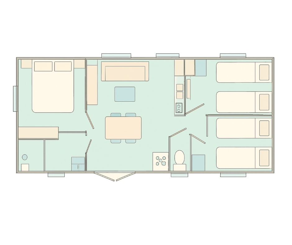 Die Mobilheime Cottage 3 gehören zu unserer jüngsten Baureihe. Sie verfügen über eine umkehrbare Klimaanlage und einen Flachbildfernseher. Sie sind komplett ausgestattet und bieten Platz für bis zu 6 Personen. Bettwäsche nicht inbegriffen.