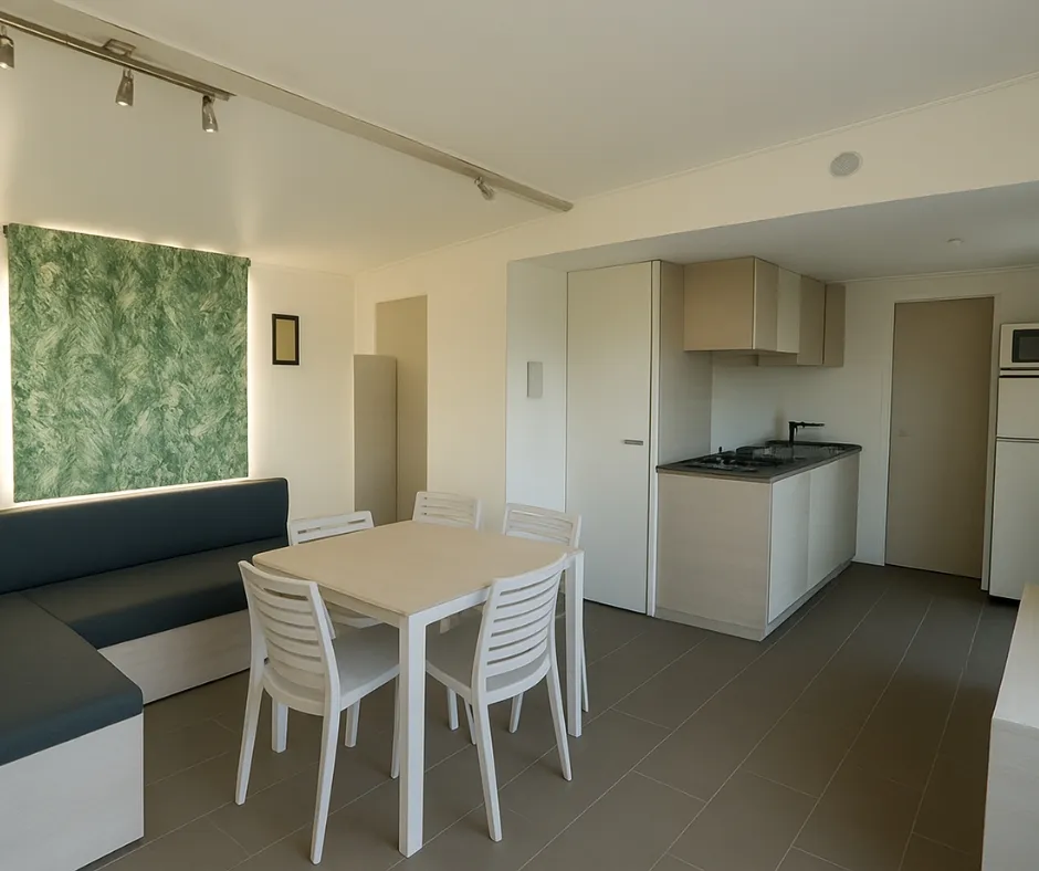 Die Mobilheime Comfort 2+ verfügen über zwei Schlafzimmer und eine Ecke mit Tisch und Küche. Sie sind komplett ausgestattet und bieten Platz für bis zu vier Personen. Bettwäsche nicht im Preis inbegriffen.