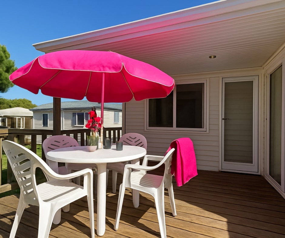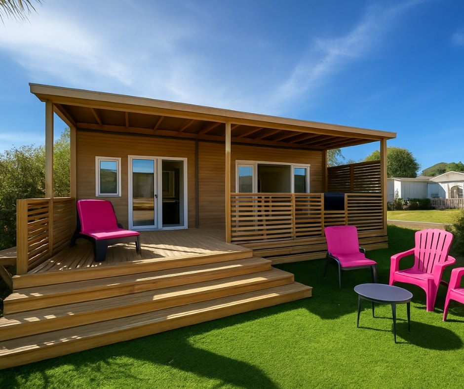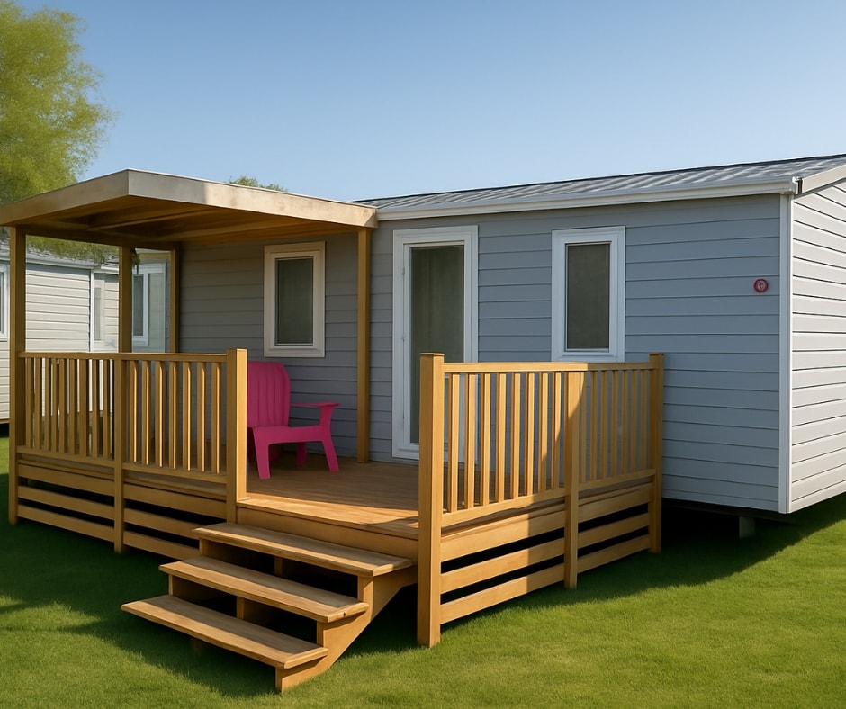 Die Mobilheime Cottage 2 gehören zu unserer jüngsten Baureihe. Sie verfügen über eine umkehrbare Klimaanlage und einen Flachbildfernseher. Sie sind komplett ausgestattet und bieten Platz für bis zu 5 Personen. Bettwäsche nicht inbegriffen.