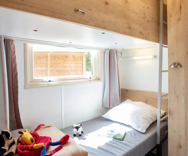 Auf dem Campingplatz Lac de la Siauve: Auf der Elternseite ein Doppelbett (140×200) und auf der Kinderseite ein Doppelbett (140×190), das über einem Einzelbett (90×190.) liegt.