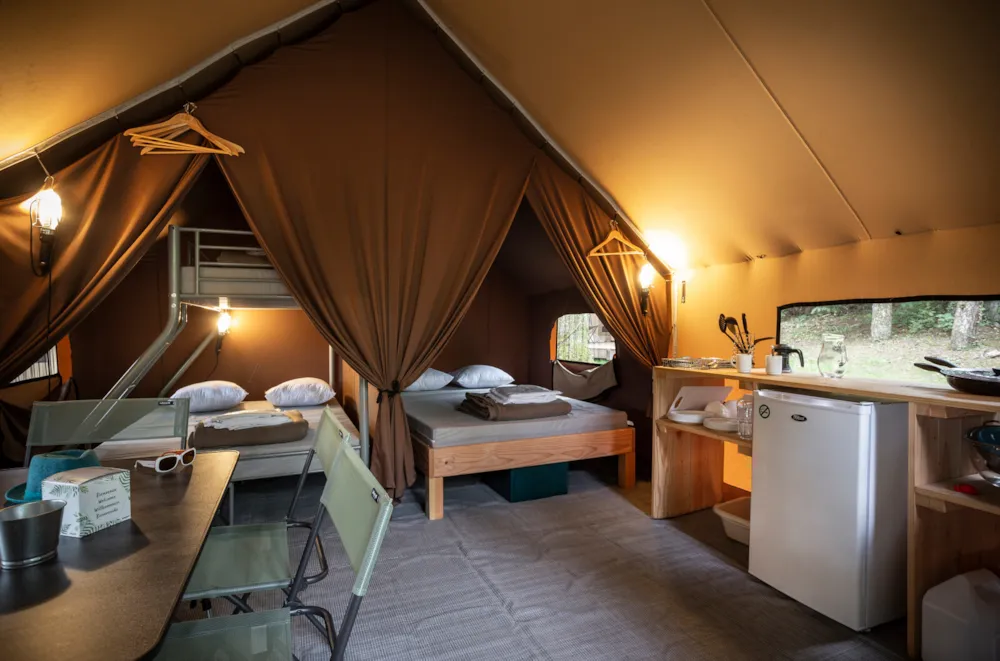 Originalität, Design und Komfort! Die außergewöhnliche Form des Zeltes rührt direkt von den Wohnstätten der Trapper des hohen Nordens her und ist genau das Richtige für Naturliebhaber – Sie werden begeistert sein! Seine komfortablen und praktischen Einrichtungen – ausgestattete Küche, gemütliche Betten und Essbereich – garantieren einen entspannenden und ruhigen Urlaub.