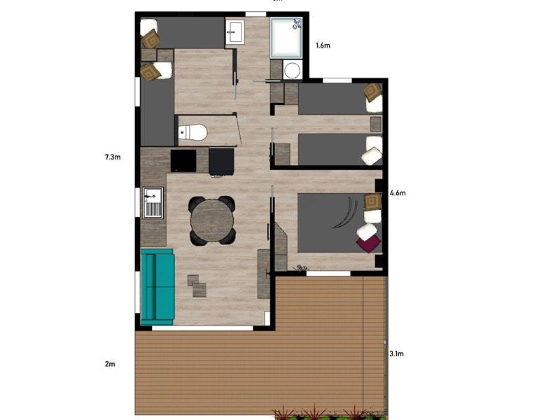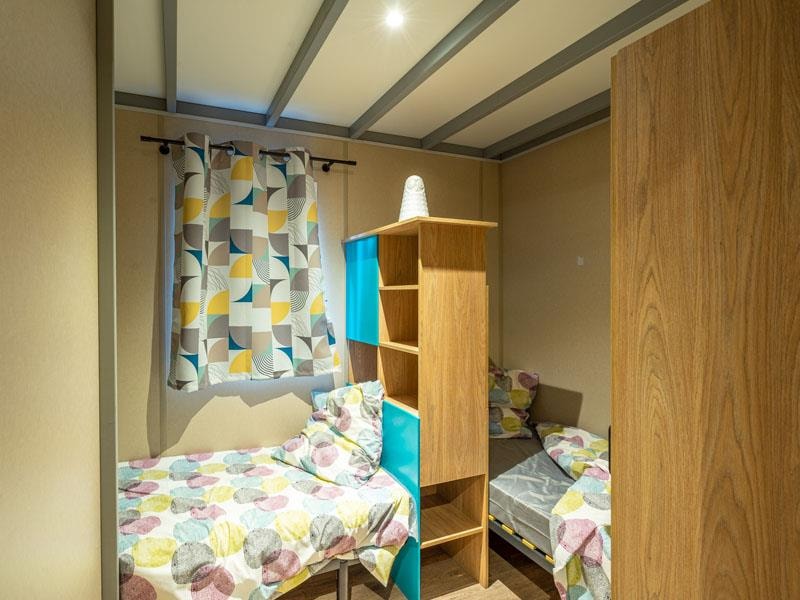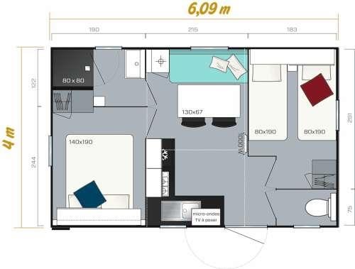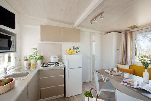 Das Wohnzimmer mit integrierter Einbauküche bietet großzügigen Raum für gesellige Momente mit der Familie oder Freunden. Das Elternschlafzimmer garantiert Ihnen mit seinem 140 x 200 cm großen Bett und viel Stauraum ruhige Nächte, während das Kinderzimmer mit 3 Betten, davon eines hoch oben, für unvergessliche Urlaubserinnerungen sorgt.