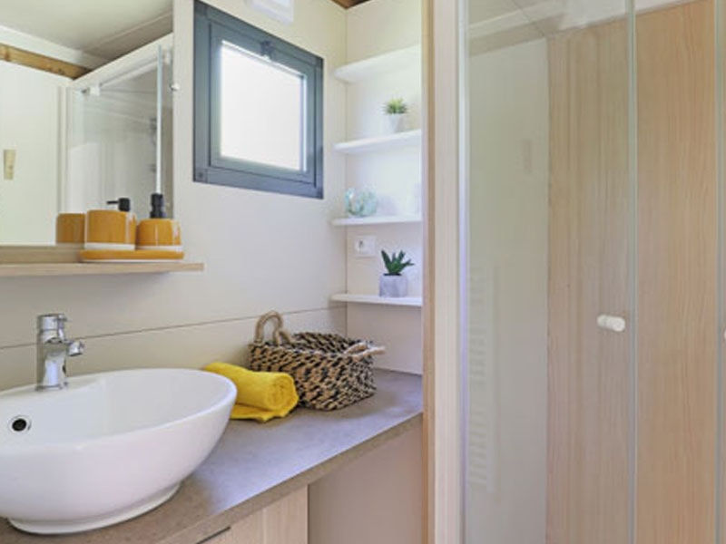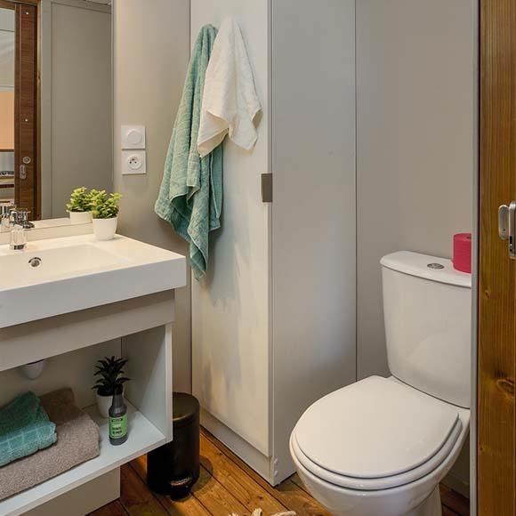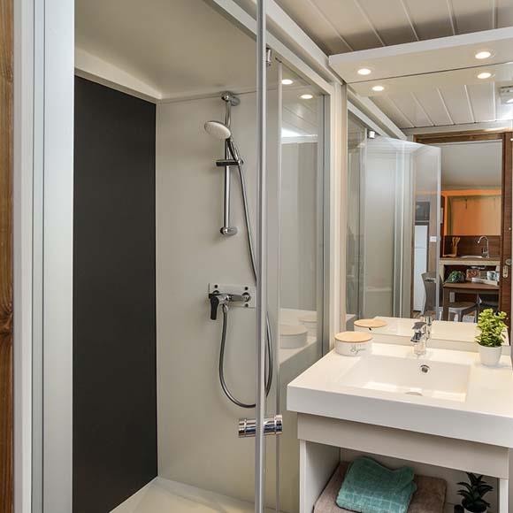 Das geräumige Badezimmer mit XL-Dusche und separatem WC verleiht Ihrem Aufenthalt einen Hauch von Komfort. Das doppelt verglaste Erkerfenster mit einer großen Öffnung von 2,40 m bietet außergewöhnliche Helligkeit und einen atemberaubenden Blick auf den Fluss Drôme und schafft so eine perfekte Verbindung mit der umliegenden Natur.