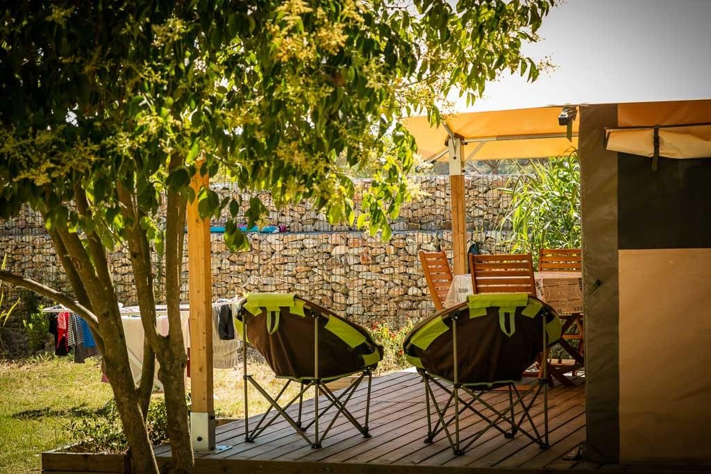 Auf der einen Seite können Sie Ihr Zelt oder Ihre Ausrüstung in aller Ruhe aufbauen. Auf der anderen Seite können Sie sich unter einer Holzpergola mit einer gespannten Plane entspannen, die einen angenehmen Schattenplatz bietet. Sie finden einen Picknicktisch und zwei Sonnenliegen oder Liegestühle, um Ihre Momente der Entspannung inmitten der Natur zu genießen. Diese Stellplätze sind mit einem 10-Ampere-Stromanschluss (Adapter erforderlich), einem Wasseranschluss und einem Abwasserablauf ausgestattet. Sie haben eine durchschnittliche Fläche von 200 m² und bieten Platz für bis zu 4 Erwachsene und 2 Kinder.