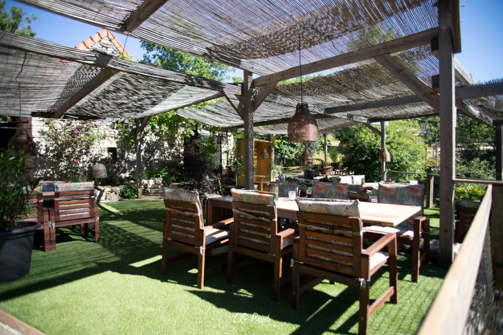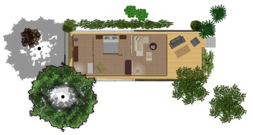 Die 25 m² große, überdachte Terrasse mit Gartenmöbeln erweitert den Wohnbereich. Sie ist mit einer Hängematte, zwei Liegesesseln und einer Gartenlounge aus Holz ausgestattet.
