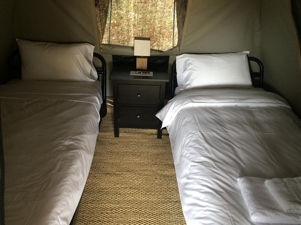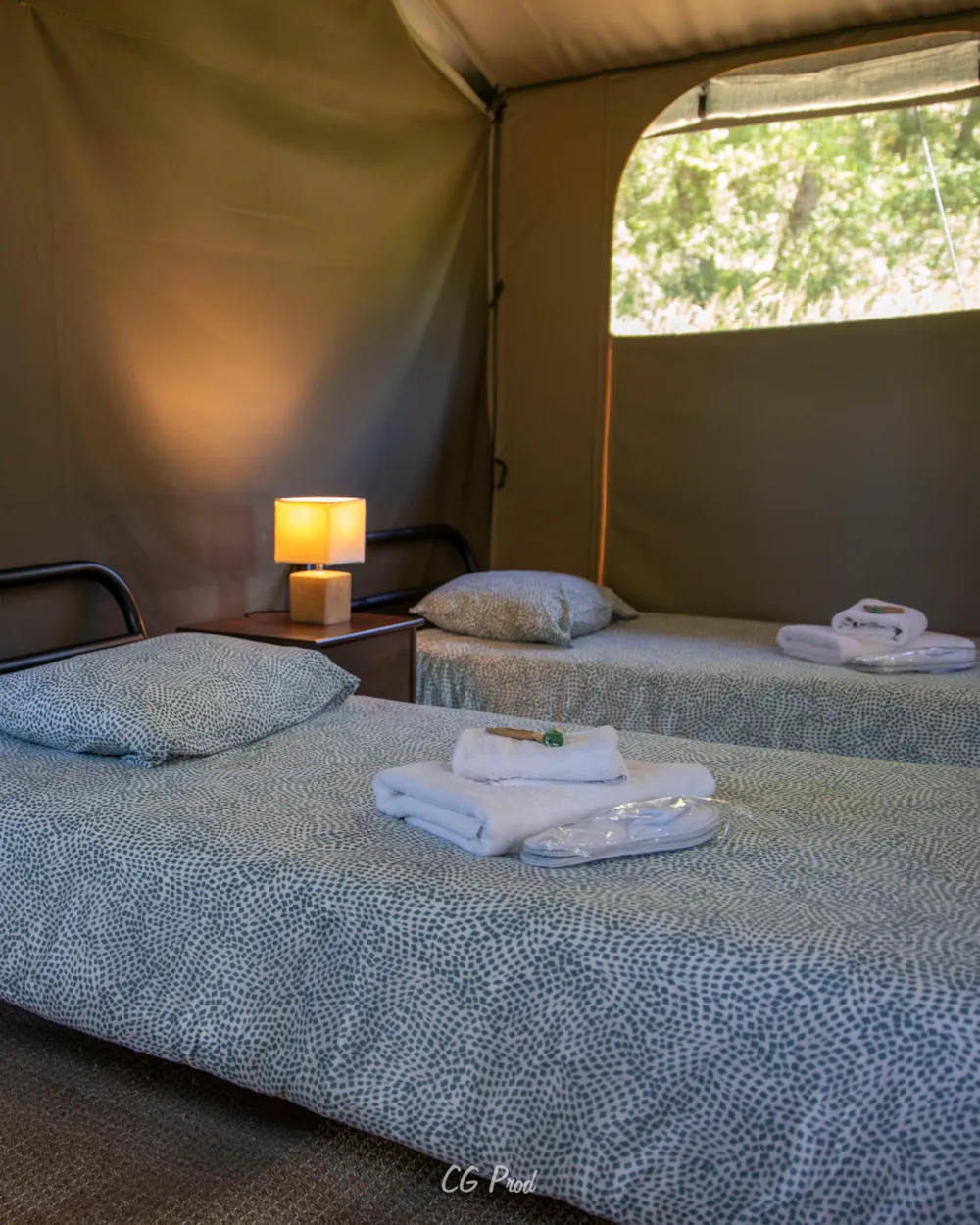Diese Grand Safari Lodge bietet ein komfortables Doppelbett (160 x 200 cm) in einem Schlafzimmer und zwei Einzelbetten (90 x 200 cm) in einem zweiten Schlafzimmer.