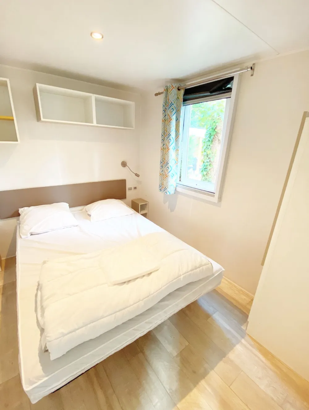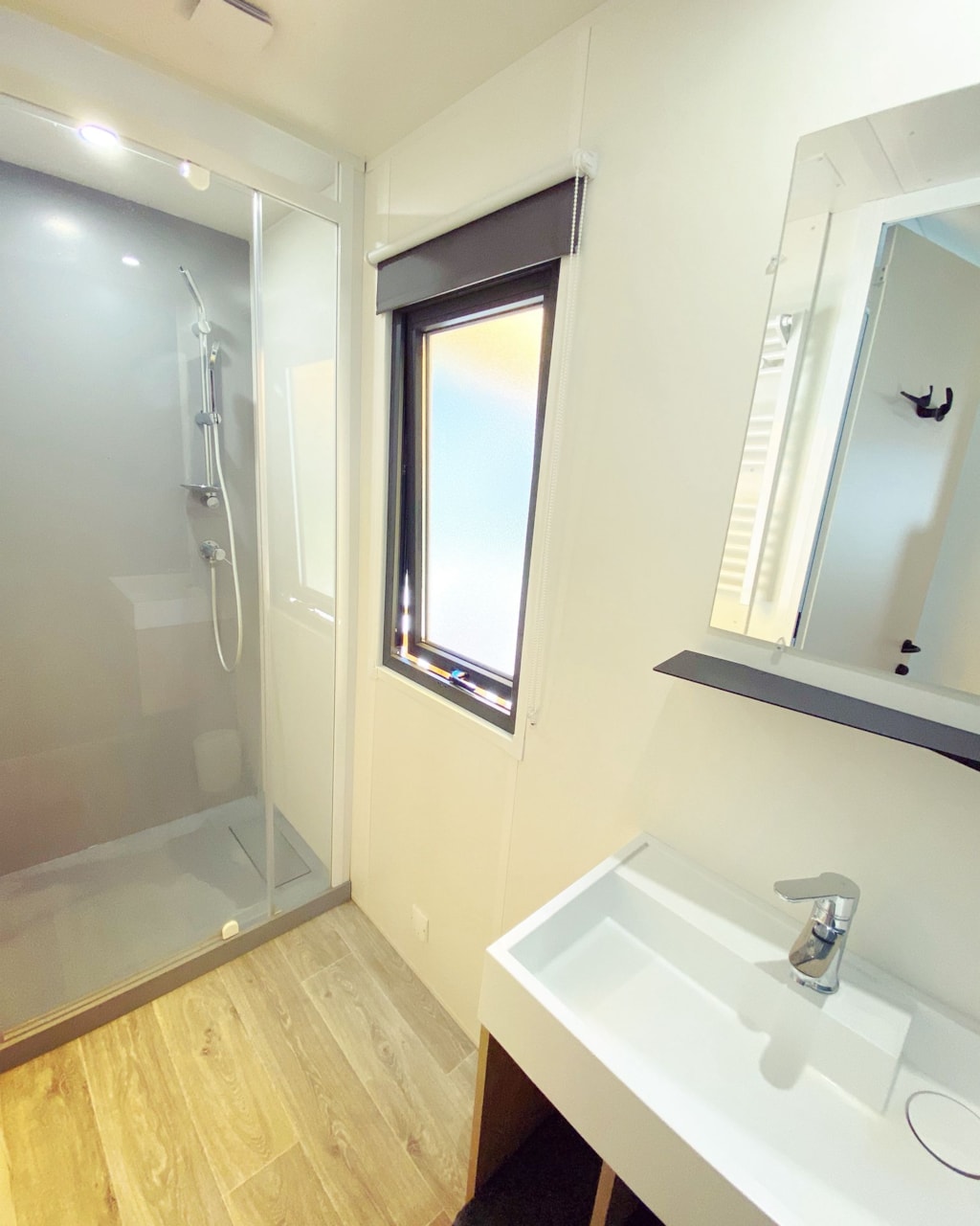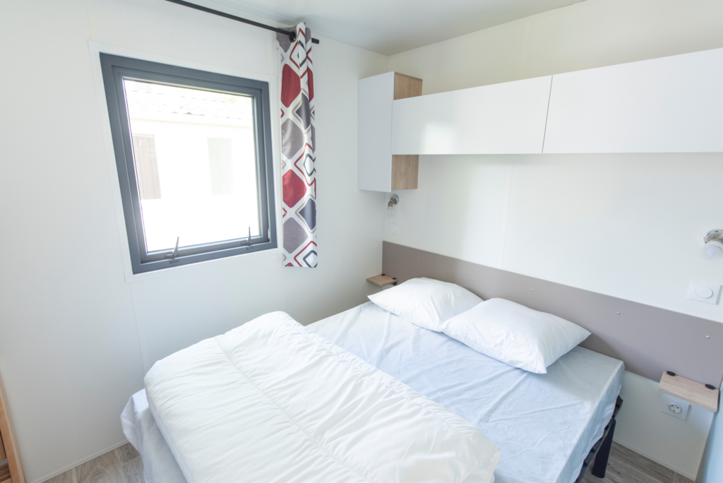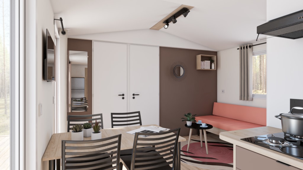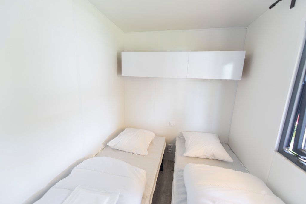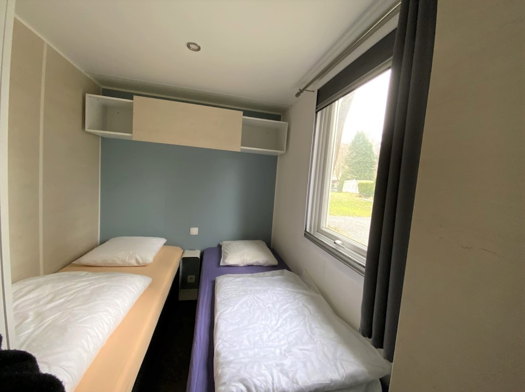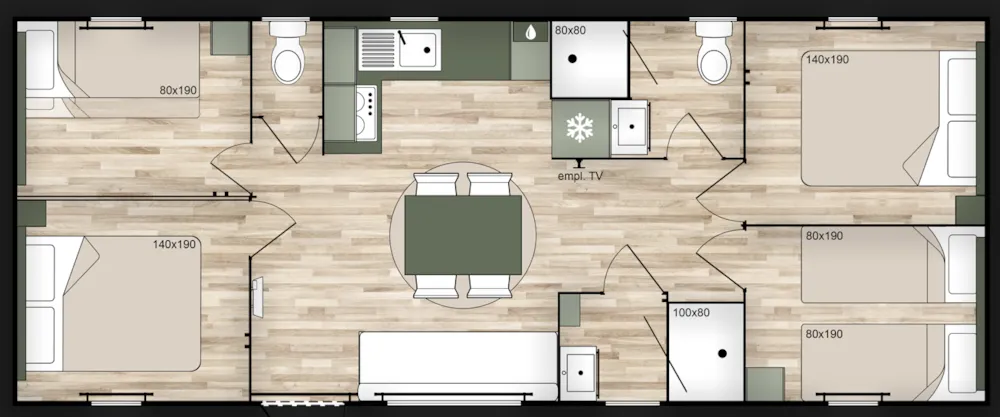 Dieses Mobilheim ist mit einer hochwertigen, reversiblen Klimaanlage und einem Flachbildfernseher ausgestattet. Es verfügt über drei Schlafzimmer: eines mit einem Doppelbett (140 x 190 cm) und zwei weitere mit je zwei Einzelbetten (80 x 190 cm), also insgesamt vier Einzelbetten. Kissen, Matratzenschoner und Decken sind vorhanden. Außerdem gibt es einen Wohnbereich mit Kochnische und Essbereich mit Sitzbank und Stühlen sowie zwei Badezimmer mit Dusche, Waschbecken und WC. Zur Ausstattung gehören ein Flachbildfernseher, Geschirr, Küchenutensilien, eine Mikrowelle, eine Kaffeemaschine, eine Terrasse mit Gartenmöbeln und Liegestühlen, ein Kühlschrank und ein Kochfeld.
