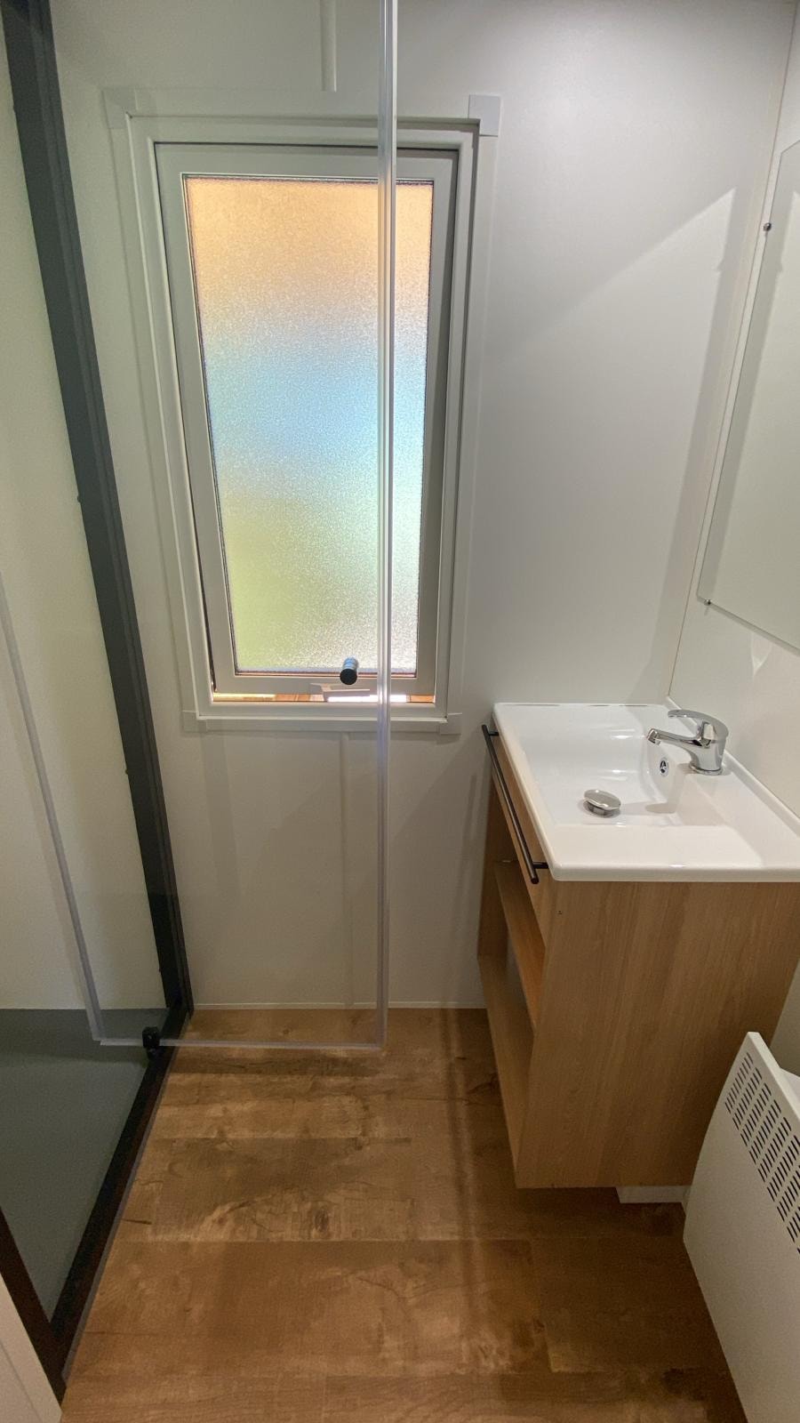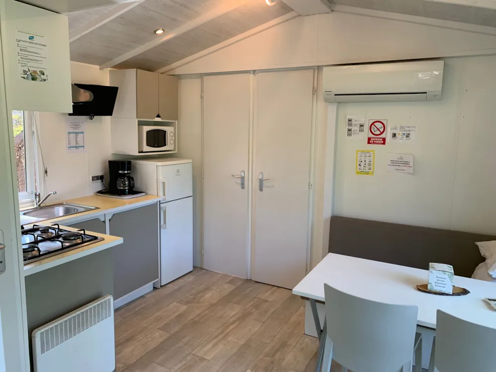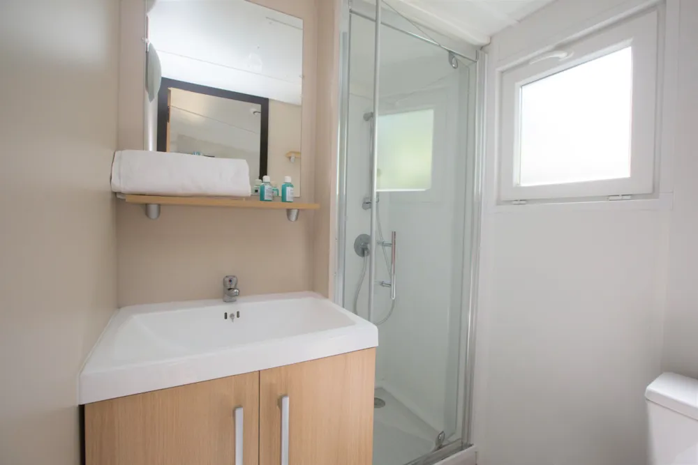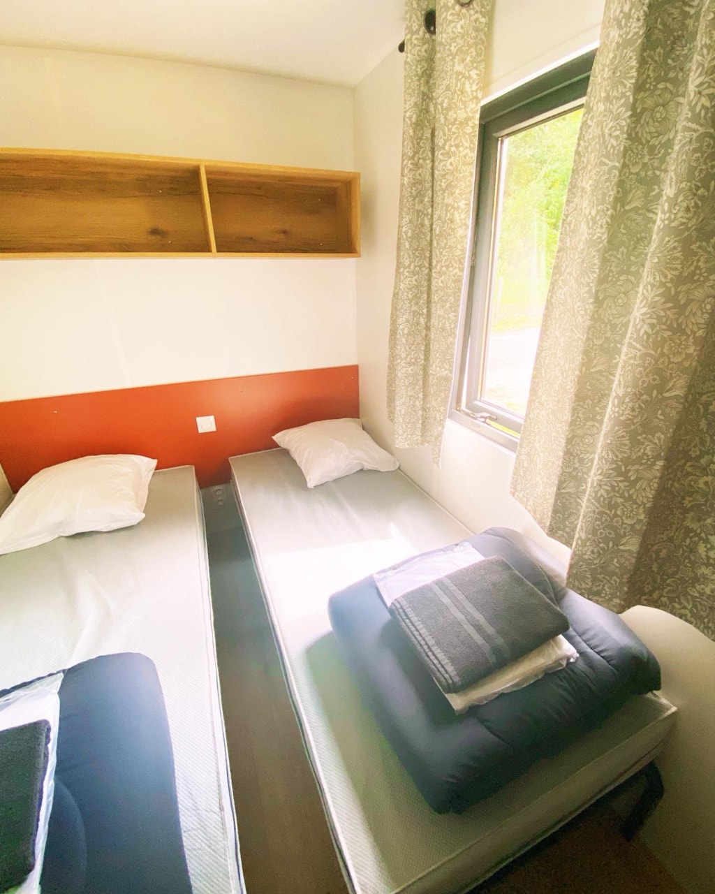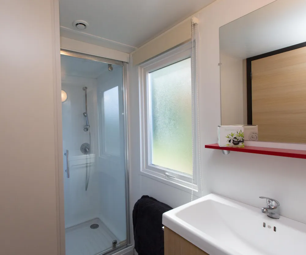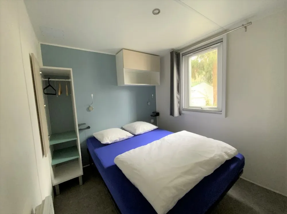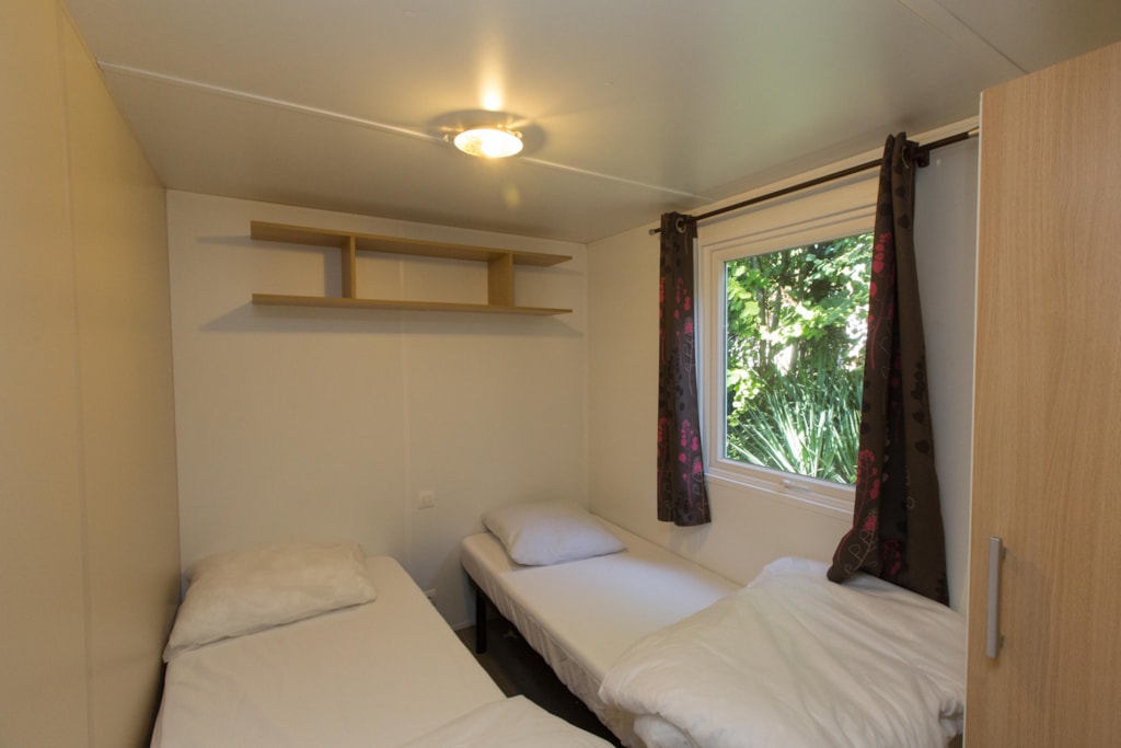 Dieses Mobilheim ist mit einer hochwertigen, reversiblen Klimaanlage und einem Flachbildfernseher ausgestattet. Es verfügt über drei Schlafzimmer: eines mit einem Doppelbett (140 x 190 cm) und zwei weitere mit je zwei Einzelbetten (80 x 190 cm), also insgesamt vier Einzelbetten. Kissen, Matratzenschoner und Decken sind vorhanden. Außerdem gibt es einen Wohnbereich mit Kochnische und Essbereich mit Sitzbank und Stühlen sowie zwei Badezimmer mit Dusche, Waschbecken und WC. Zur Ausstattung gehören ein Flachbildfernseher, Geschirr, Küchenutensilien, eine Mikrowelle, eine Kaffeemaschine, eine Terrasse mit Gartenmöbeln und Liegestühlen, ein Kühlschrank und ein Kochfeld.