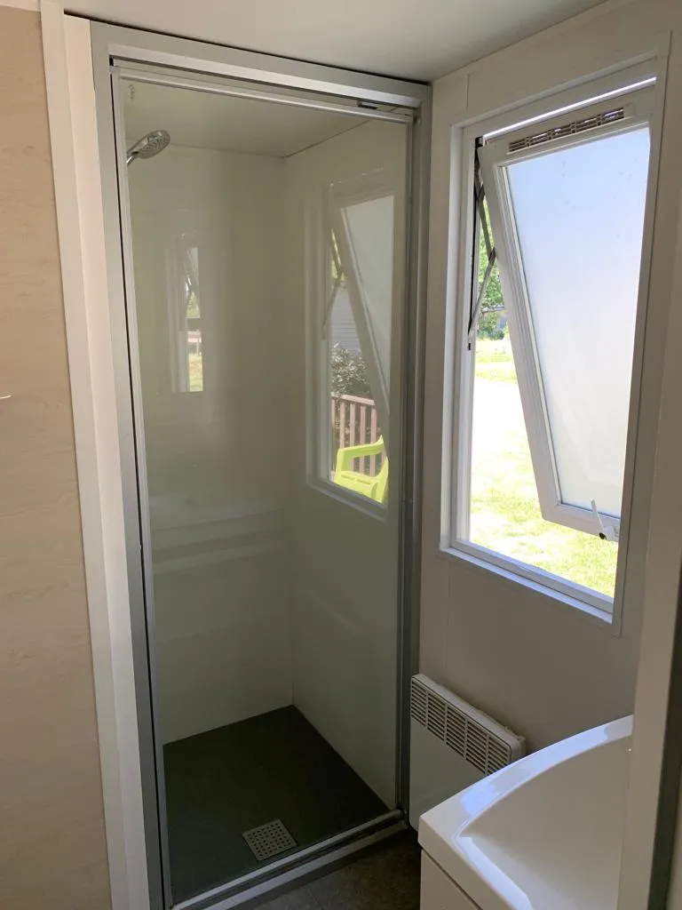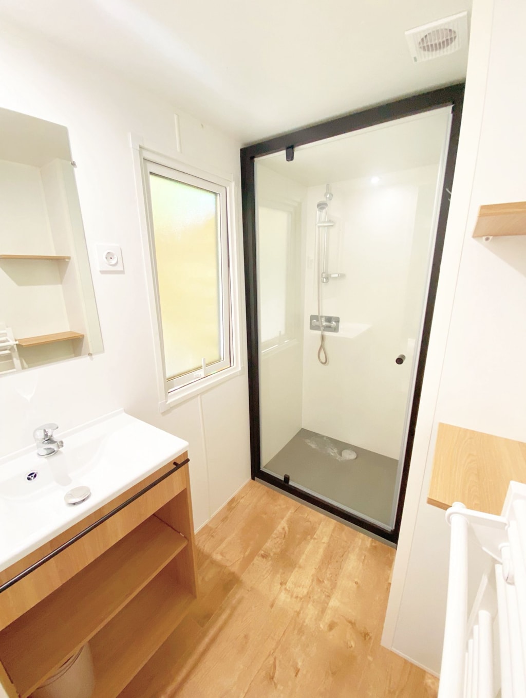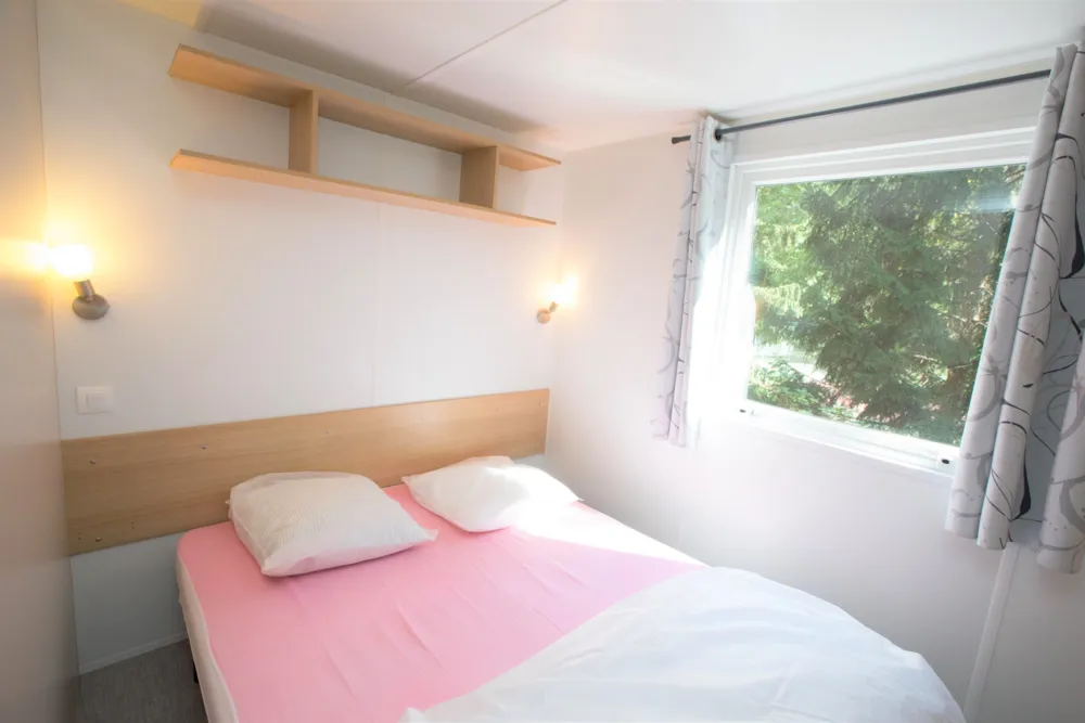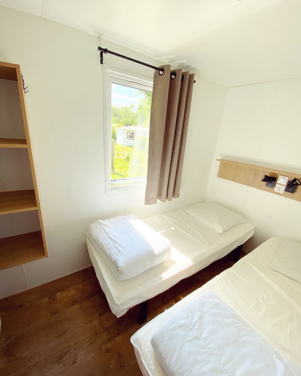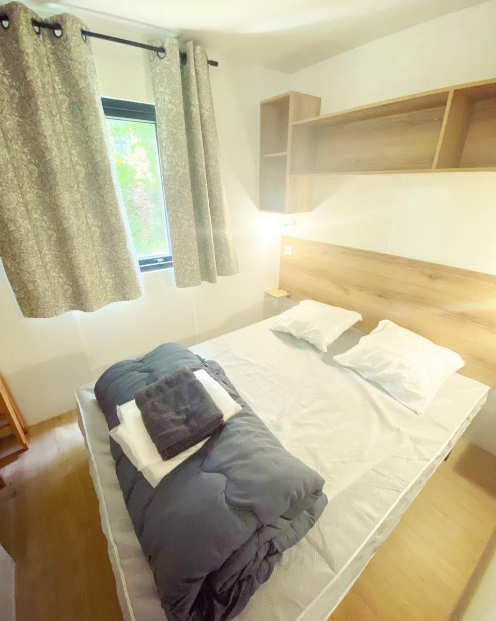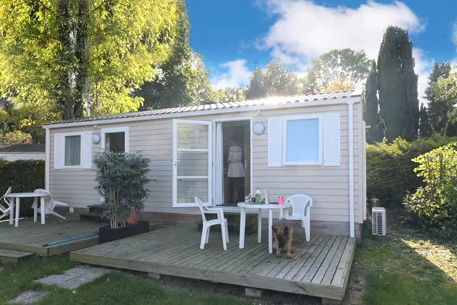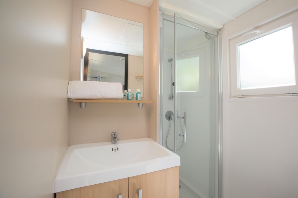 Dieses Mobilheim ist mit einer hochwertigen, reversiblen Klimaanlage und einem Flachbildfernseher ausgestattet. Es verfügt über drei Schlafzimmer: eines mit einem Doppelbett (140 x 190 cm) und zwei weitere mit je zwei Einzelbetten (80 x 190 cm), also insgesamt vier Einzelbetten. Kissen, Matratzenschoner und Decken sind vorhanden. Außerdem gibt es einen Wohnbereich mit Kochnische und Essbereich mit Sitzbank und Stühlen sowie zwei Badezimmer mit Dusche, Waschbecken und WC. Zur Ausstattung gehören ein Flachbildfernseher, Geschirr, Küchenutensilien, eine Mikrowelle, eine Kaffeemaschine, eine Terrasse mit Gartenmöbeln und Liegestühlen, ein Kühlschrank und ein Kochfeld.