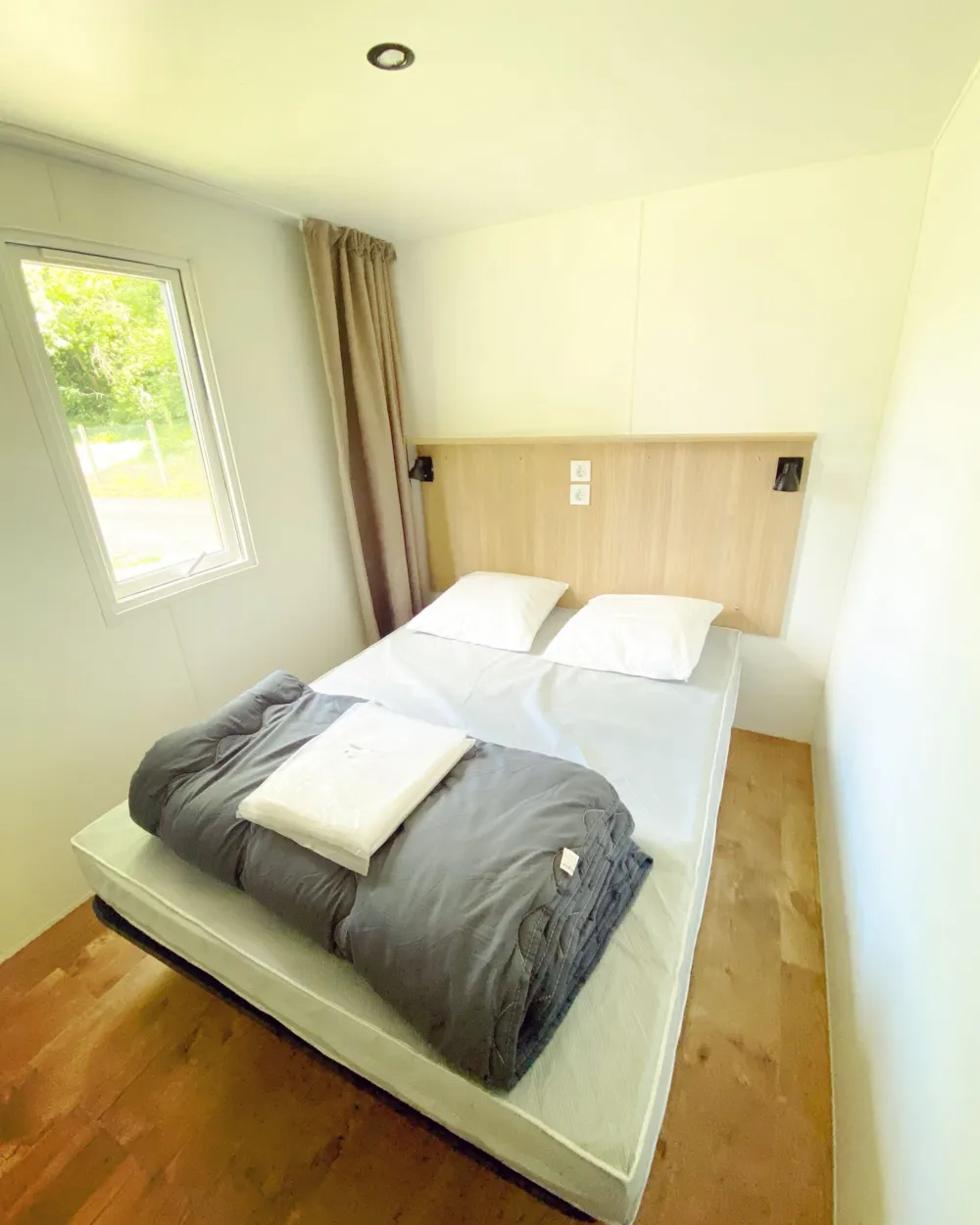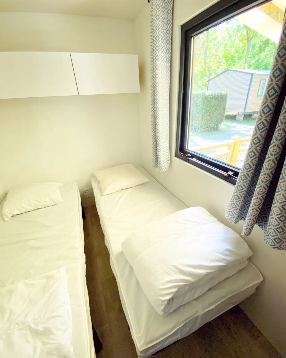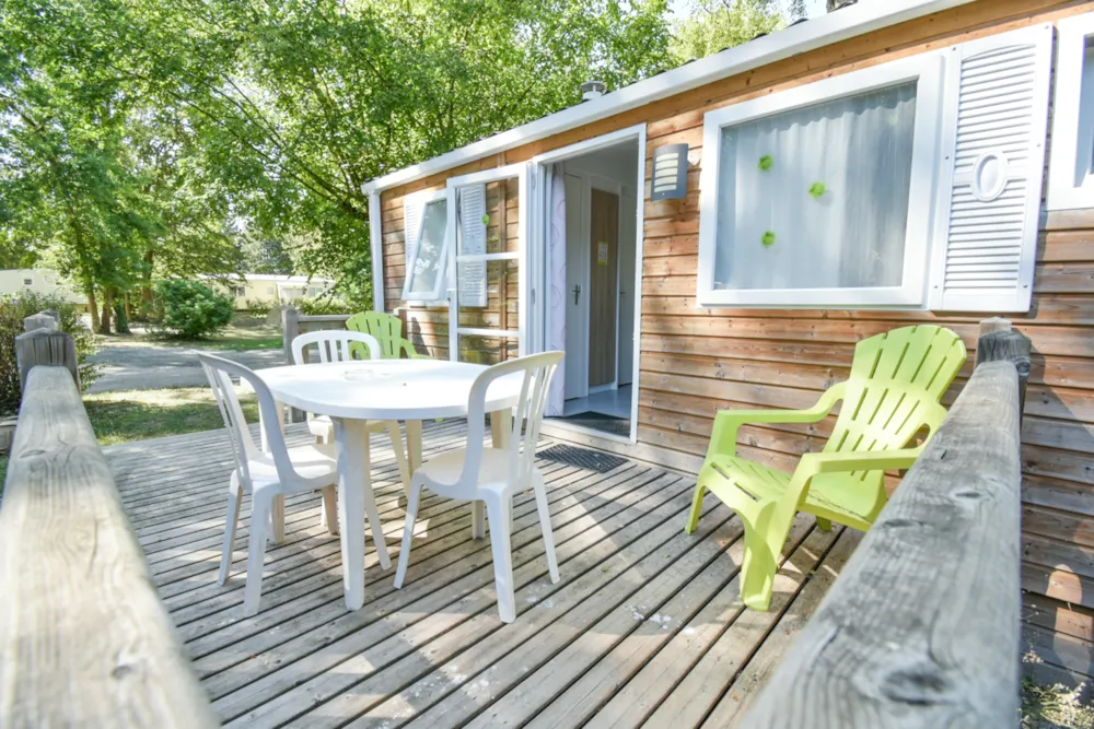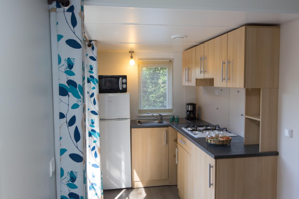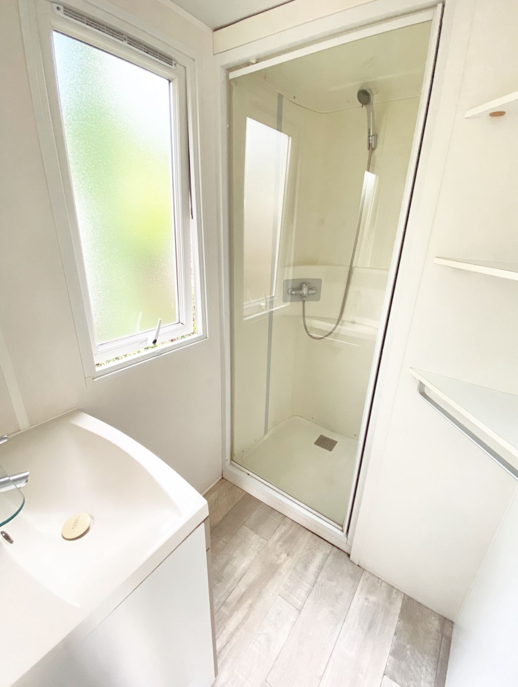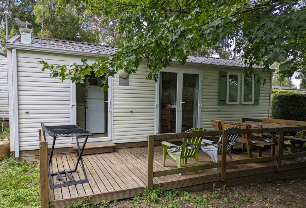 Dieses Mobilheim ist mit einer hochwertigen, reversiblen Klimaanlage und einem Flachbildfernseher ausgestattet. Es verfügt über drei Schlafzimmer: eines mit einem Doppelbett (140 x 190 cm) und zwei weitere mit je zwei Einzelbetten (80 x 190 cm), also insgesamt vier Einzelbetten. Kissen, Matratzenschoner und Decken sind vorhanden. Außerdem gibt es einen Wohnbereich mit Kochnische und Essbereich mit Sitzbank und Stühlen sowie zwei Badezimmer mit Dusche, Waschbecken und WC. Zur Ausstattung gehören ein Flachbildfernseher, Geschirr, Küchenutensilien, eine Mikrowelle, eine Kaffeemaschine, eine Terrasse mit Gartenmöbeln und Liegestühlen, ein Kühlschrank und ein Kochfeld.