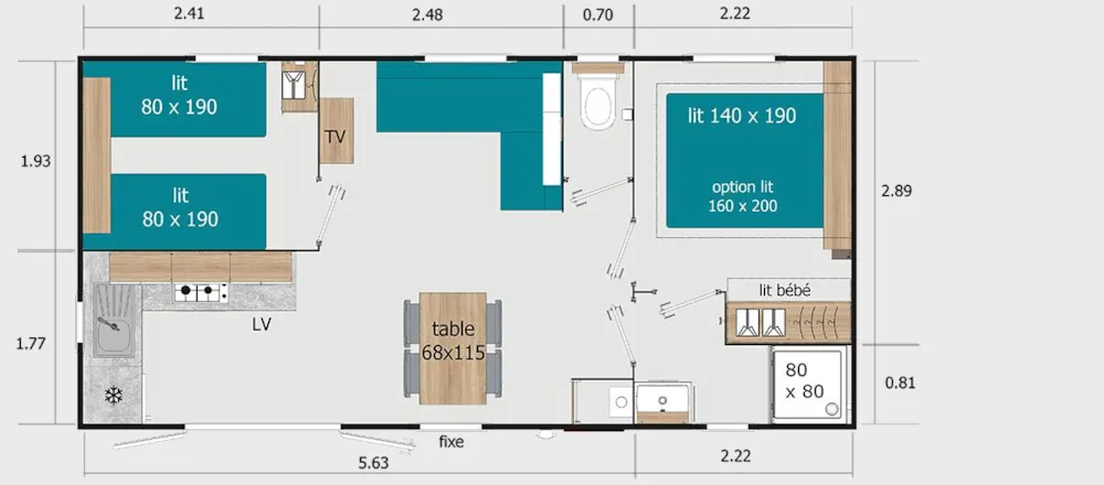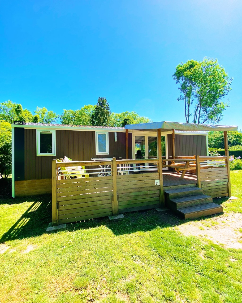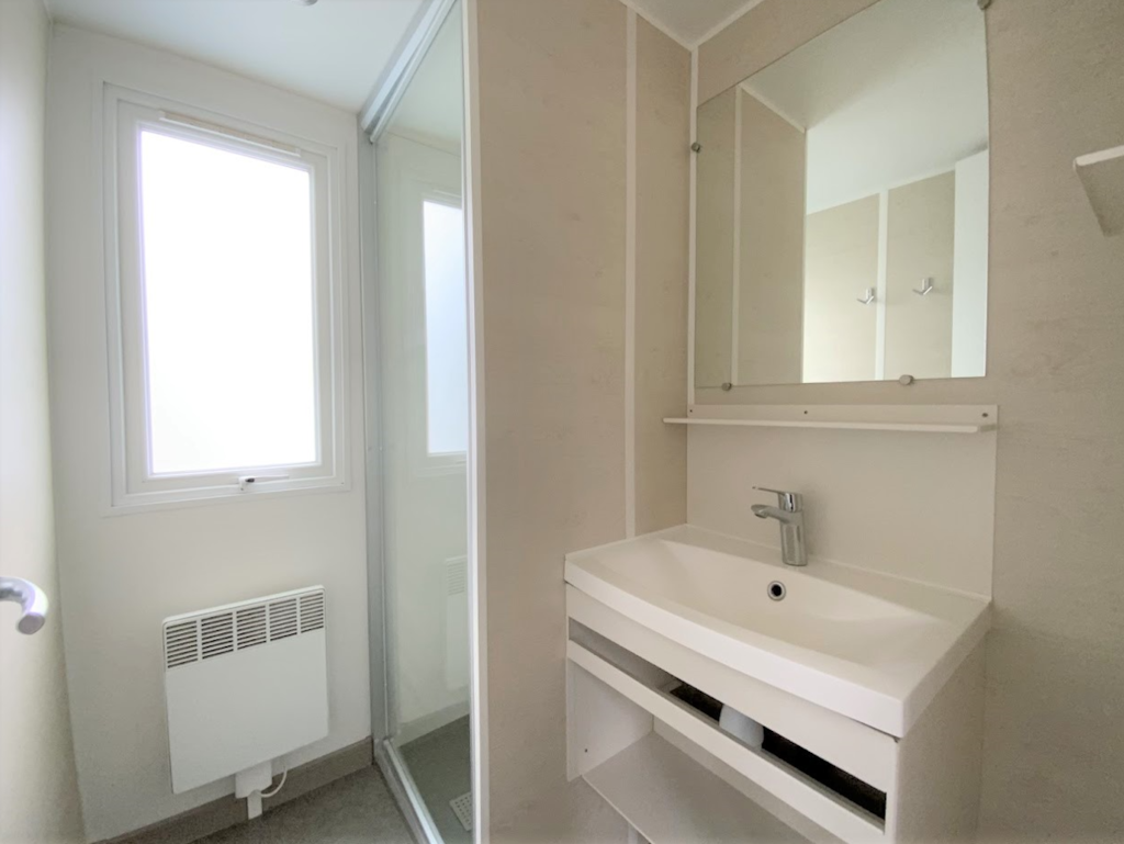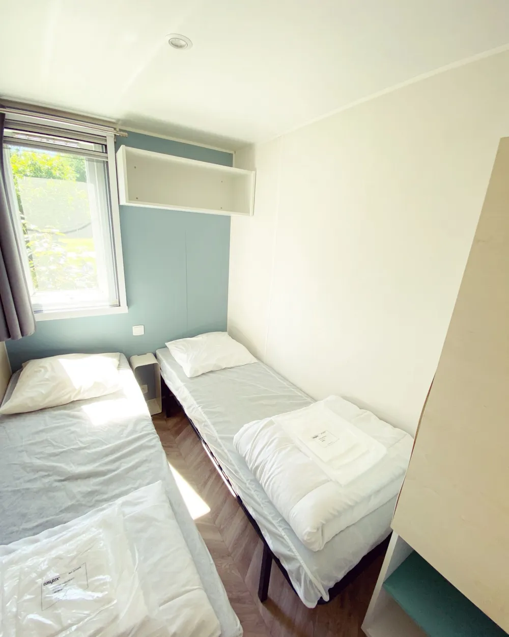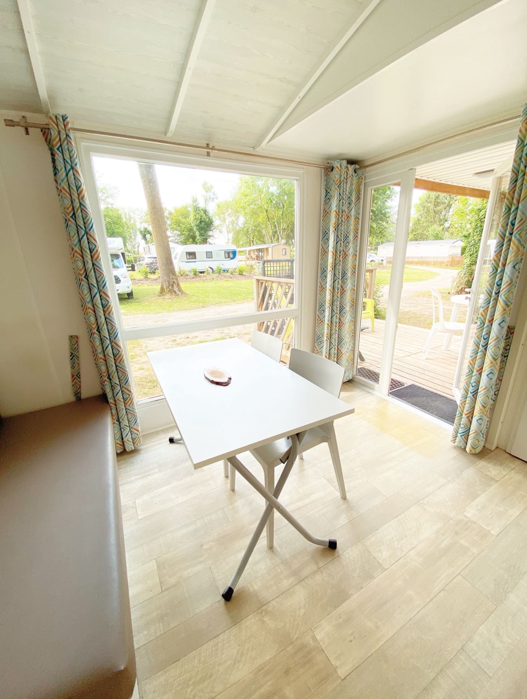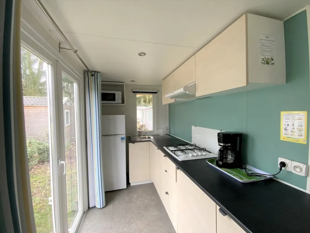 Dieses Mobilheim ist mit einer hochwertigen, reversiblen Klimaanlage und einem Flachbildfernseher ausgestattet. Es verfügt über drei Schlafzimmer: eines mit einem Doppelbett (140 x 190 cm) und zwei weitere mit je zwei Einzelbetten (80 x 190 cm), also insgesamt vier Einzelbetten. Kissen, Matratzenschoner und Decken sind vorhanden. Außerdem gibt es einen Wohnbereich mit Kochnische und Essbereich mit Sitzbank und Stühlen sowie zwei Badezimmer mit Dusche, Waschbecken und WC. Zur Ausstattung gehören ein Flachbildfernseher, Geschirr, Küchenutensilien, eine Mikrowelle, eine Kaffeemaschine, eine Terrasse mit Gartenmöbeln und Liegestühlen, ein Kühlschrank und ein Kochfeld.