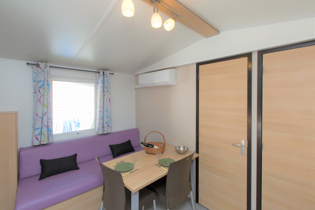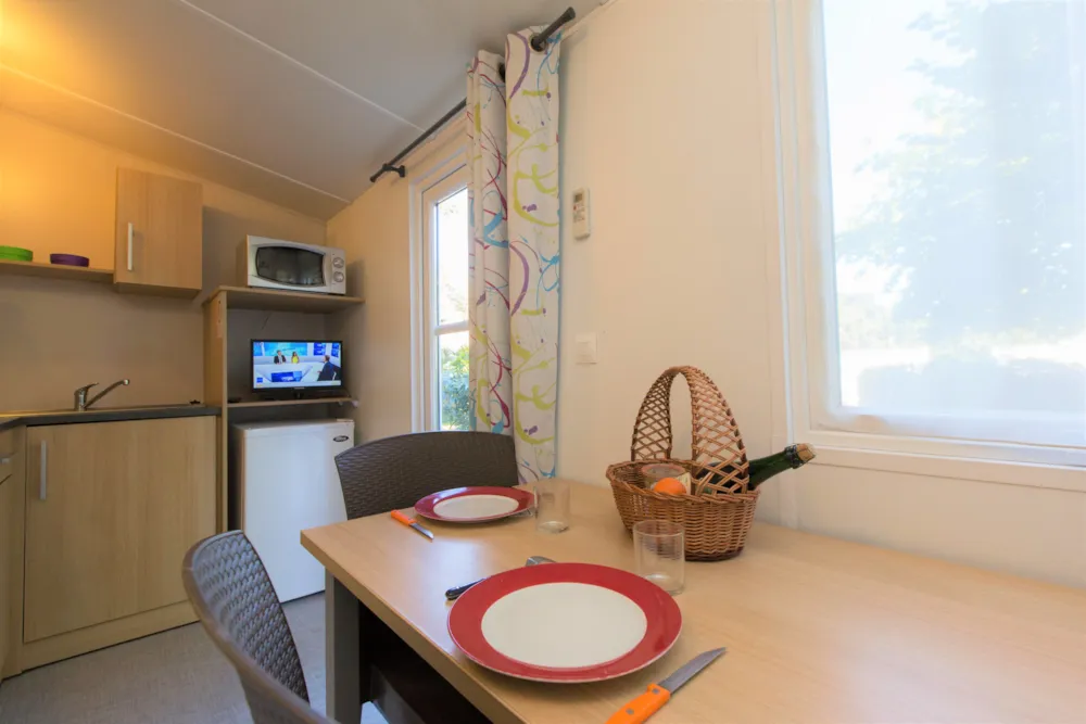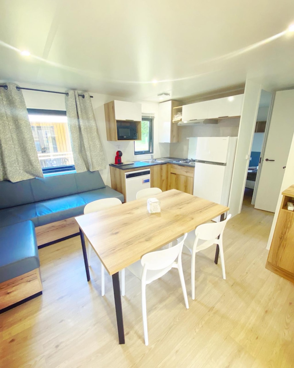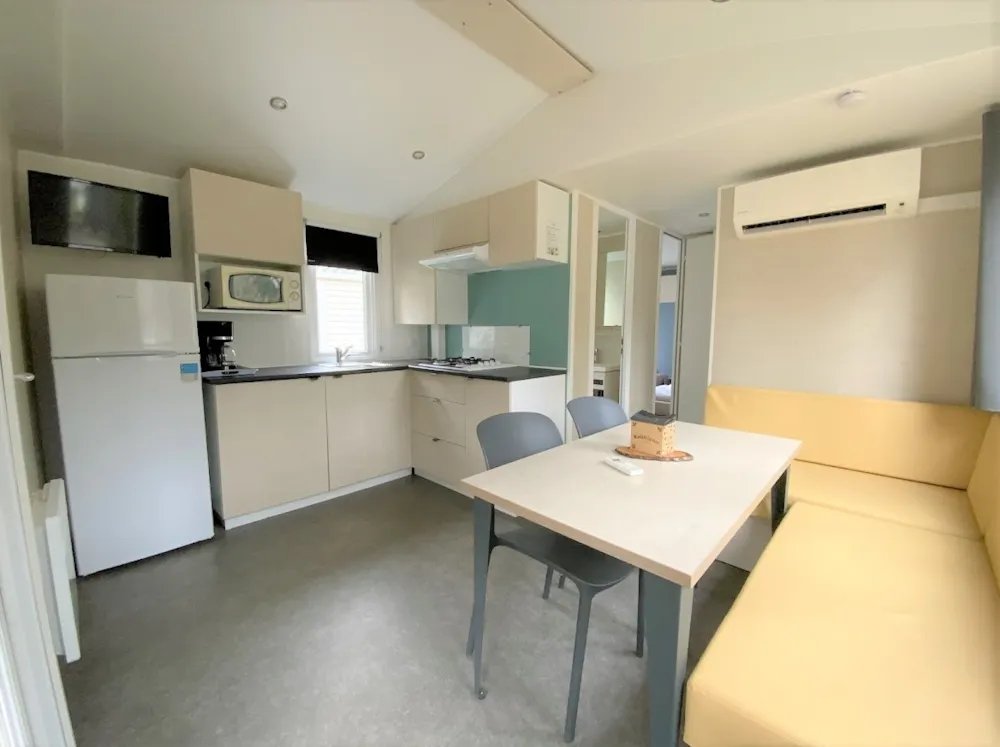 This mobile home is equipped with a high-end reversible air conditioning and a flat screen tv. The accommodation has four bedrooms, two with a double bed (140x19cm) in each and two with two single beds (80x190cm) in each, plus a sofa bed. Inside, you can find pillows, mattress protectors and blankets. Enjoy the main room with its kitchenette plus a dining area and chairs. A private bathroom with a shower, a sink and toilets are as well included.