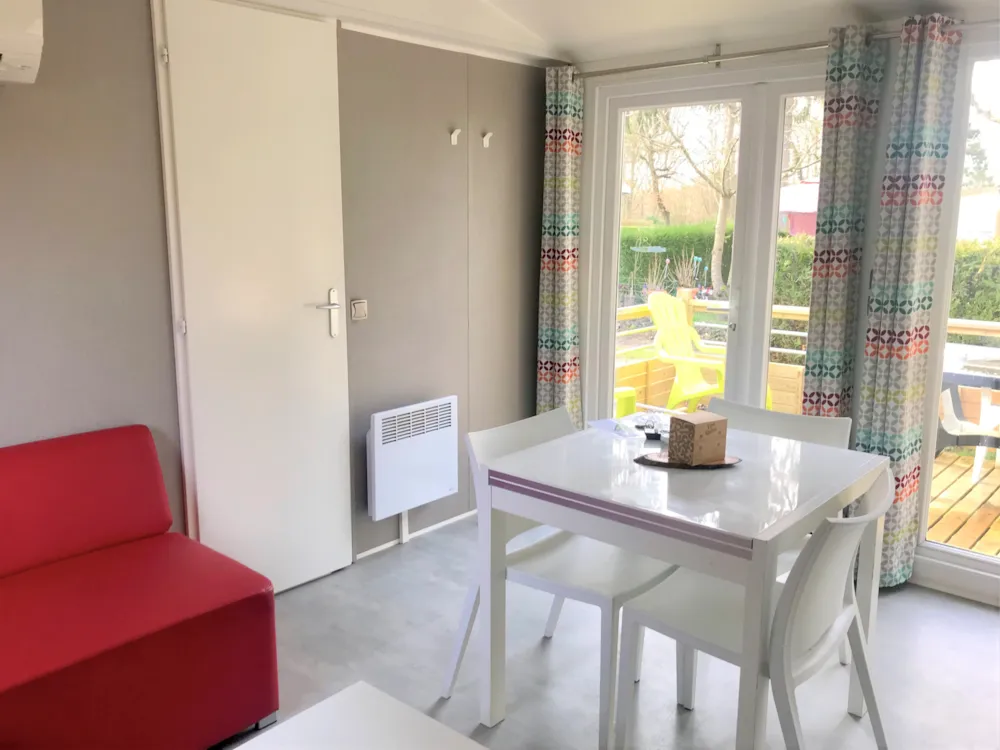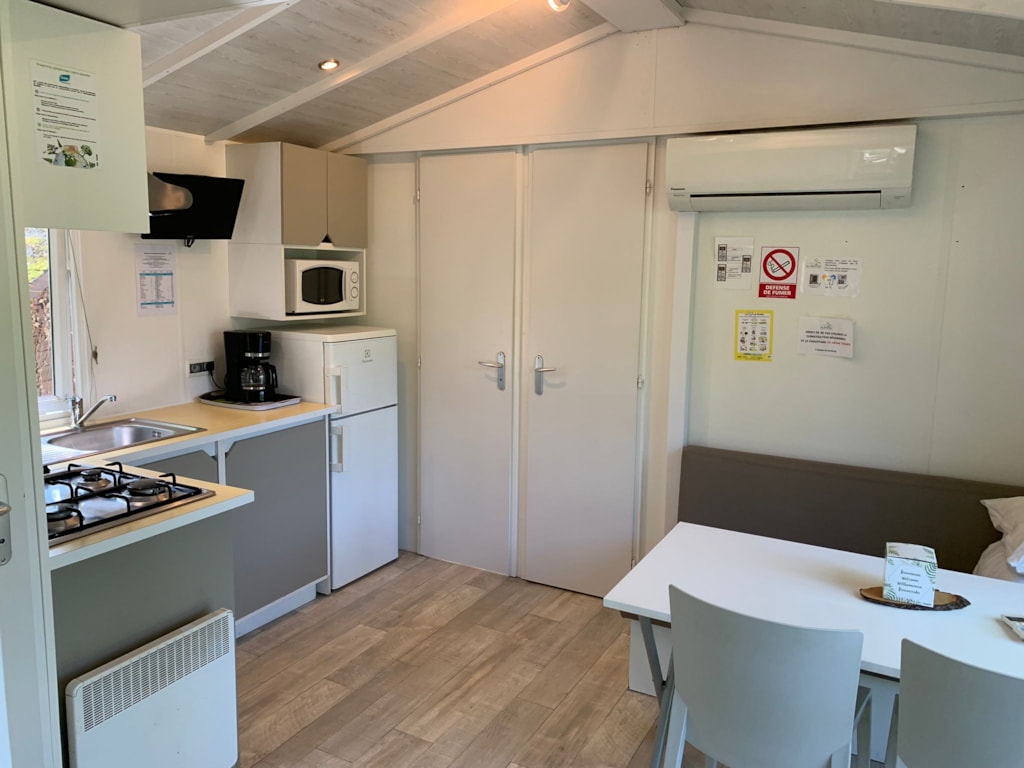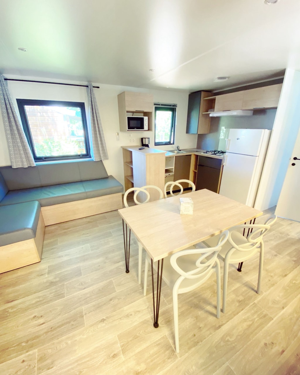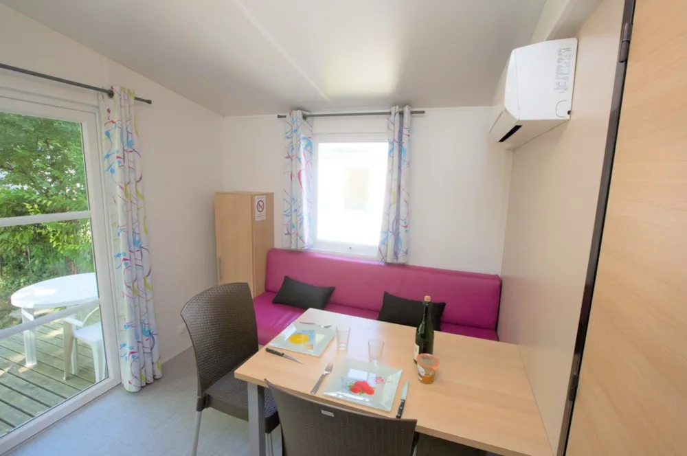 This mobile home is equipped with a high-end reversible air conditioning and a flat screen tv. The accommodation has four bedrooms, two with a double bed (140x19cm) in each and two with two single beds (80x190cm) in each, plus a sofa bed. Inside, you can find pillows, mattress protectors and blankets. Enjoy the main room with its kitchenette plus a dining area and chairs. A private bathroom with a shower, a sink and toilets are as well included.
