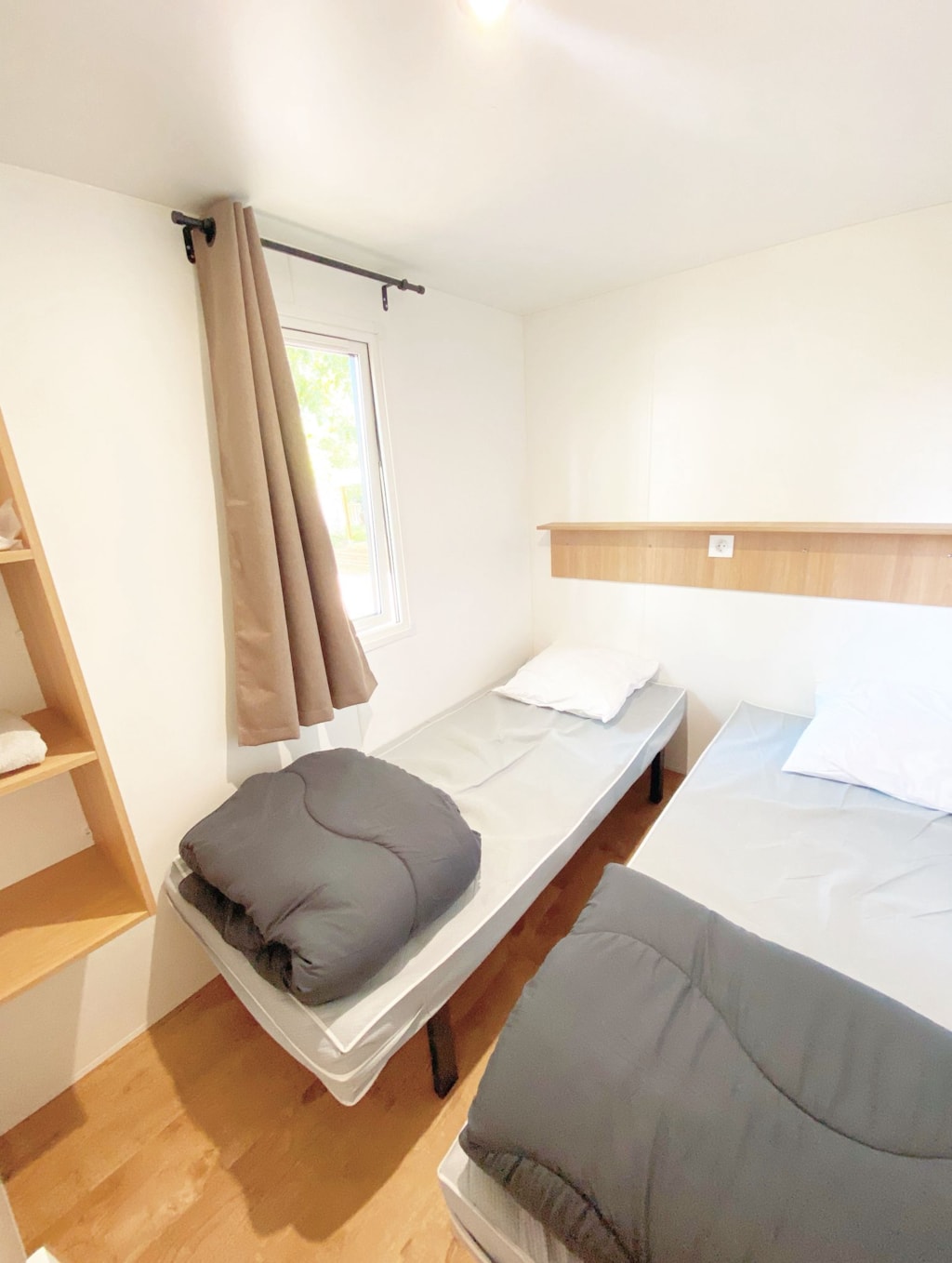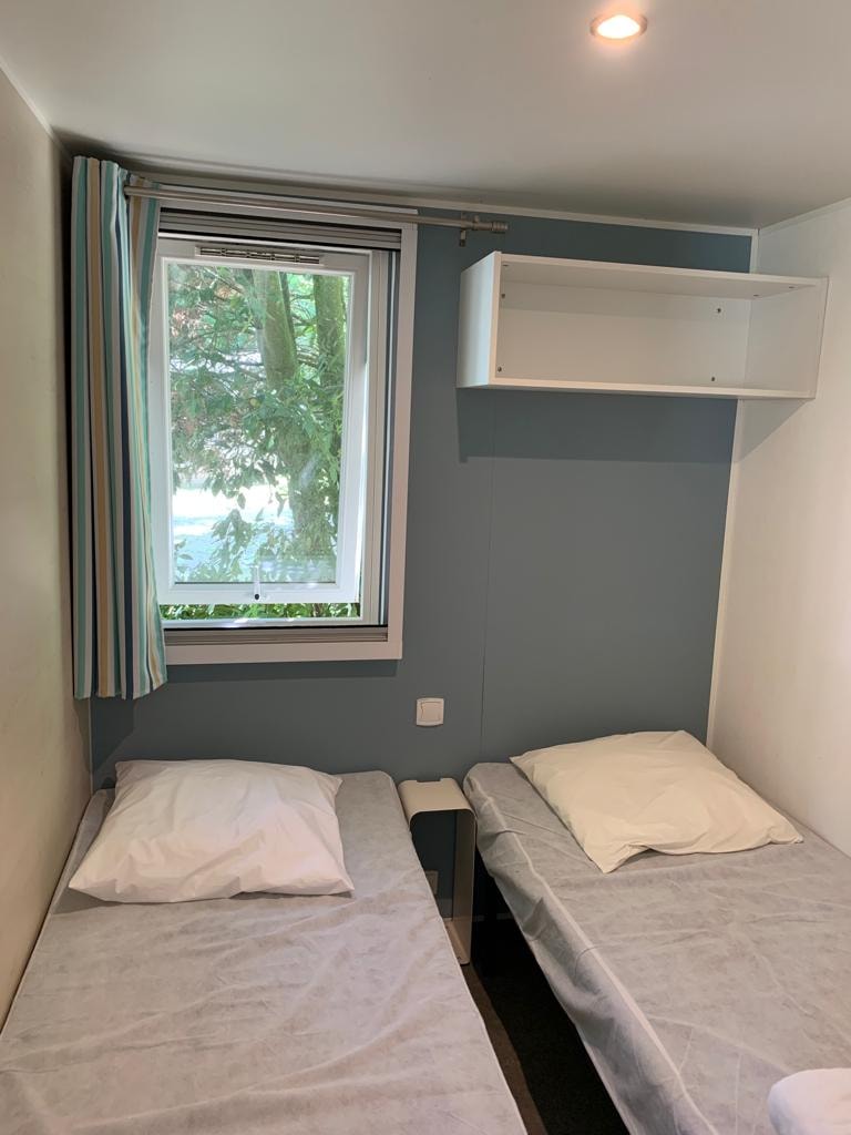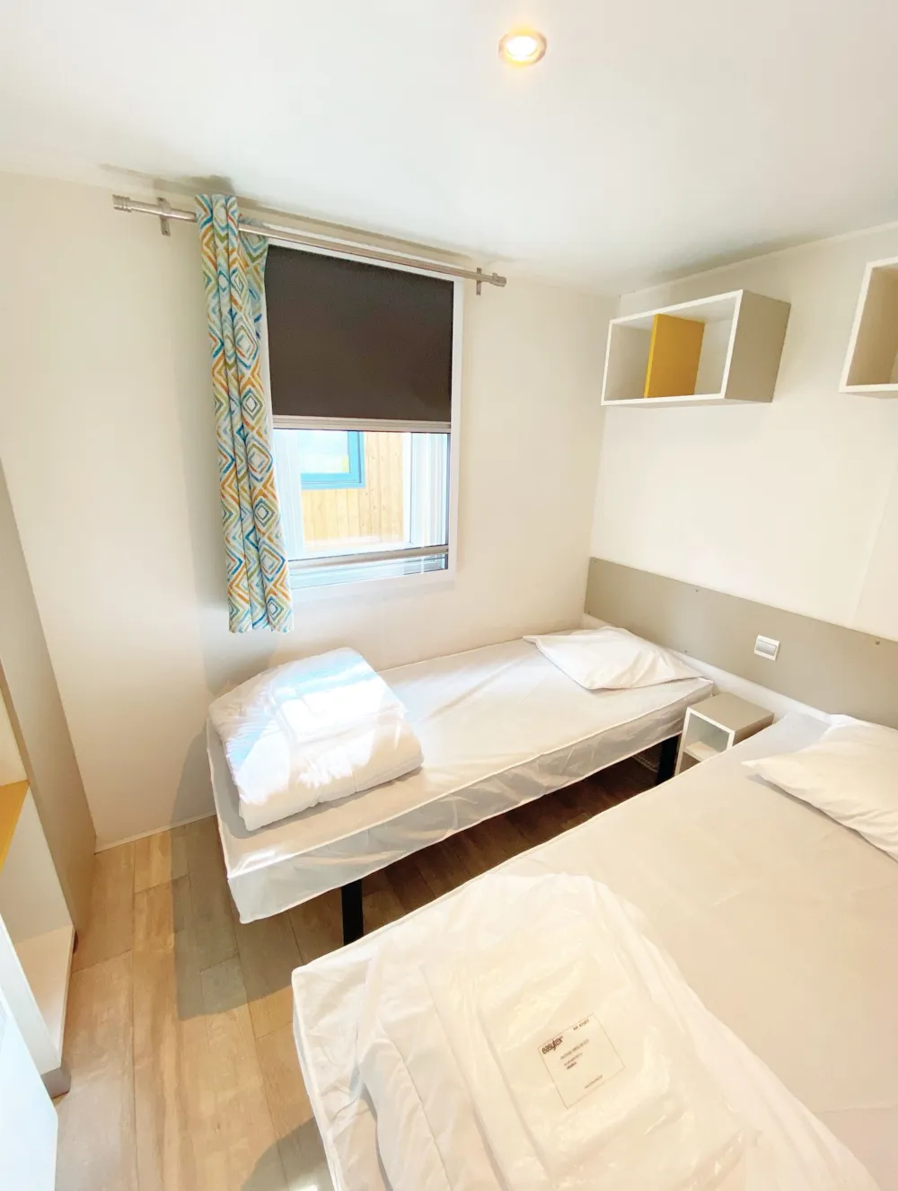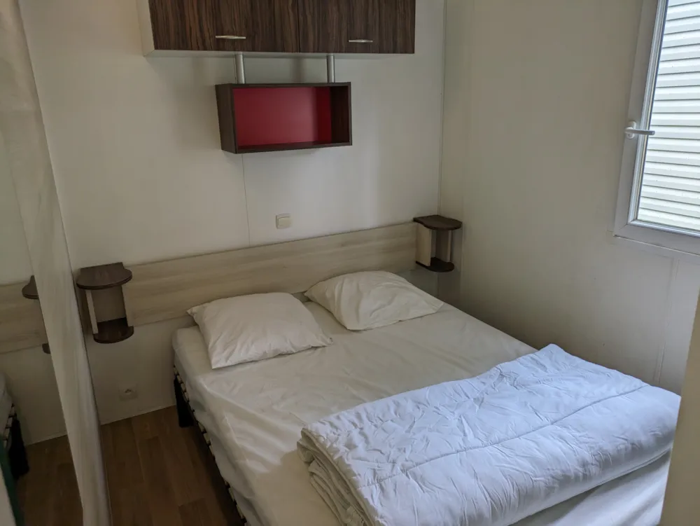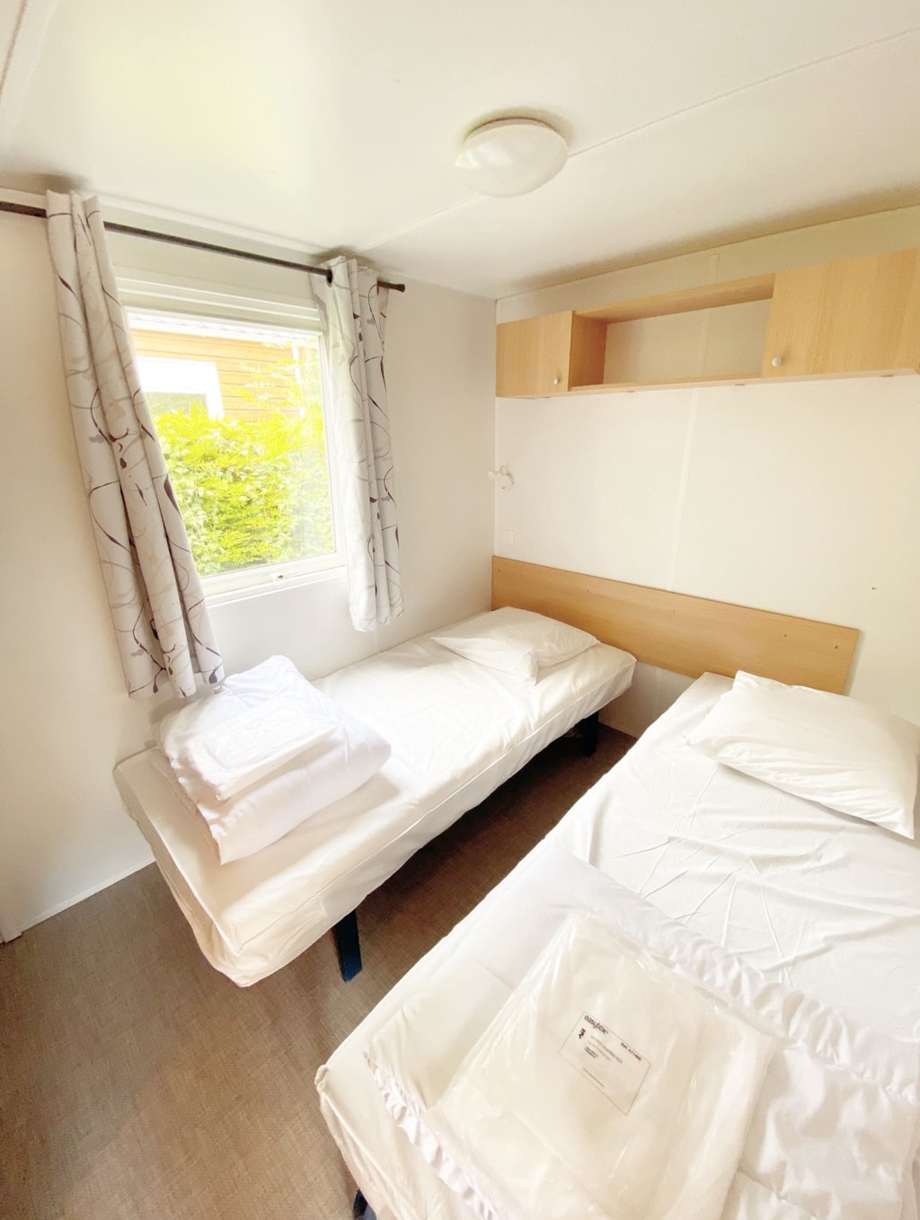 Dieses brandneue Mobilheim ist mit einer hochwertigen, reversiblen Klimaanlage ausgestattet. Es verfügt über zwei Schlafzimmer mit je einem Doppelbett (140 x 190 cm) und zwei weitere Schlafzimmer mit je zwei Einzelbetten (80 x 190 cm), insgesamt also vier Einzelbetten. Zur Ausstattung gehören Kissen, Matratzenschoner und Bettdecken, ein Badezimmer mit Dusche, Waschbecken und WC, ein Wohnbereich mit Kochnische und ein Essbereich mit Sitzbank und Stühlen. Außerdem bietet die Unterkunft einen Flachbildfernseher, Geschirr, Küchenutensilien, eine Mikrowelle, eine Kaffeemaschine, eine Terrasse, Gartenmöbel, Liegestühle, einen Kühlschrank und einen Gaskocher.