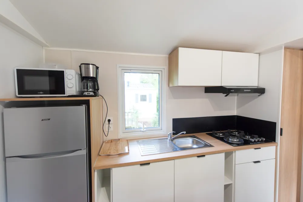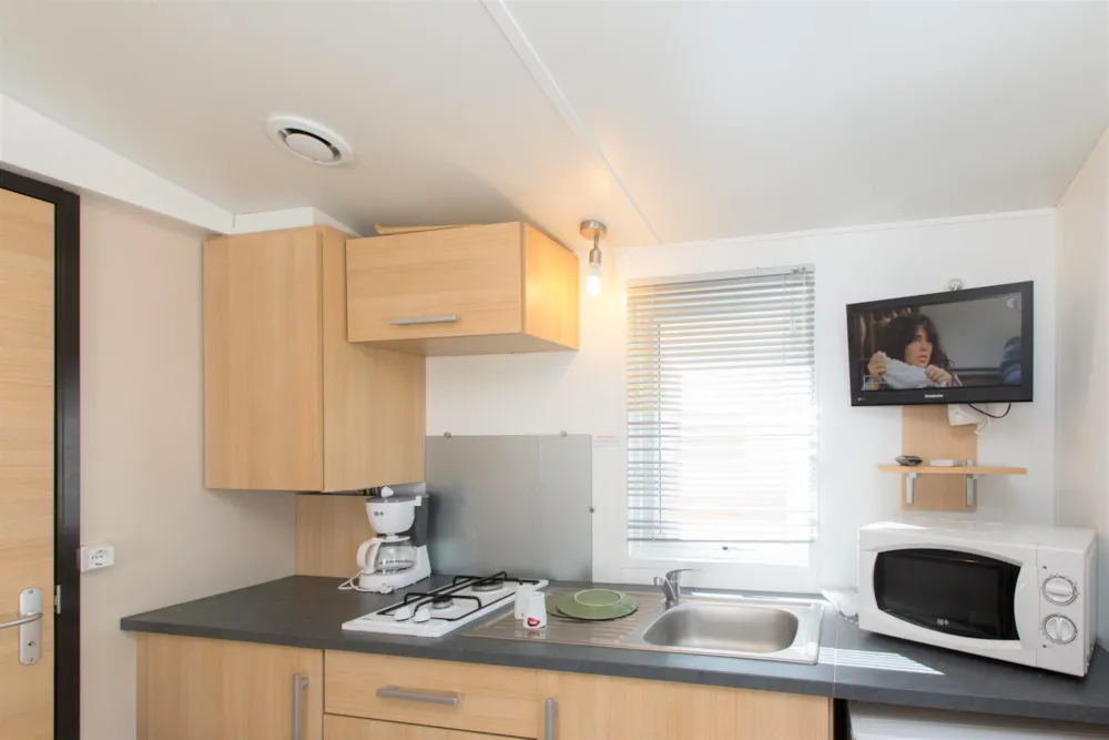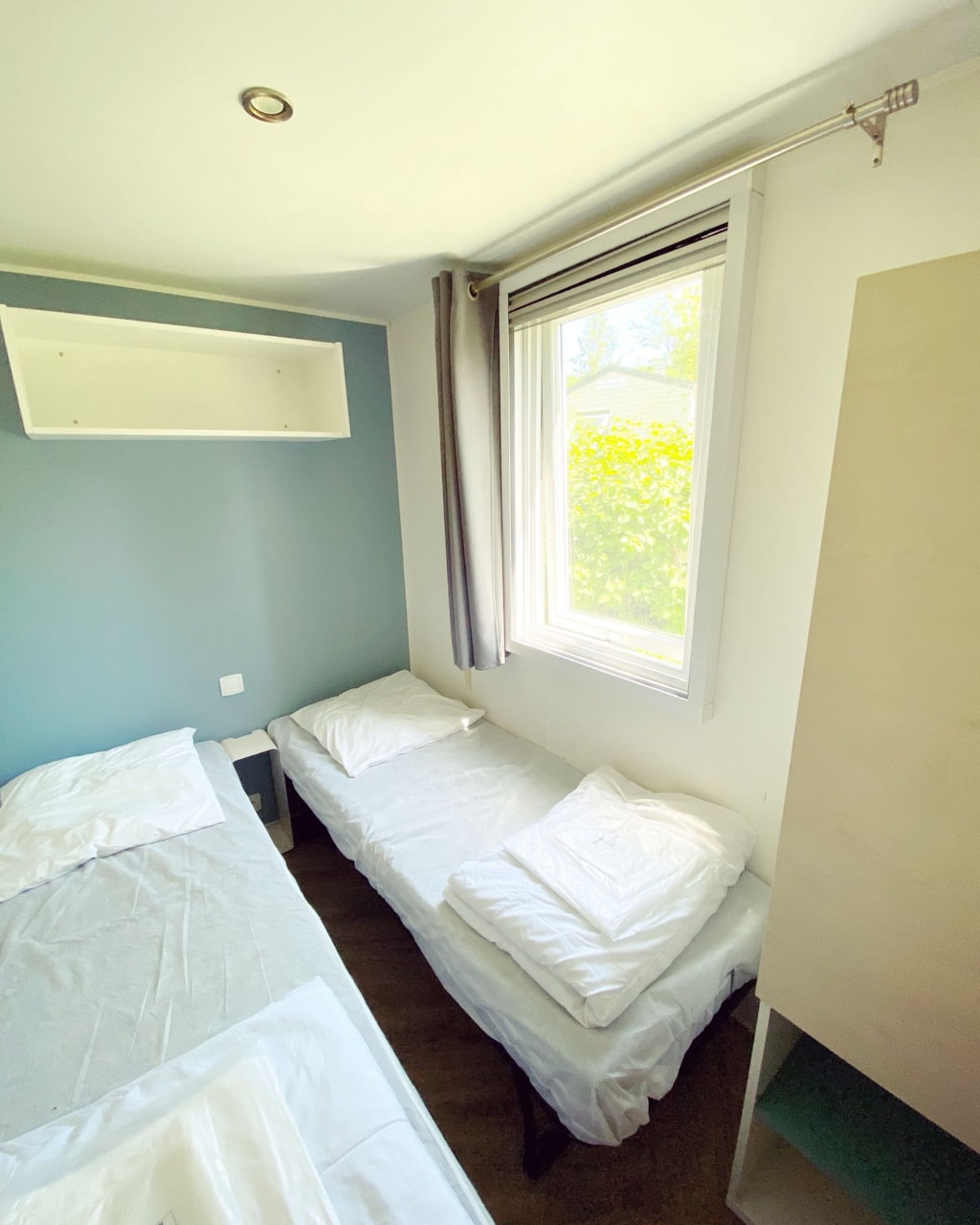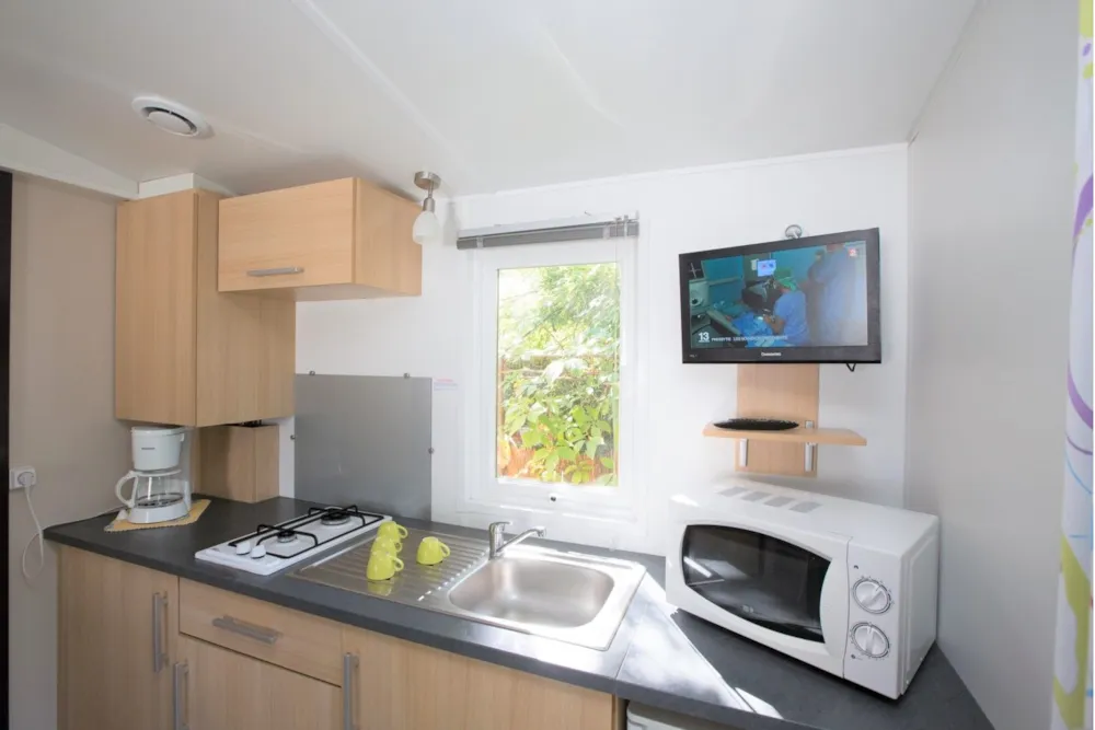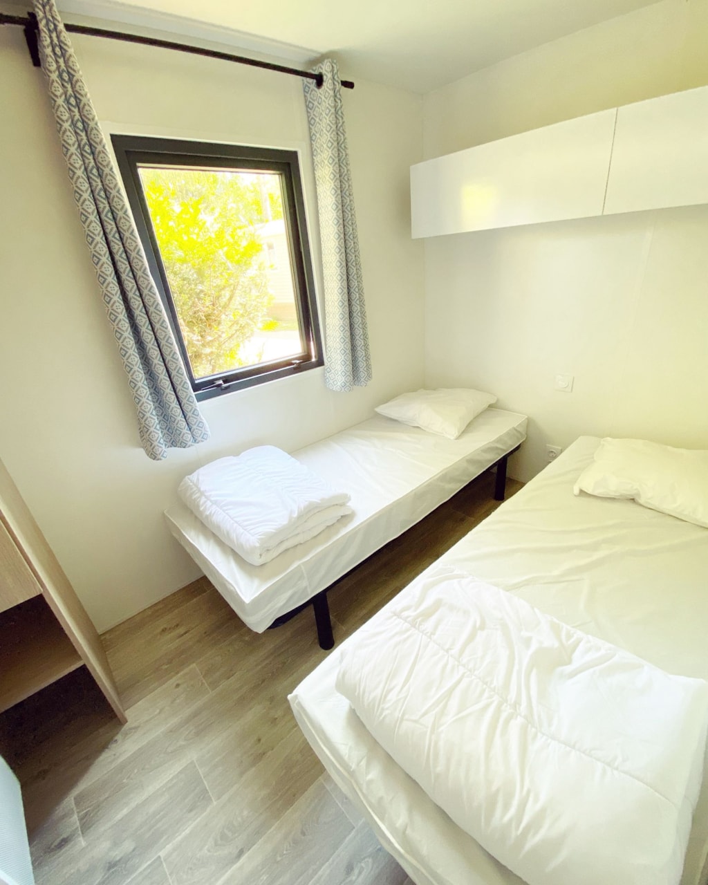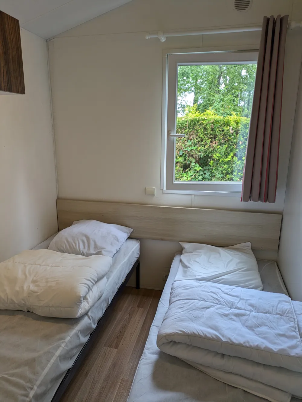 Dieses brandneue Mobilheim ist mit einer hochwertigen, reversiblen Klimaanlage ausgestattet. Es verfügt über zwei Schlafzimmer mit je einem Doppelbett (140 x 190 cm) und zwei weitere Schlafzimmer mit je zwei Einzelbetten (80 x 190 cm), insgesamt also vier Einzelbetten. Zur Ausstattung gehören Kissen, Matratzenschoner und Bettdecken, ein Badezimmer mit Dusche, Waschbecken und WC, ein Wohnbereich mit Kochnische und ein Essbereich mit Sitzbank und Stühlen. Außerdem bietet die Unterkunft einen Flachbildfernseher, Geschirr, Küchenutensilien, eine Mikrowelle, eine Kaffeemaschine, eine Terrasse, Gartenmöbel, Liegestühle, einen Kühlschrank und einen Gaskocher.