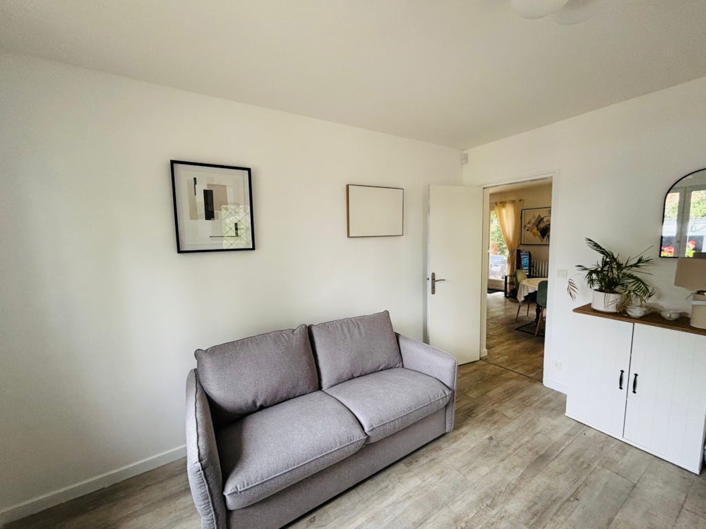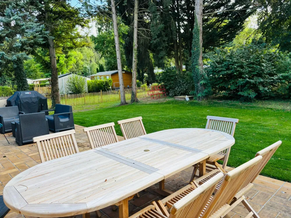 The living room opens onto a private garden and a large terrace with garden furniture and a barbecue.