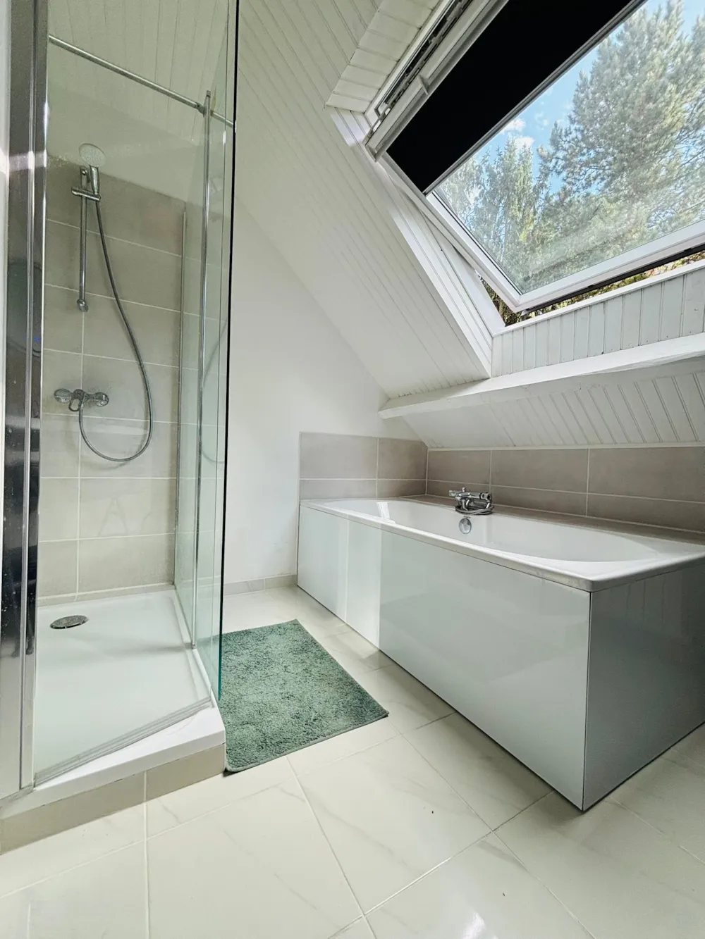 Approximately 200m² with a large living room and dining room, a fully equipped kitchen, two bathrooms with showers (one with a bathtub in addition to the shower), two toilets (ground floor and upper floor) and 14 beds: