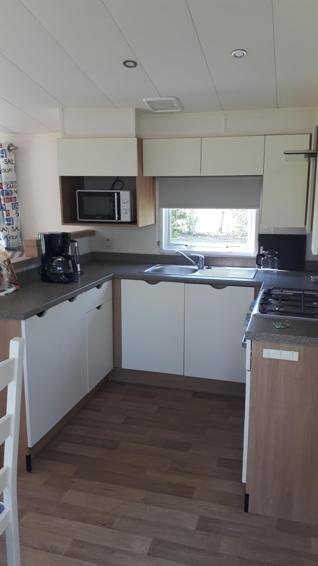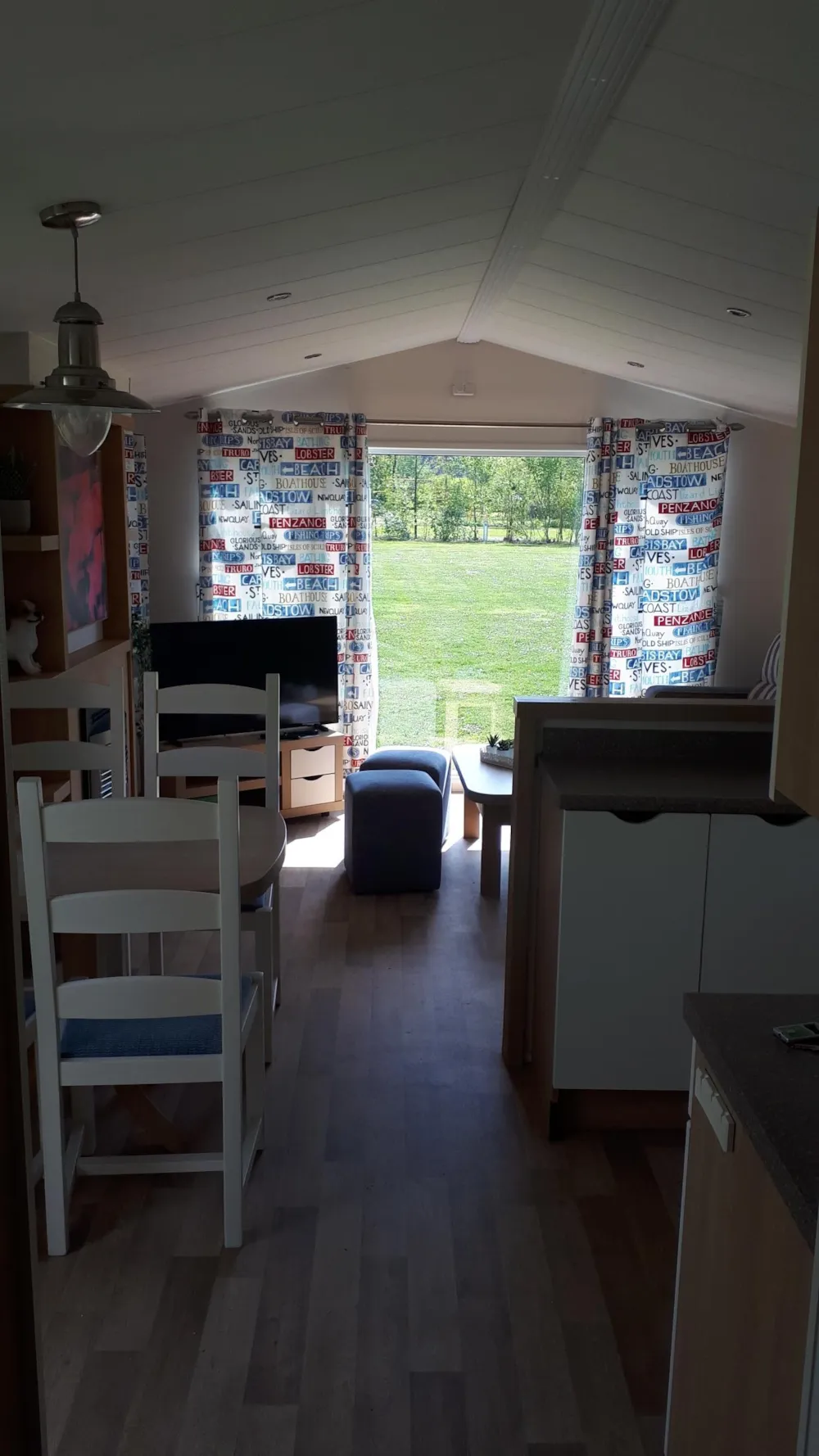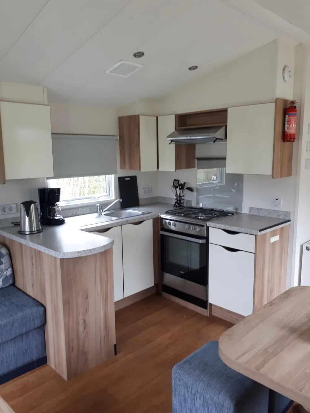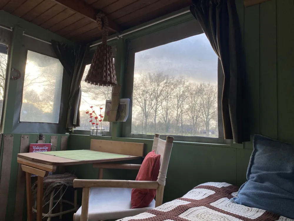 Keukenblokje met inventaris. Televisie met digitenne. Eethoek en tweepersoonsbank. Steigerhouten terras met loungeset.