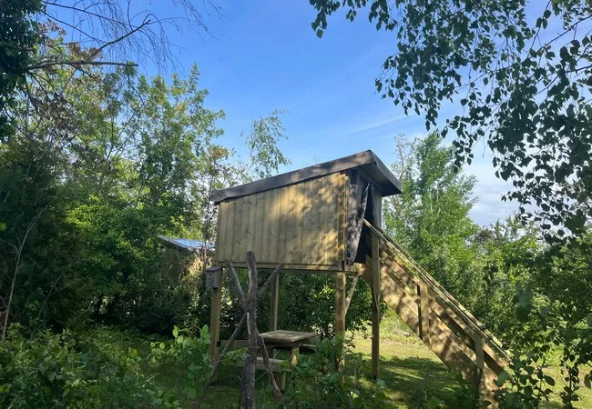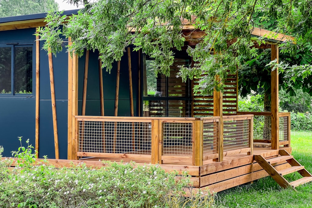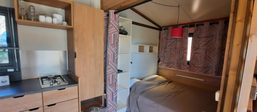 Diese Unterkunft im Stil eines Tiny-House besteht aus einem Holzteil mit einem Schlafzimmer (ein Doppelbett), einer ausgestatteten Küche und sanitären Anlagen sowie einem Leinwandteil mit einem zweiten Schlafzimmer (ein Doppelstockbett und ein Einzelbett).