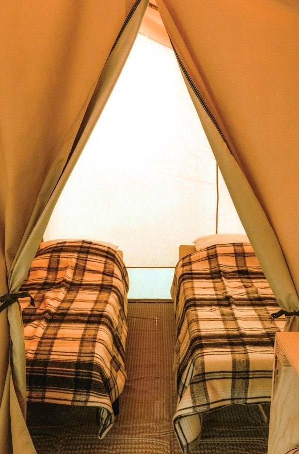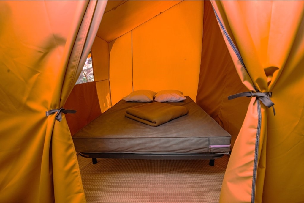 Eine Zeltplane, okay, aber mit einem Holzboden, zwei separaten Schlafzimmern (ein Zimmer mit einem Doppelbett und eines mit zwei Einzelbetten), einer Küche und einer Terrasse für eine komfortable Unterkunft, die der Natur zugewandt ist und sich schön in die umgebende Umgebung einfügt. Diese Unterkunft verfügt über keine Sanitäranlagen (Gemeinschaftssanitäranlagen des Campingplatzes).