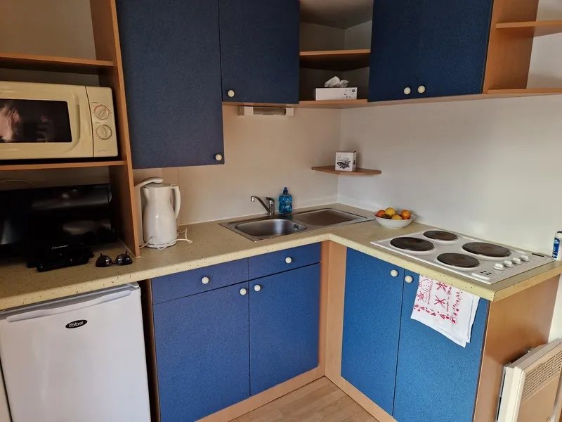 1 großer Kühlschrank, Spüle, 4-Flammen-Gasherd, Mikrowelle, Filterkaffeemaschine (Größe 4), Geschirr, Tisch, Stühle.