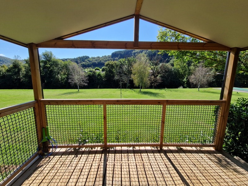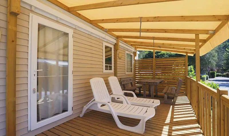 Überdachte Terrasse und 1 Holzgartenlounge.
