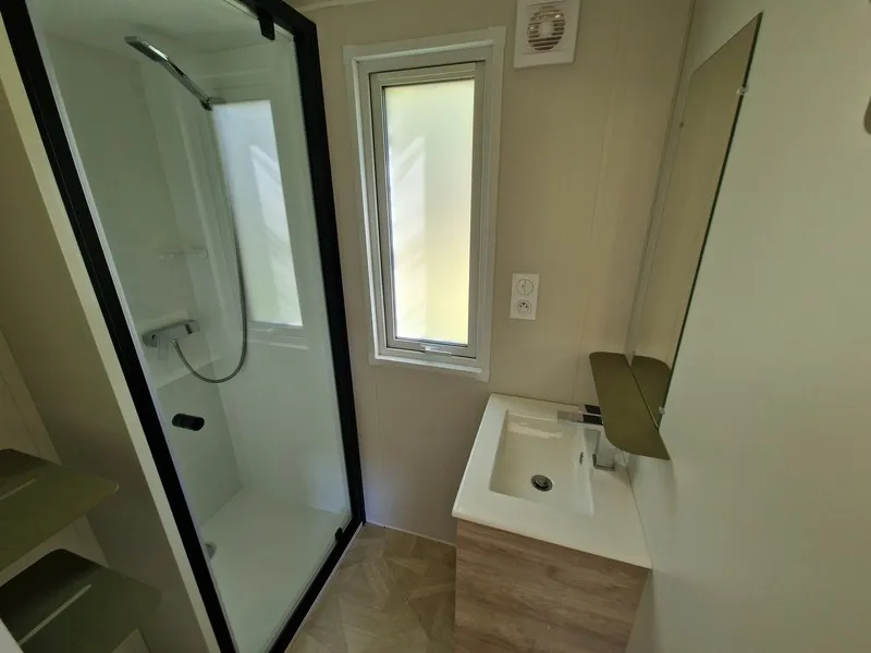 1 Badezimmer mit Dusche, Waschbecken, separates WC.