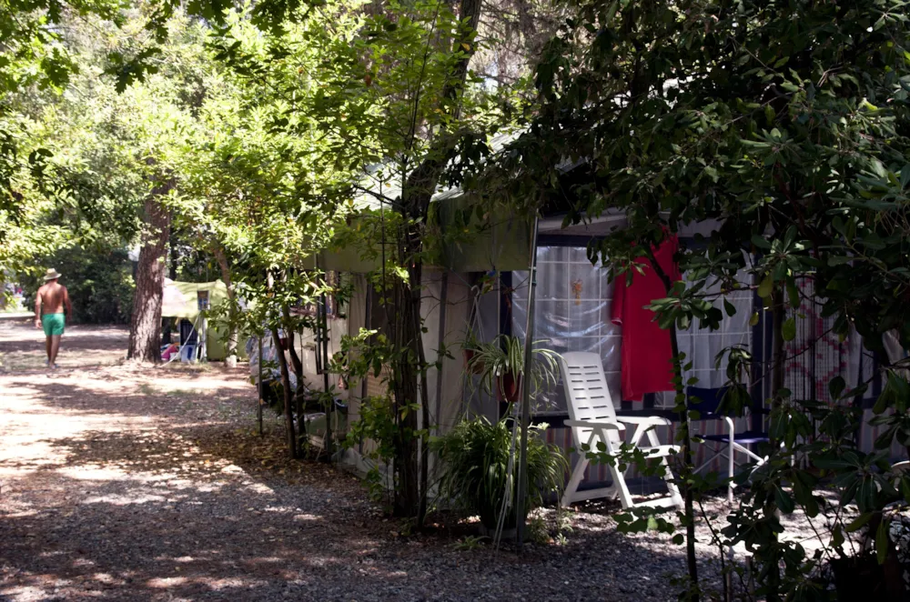 Stellplätze sind durch Büsche und Sträucher getrennt. Der Boden ist eben und gut befestigt. Fast alle Stellplätze liegen im angenehmen Halbschatten.