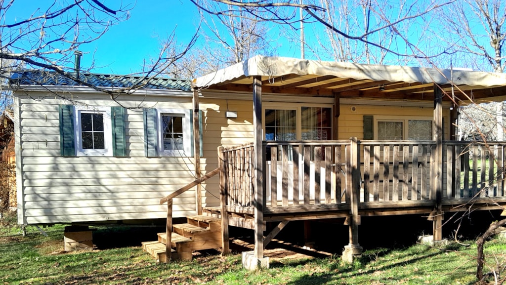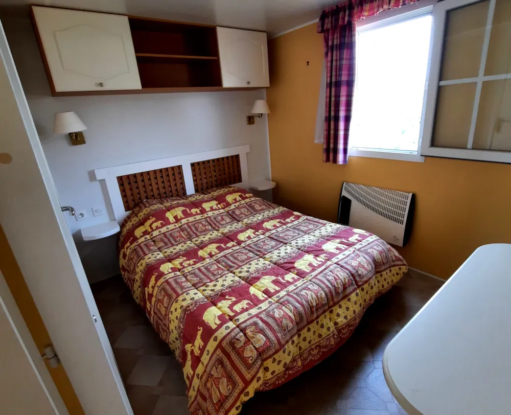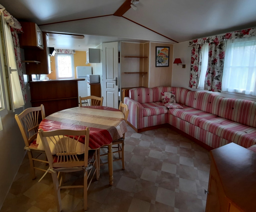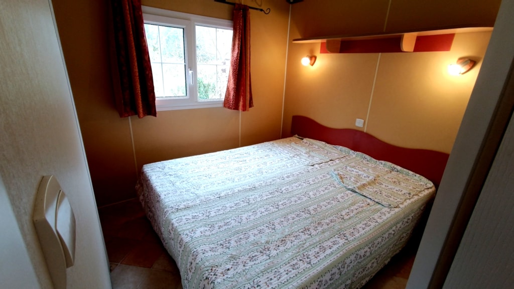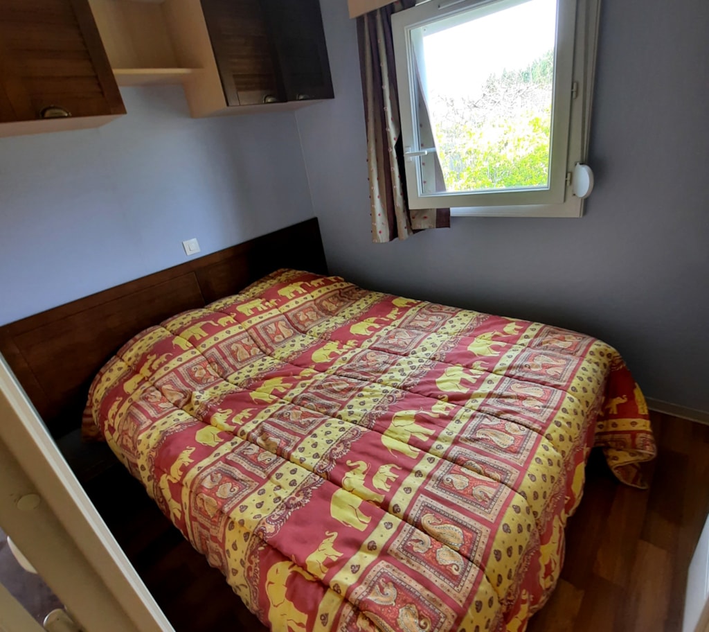 Sehr großes Mobile-Haus von 35 m²: Bettwäsche, Bettbezug, Kissenköpfe, Kissenbezugschutz und Matratzenschoner für 1 Doppelbett sowie 2 Badetücher, 2 Handtücher, Geschirrtücher sind im Mietpreis bei Champ enthalten de Guiral.
