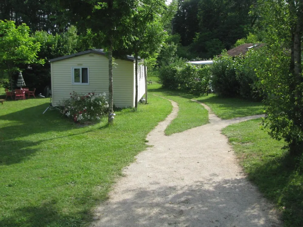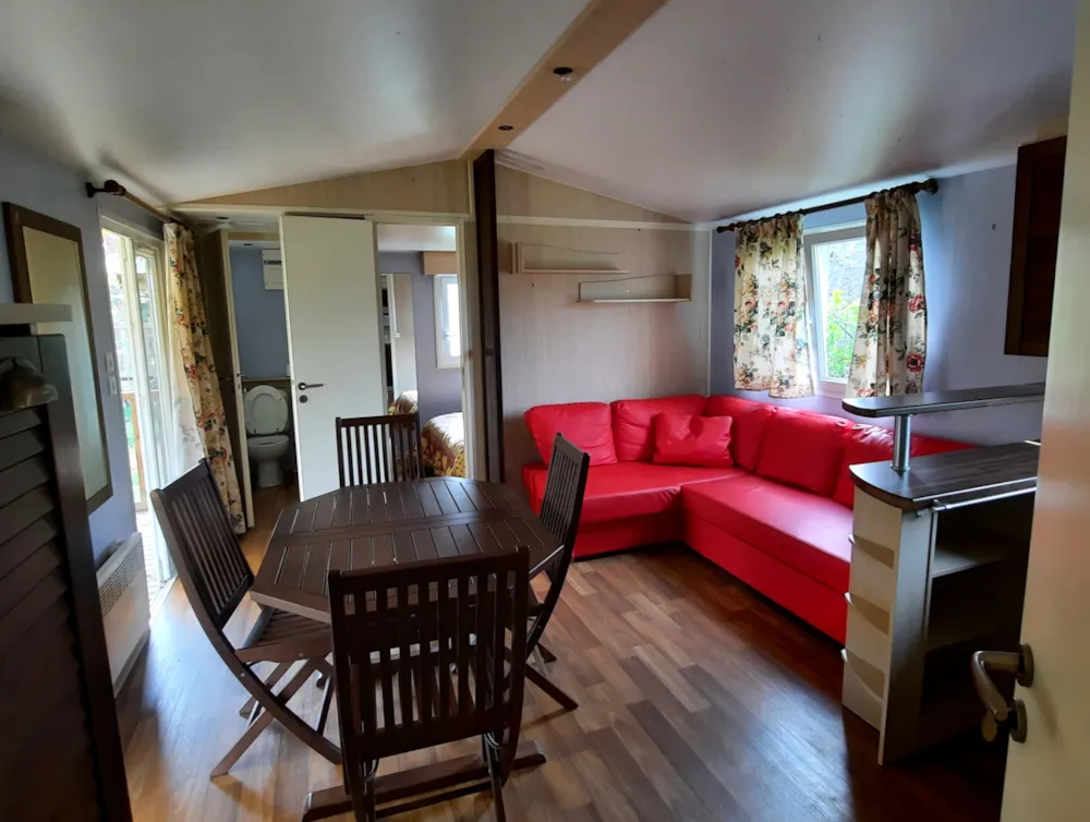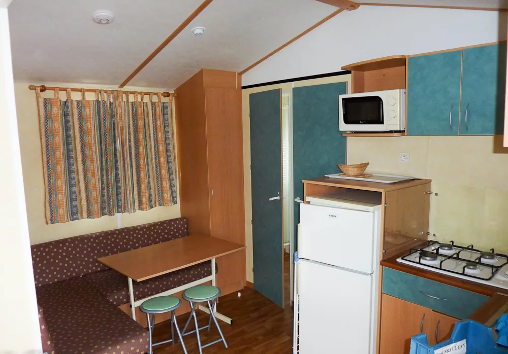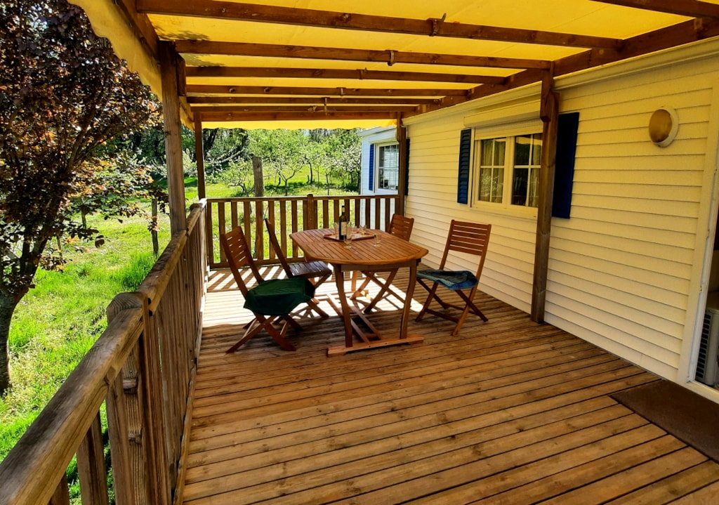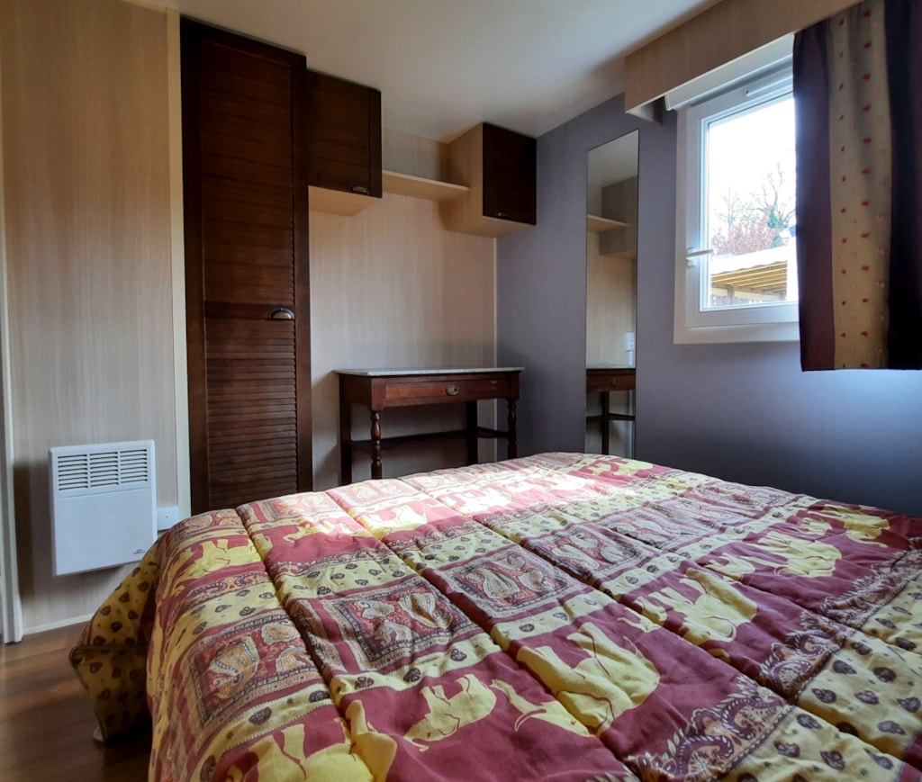 Sehr großes Mobile-Haus von 35 m²: Bettwäsche, Bettbezug, Kissenköpfe, Kissenbezugschutz und Matratzenschoner für 1 Doppelbett sowie 2 Badetücher, 2 Handtücher, Geschirrtücher sind im Mietpreis bei Champ enthalten de Guiral.