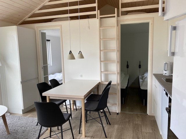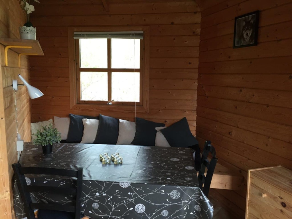 Die Hütten verfügen über einen gemütlichen Wohnraum mit Küche und Essbereich, eine Luft-Luft-Wärmepumpe sowie ein eigenes WLAN-Netzwerk. Es gibt zwei Schlafzimmer – eines mit Doppelbett und eines mit Etagenbett. Zusätzlich gibt es zwei Schlafböden: einen über den Schlafzimmern und einen weiteren über dem Badezimmer und Eingangsbereich.