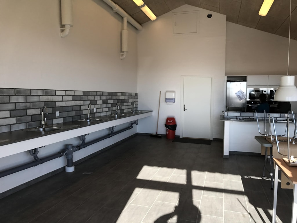 Das Badezimmer ist mit Toilette und Waschbecken ausgestattet. Zwar gibt es keine Dusche in der Hütte, jedoch steht warmes Wasser zur Verfügung, und im Servicegebäude finden Sie kostenlose Duschen mit reichlich warmem Wasser, die rund um die Uhr genutzt werden können.